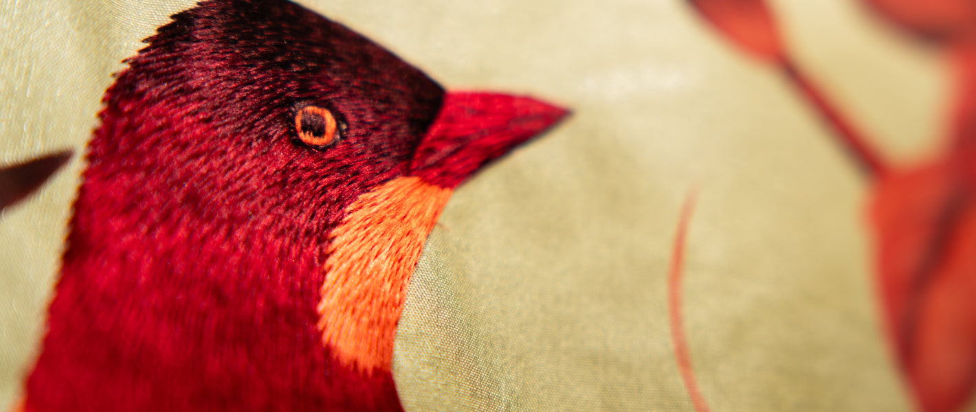 Short Film: An exclusive view of Reed's iconic look and our densely embroidered silk panels side-by-side, in an immersive installation, suspended from overhead, offering a dynamic interaction with our work.