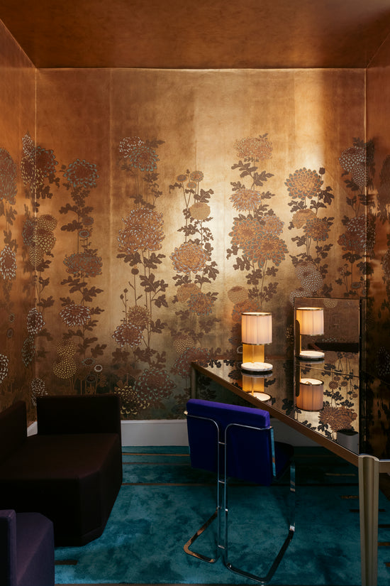 Sophisticated, graphic, and highly decorative gold wallcovering, Kiku Garden is inspired by Japanese art and Europe’s enduring fascination with it. Similar to our Kiku wallcovering—with boldly rendered chrysanthemums, the block colouring—but forgoes the crisp, screen-printed borders of the original.
