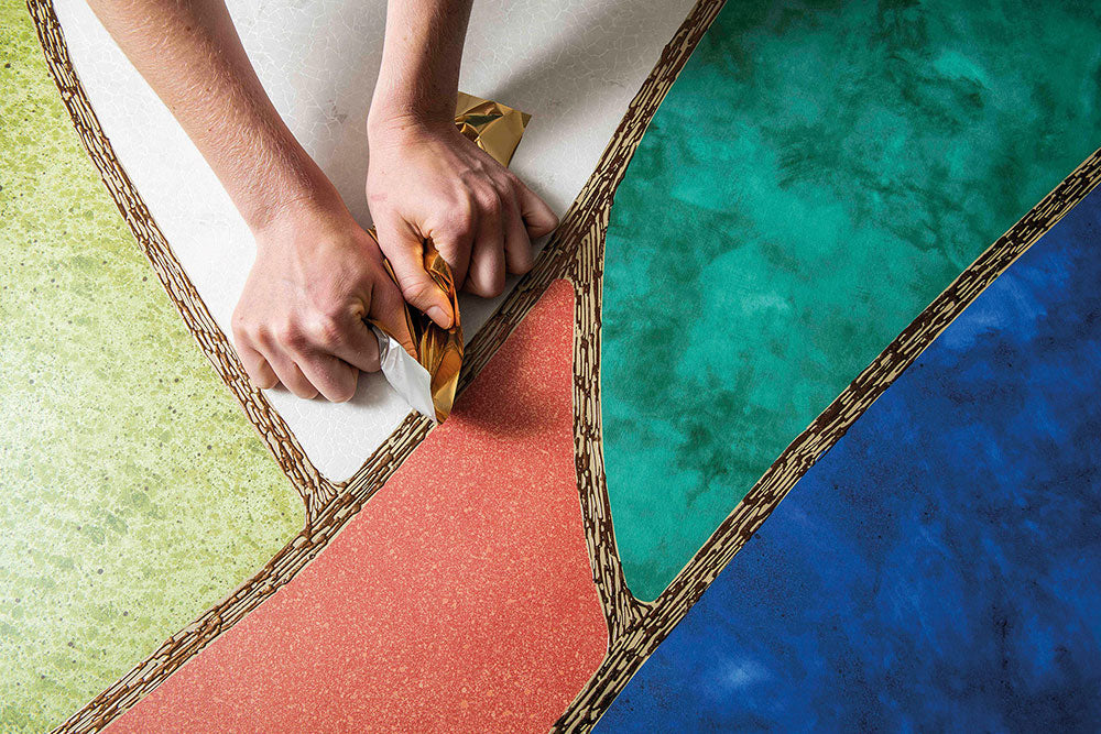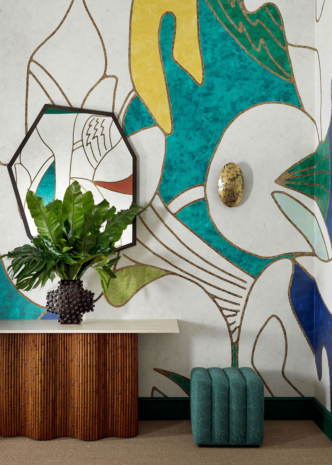 For Ambia’s founding colorway, Vedado, Miyar sampled La Jungla’s deep and vibrant turquoise, blue, and green shades to embody the Caribbean palette of both Cuba and Miami, her hometown, creating a design that transforms the geometries found within the Lam painting.