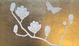 Hand-painted, delicate butterflies and birds flutter effortlessly among the minimalist trees.