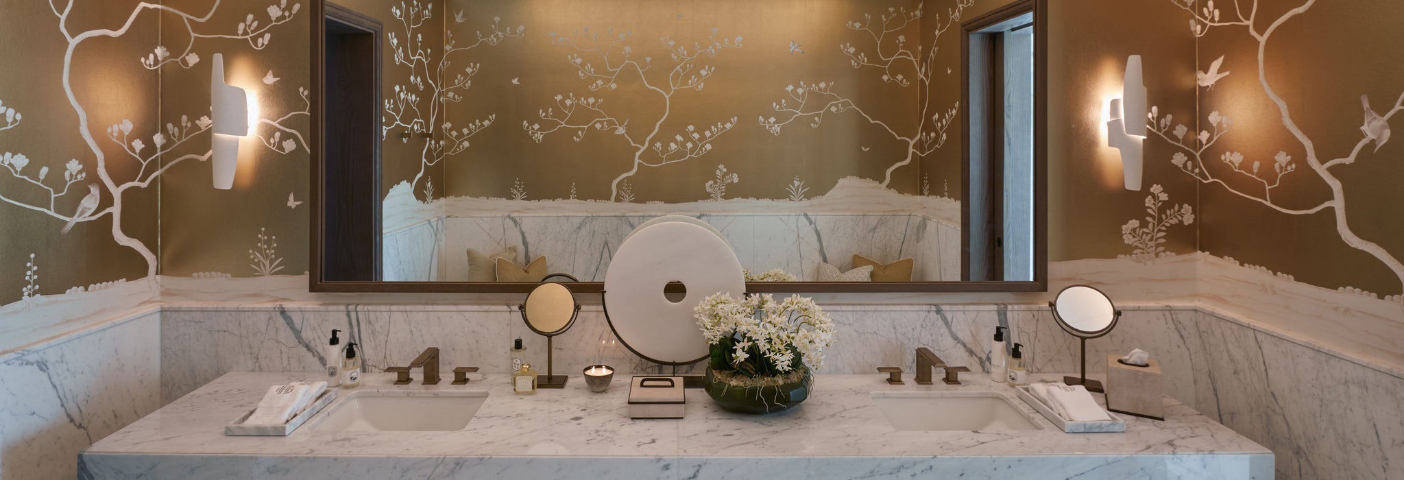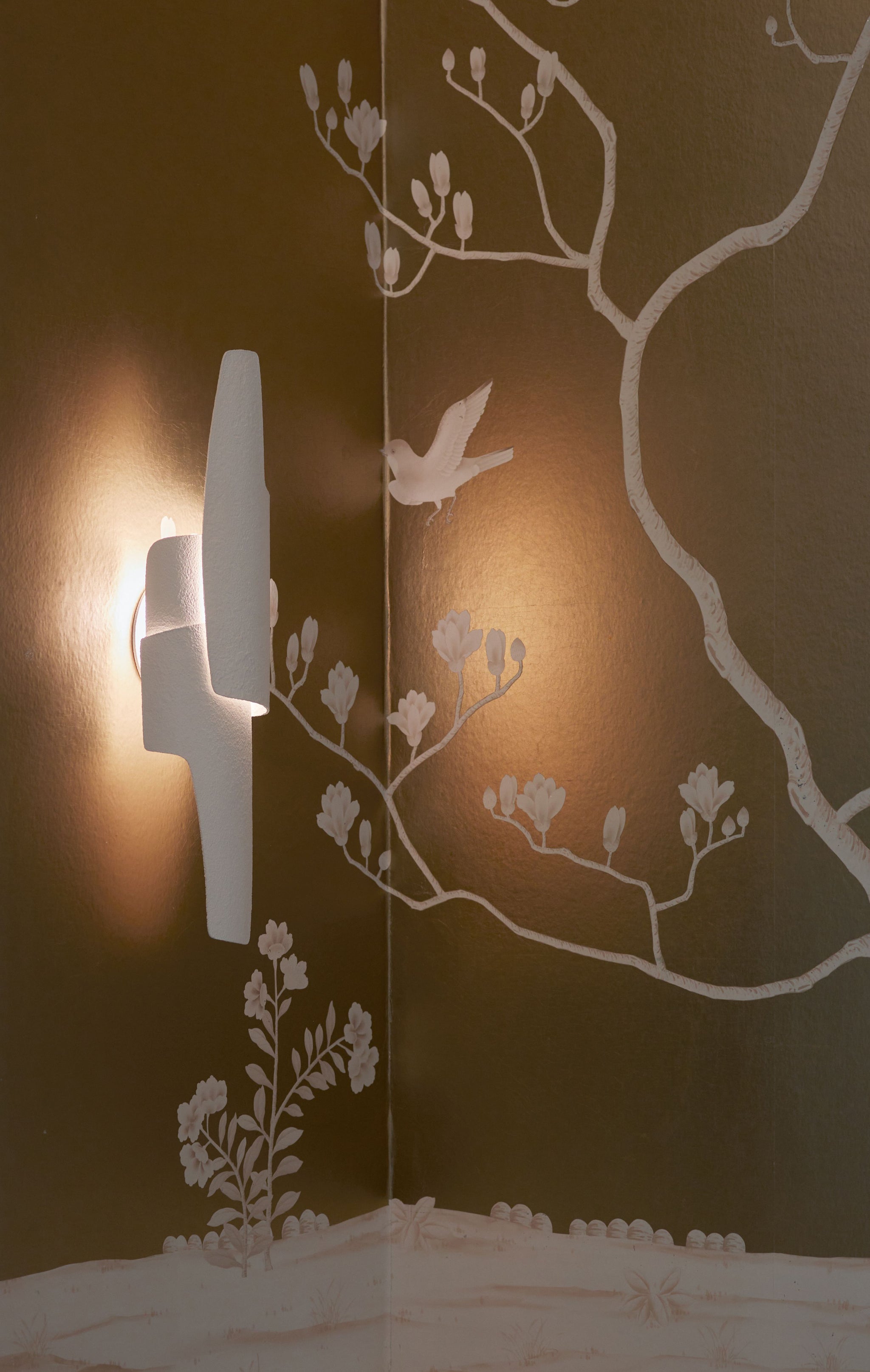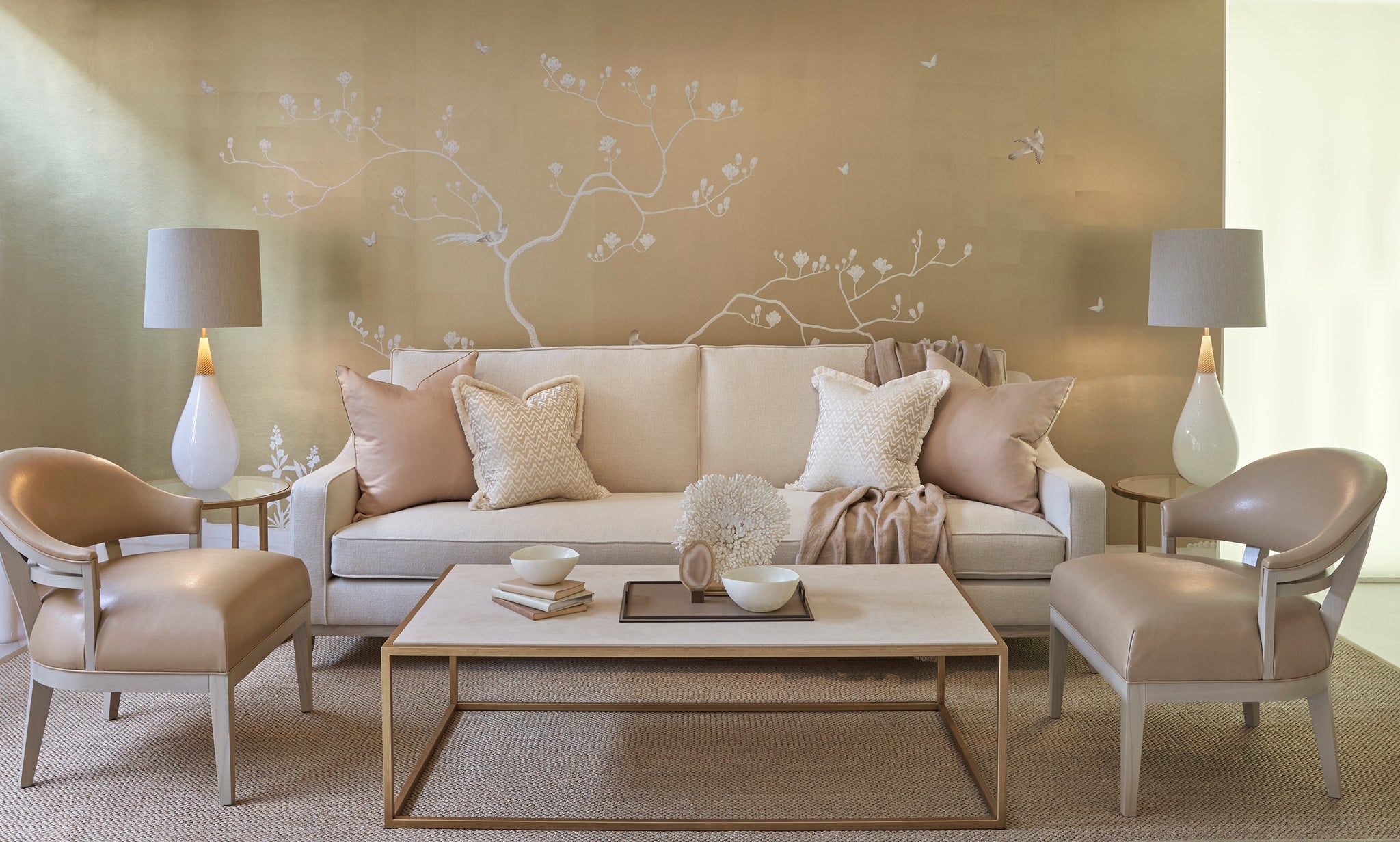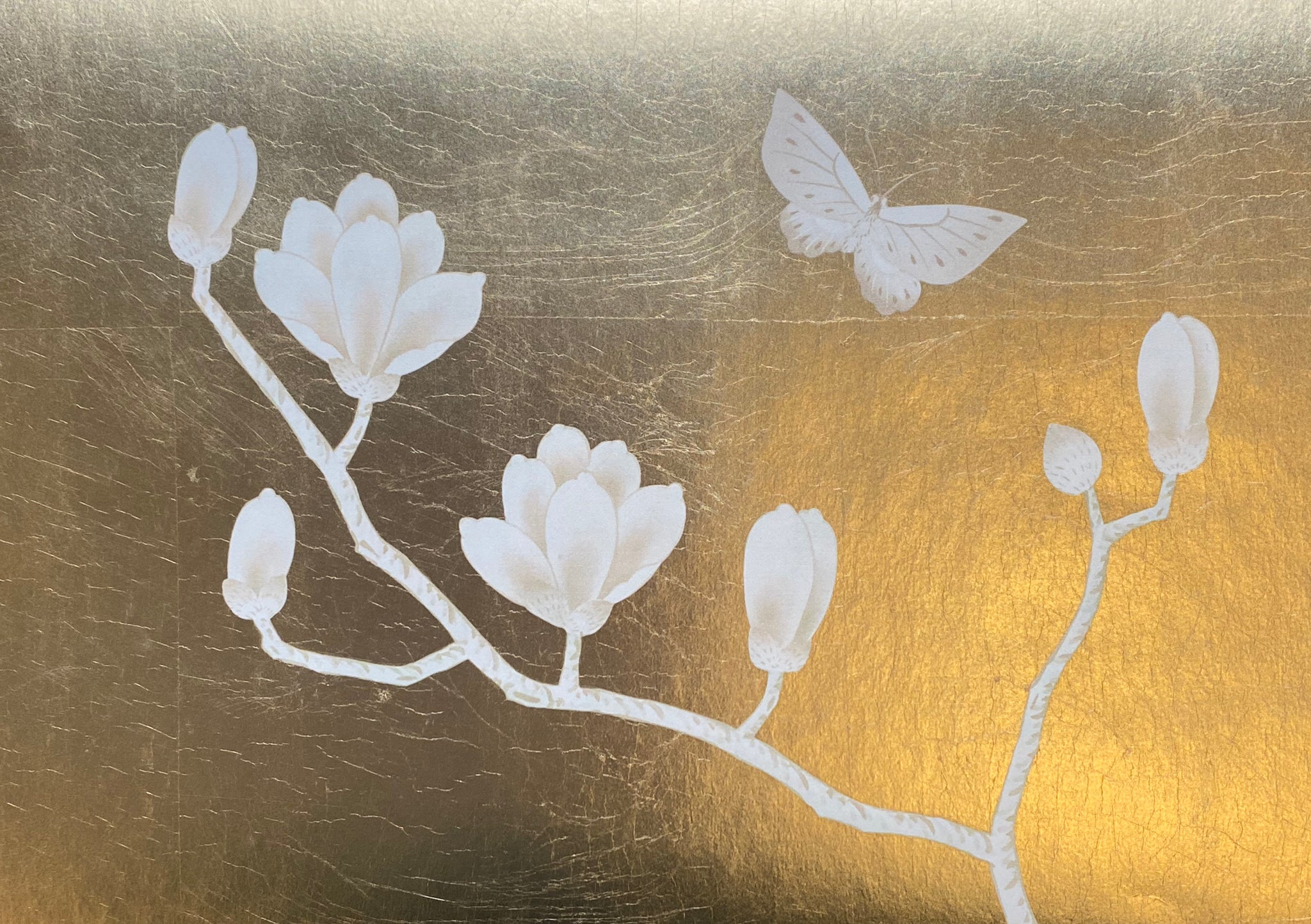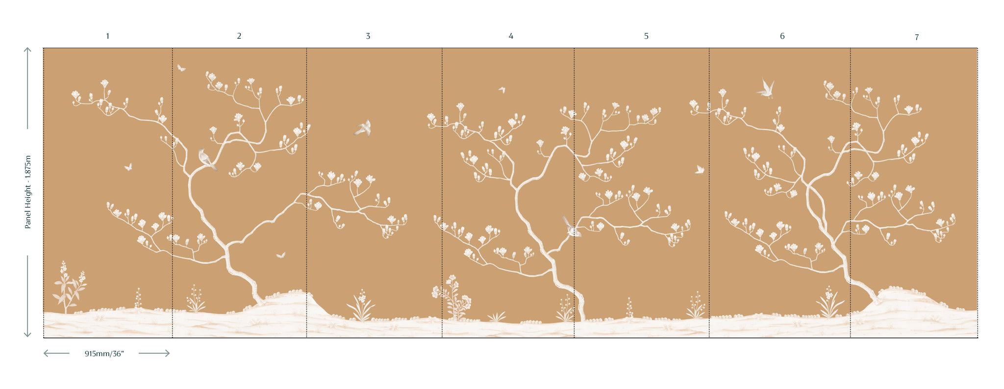Ava has a feminine, romantic feel, and its open layout makes it very flexible. It is the perfect choice for a subtle and elegant backdrop in any room. Delicate butterflies and birds flutter effortlessly among the minimalist trees, printed onto our gilded paper for an opulent finish.