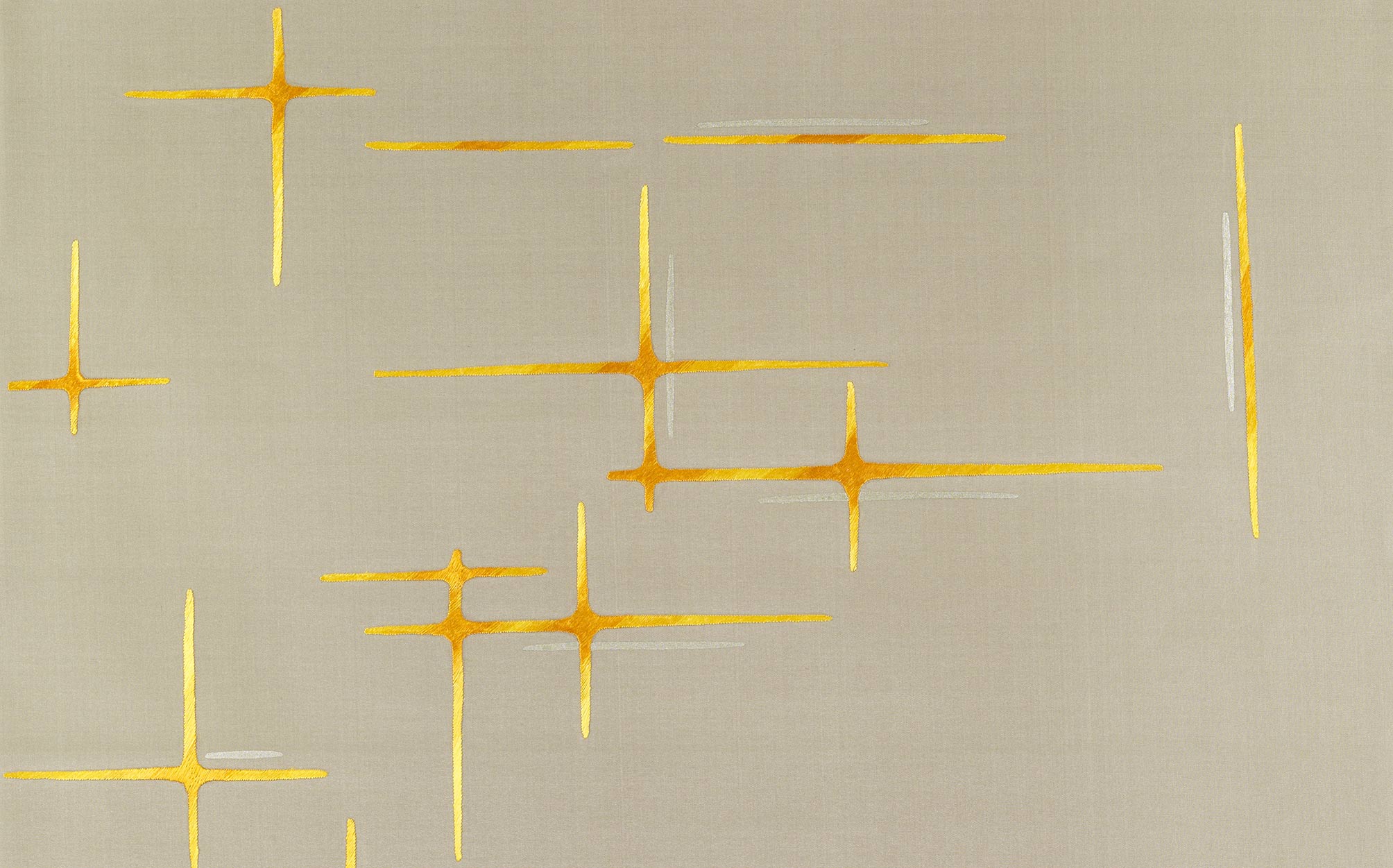 Cauchy’s gold and bright yellow embroidery contrasts wonderfully with its cool, Steel Silk background and painted platinum detailing.
