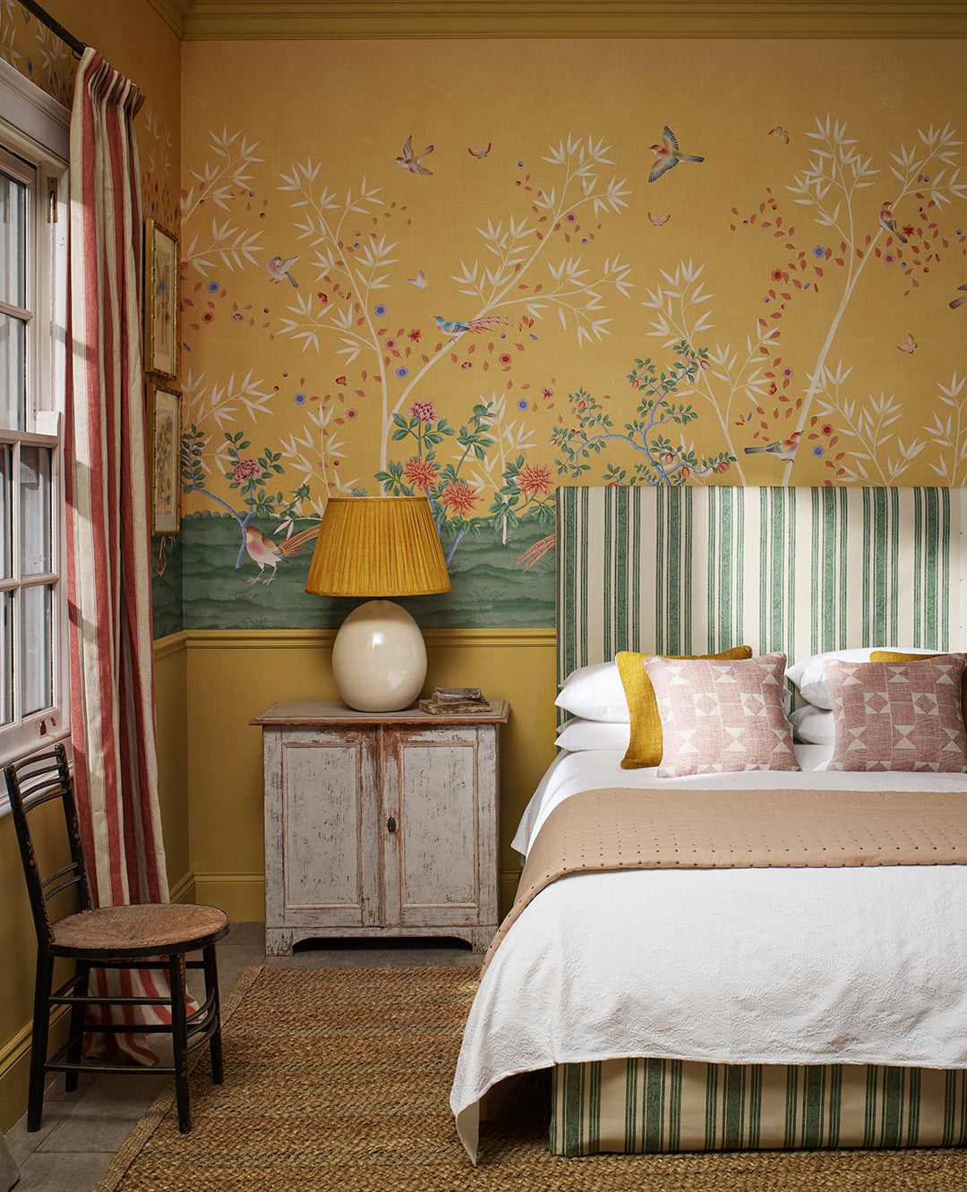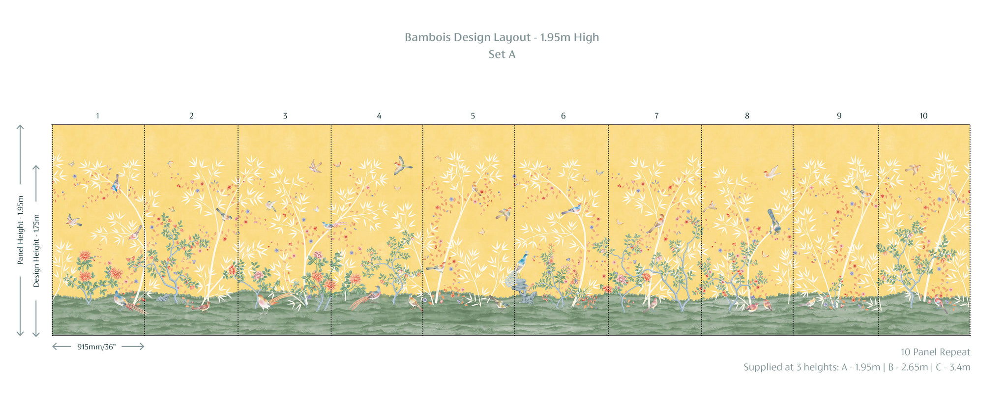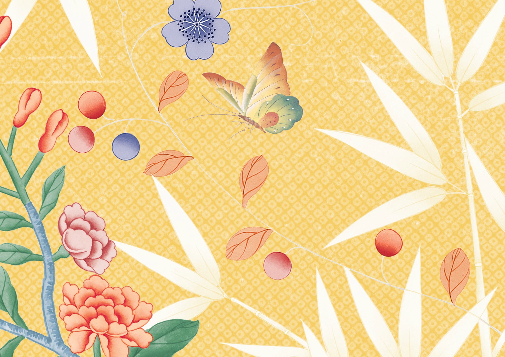 A modern and fresh chinoiserie based around a bamboo garden with winding climbers, peonies, birds and butterflies. Equally suited to a clean, bright palette or an elegant muted monochrome.