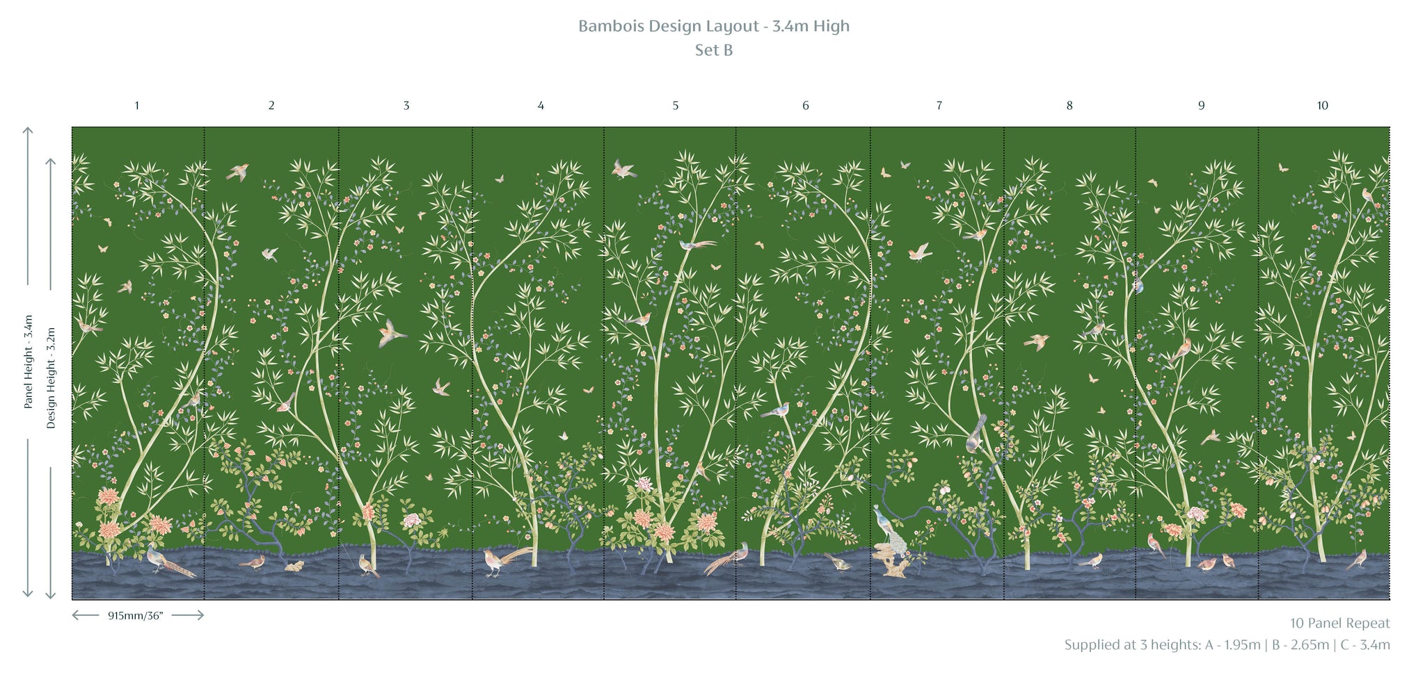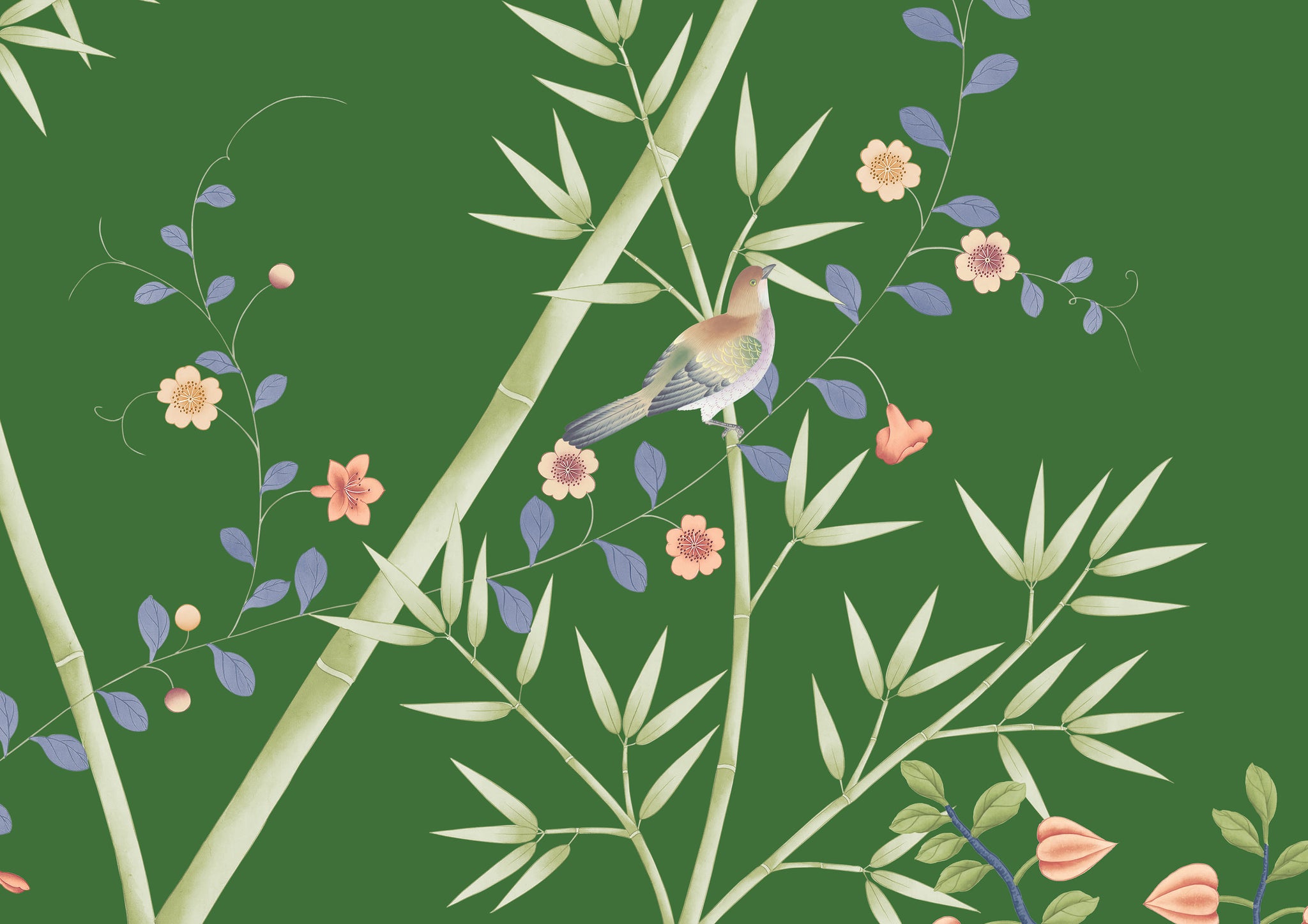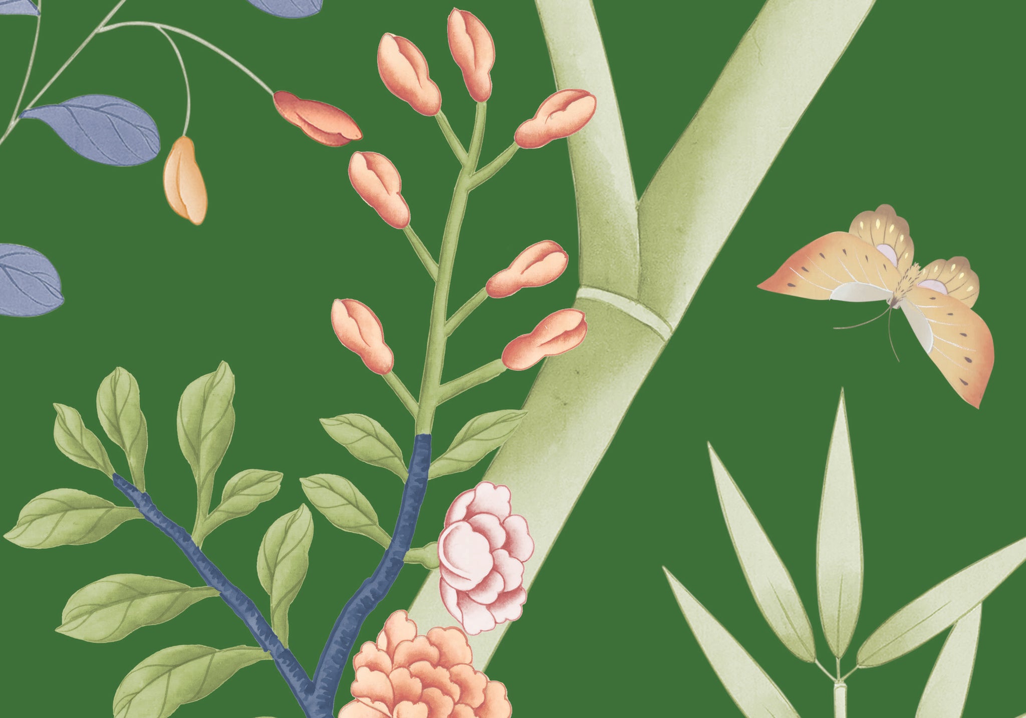 A modern and fresh chinoiserie based around a bamboo garden with winding climbers, peonies, birds and butterflies. Equally suited to a clean, bright palette or an elegant muted monochrome.