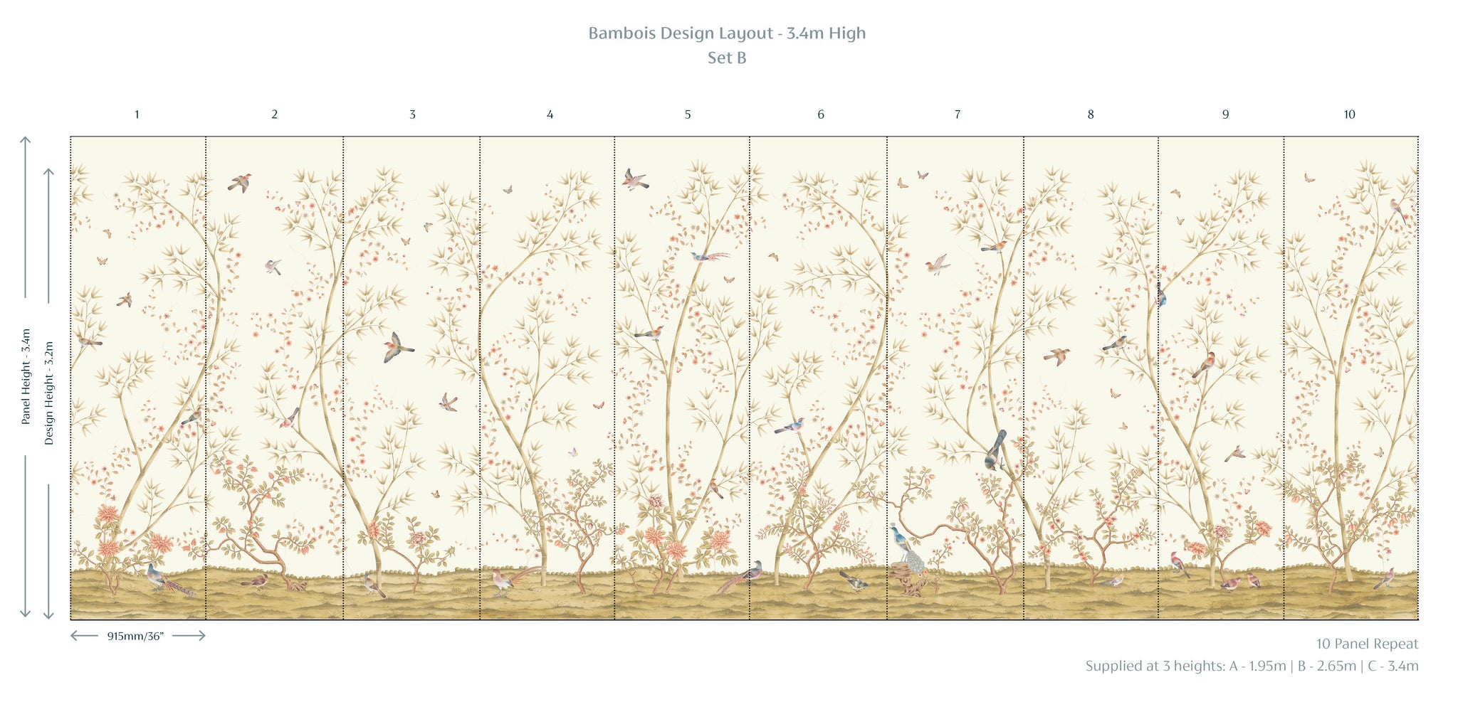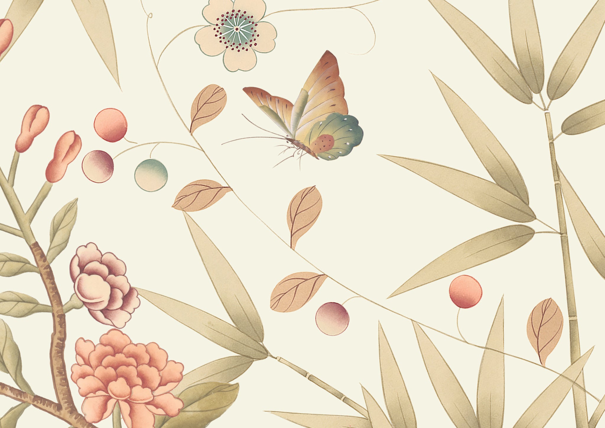 A modern and fresh chinoiserie based around a bamboo garden with winding climbers, peonies, birds and butterflies. Equally suited to a clean, bright palette or an elegant muted monochrome.