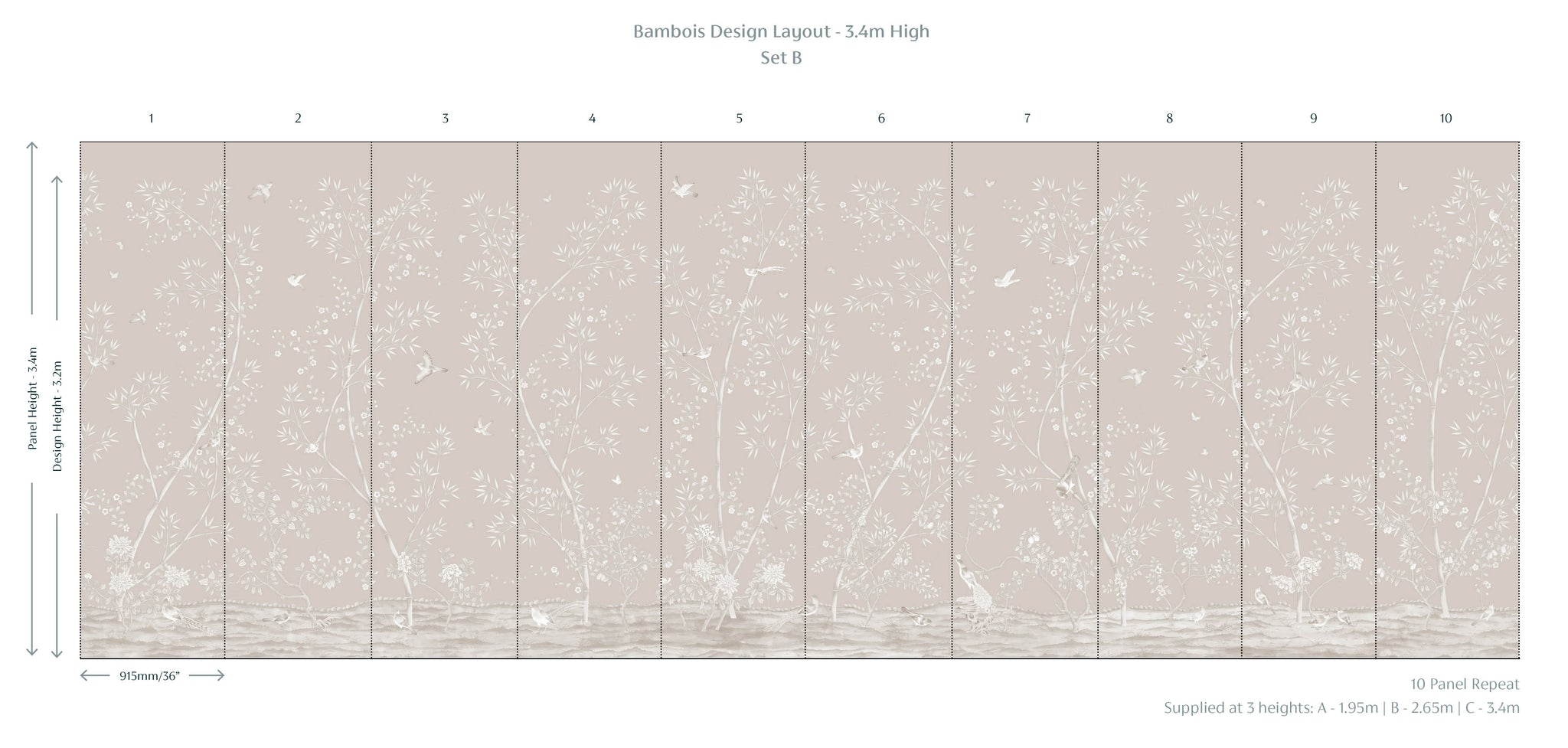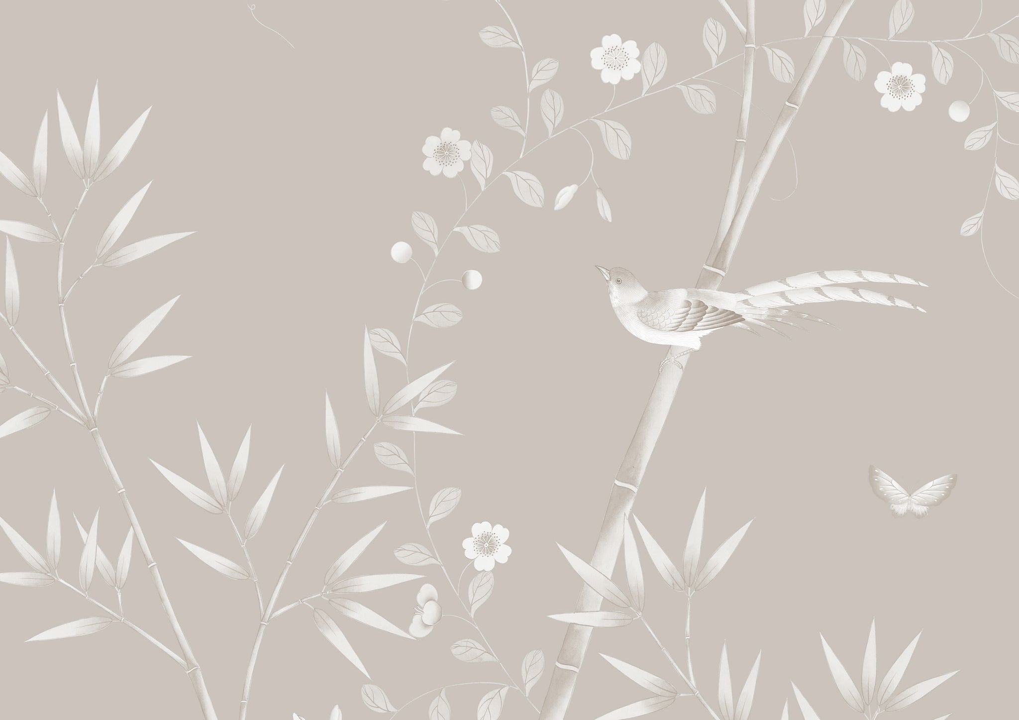 A modern and fresh chinoiserie based around a bamboo garden with winding climbers, peonies, birds and butterflies. Equally suited to a clean, bright palette or an elegant muted monochrome.