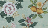 An antiqued turquoise tea paper background is our canvas for a naturalistic palette of vibrant tones that bring a grove of fruit and blossom trees to life. Grand, Chinese birds stretch across the chinoiserie scenic as typical of the 1700s style, to which this design pays homage.