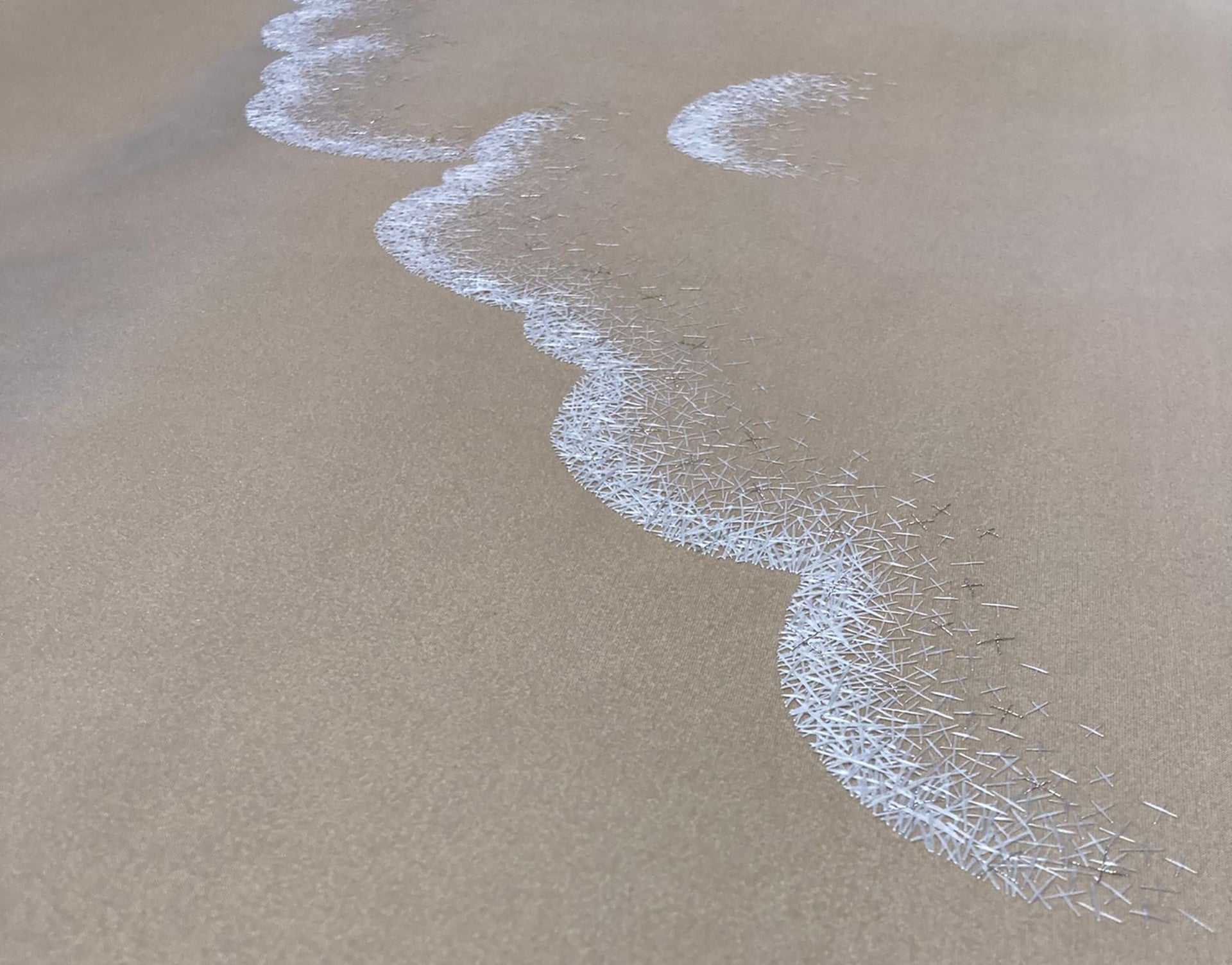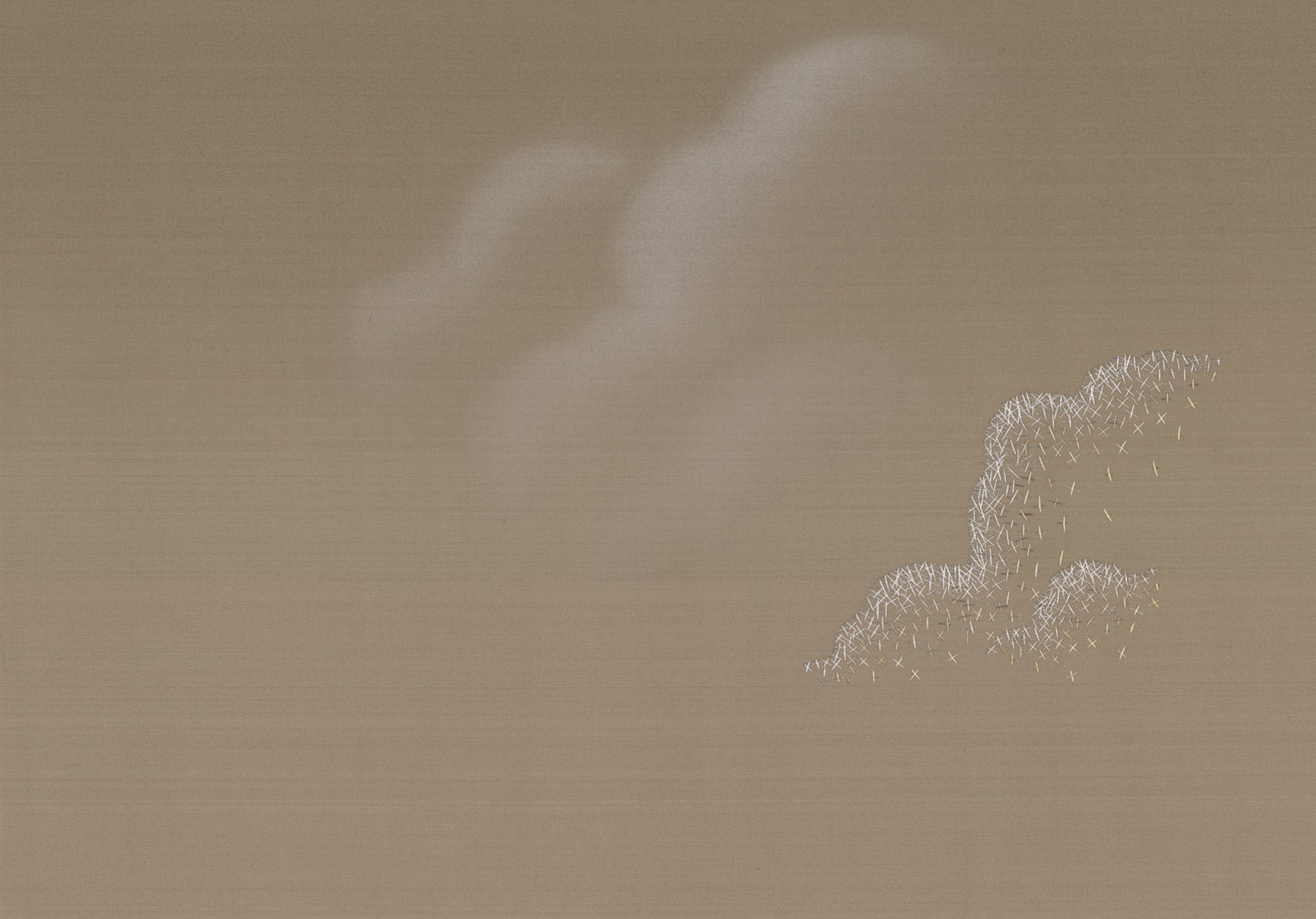 Muted and understated on a steel silk ground, soft white clouds with touches of metallic paint and embroidery evoke a calming skyscape.