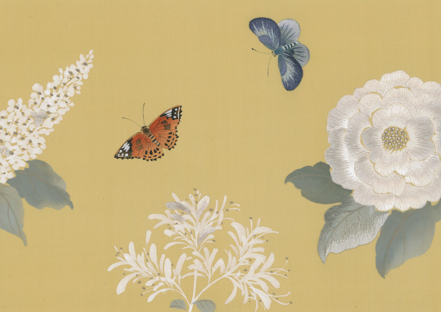 A joyful colourway of soft pastels against a warming butter silk ground. Bright whites and naturalistic greens comprise the dominant foliage and flowers, whilst butterflies and other insect life punctuate the scene in amber, browns and blues, their wings, and the blooms on which they perch, embellished with embroidery.