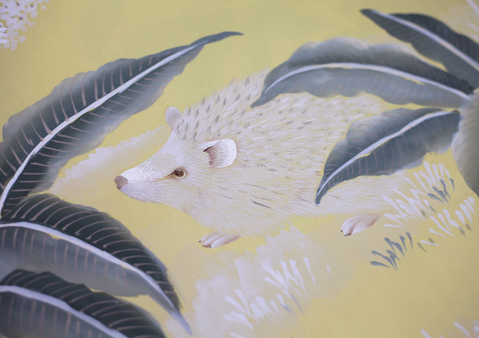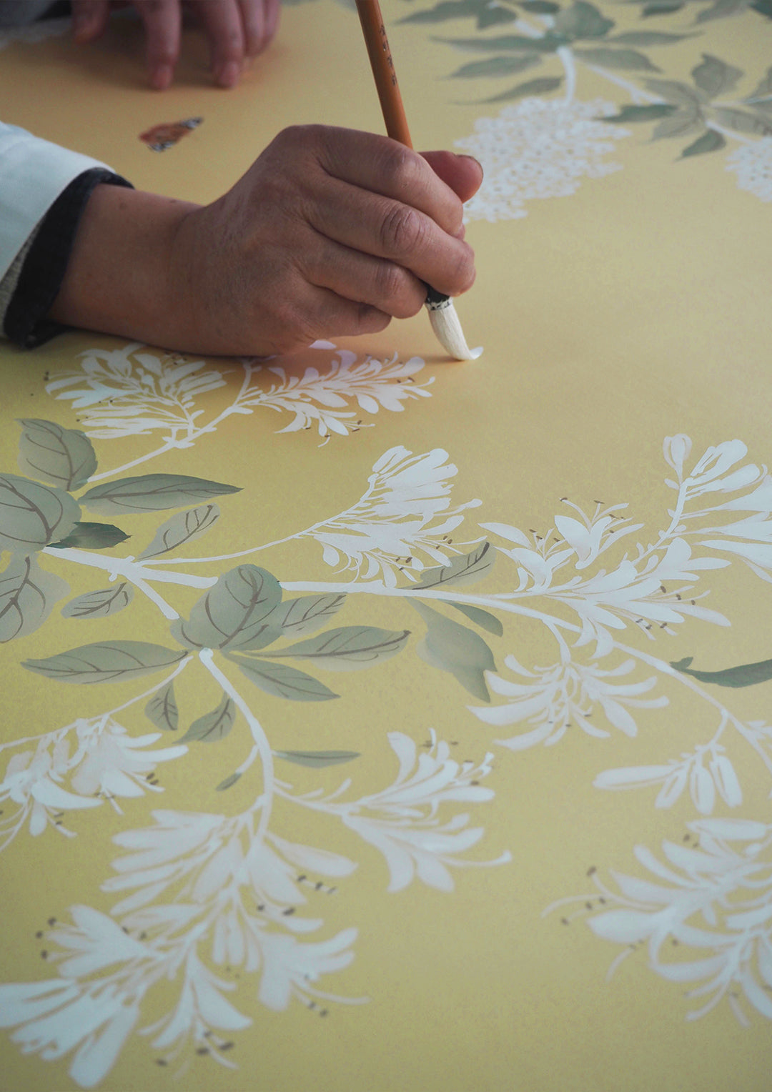Each painted panel begins its life as a length of raw silk which we size with a natural adhesive so that it receives paint without bleeding. We often brush the silk with iridescent pearl washes to add further lustre before backing with traditional rice paper. This forms the extraordinary canvas on which our artists work their magic.