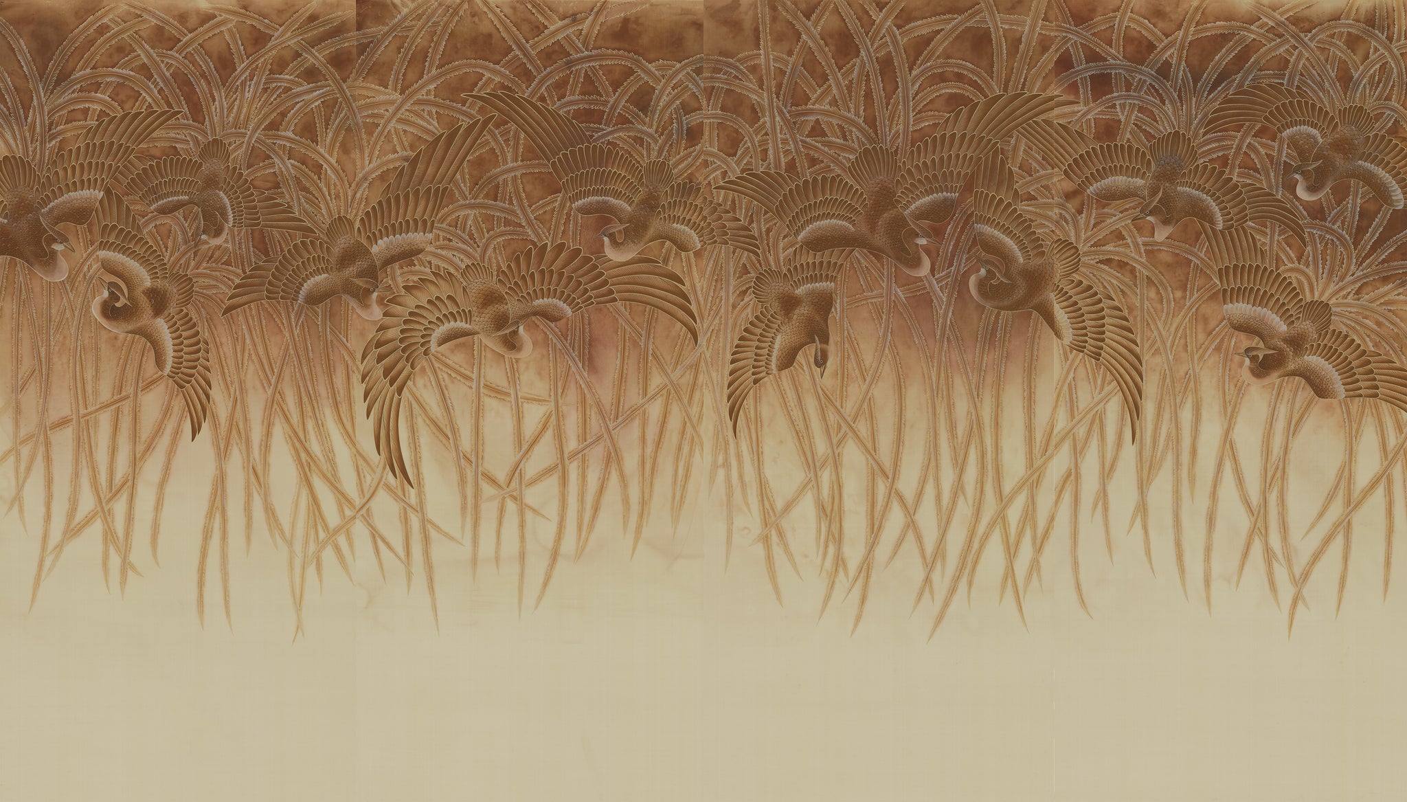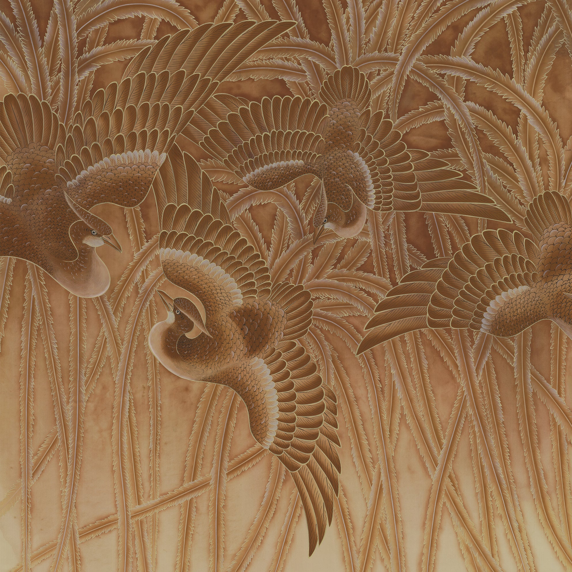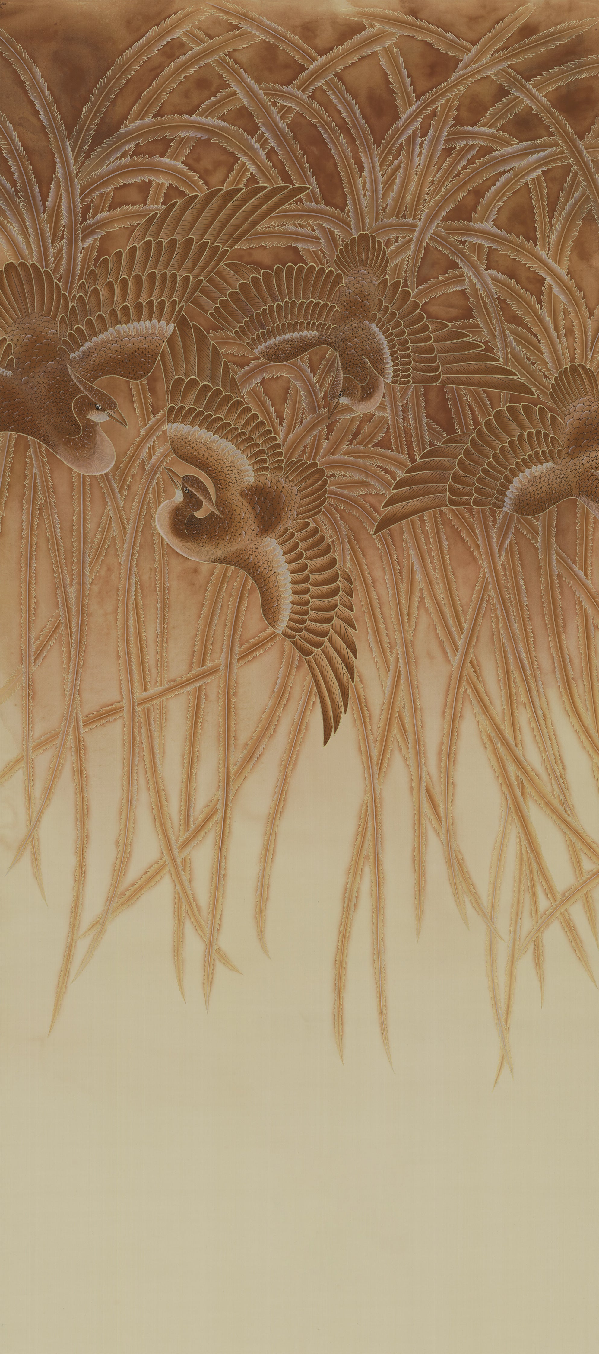 Meticulously rendered pheasants dance across the design, their long tail plumes cascading downwards, evoking a sense of movement and grace. Monochrome palettes and witty use of the ombré effect bring to mind Lalique’s fine glassware with its exquisite frosting and staining.