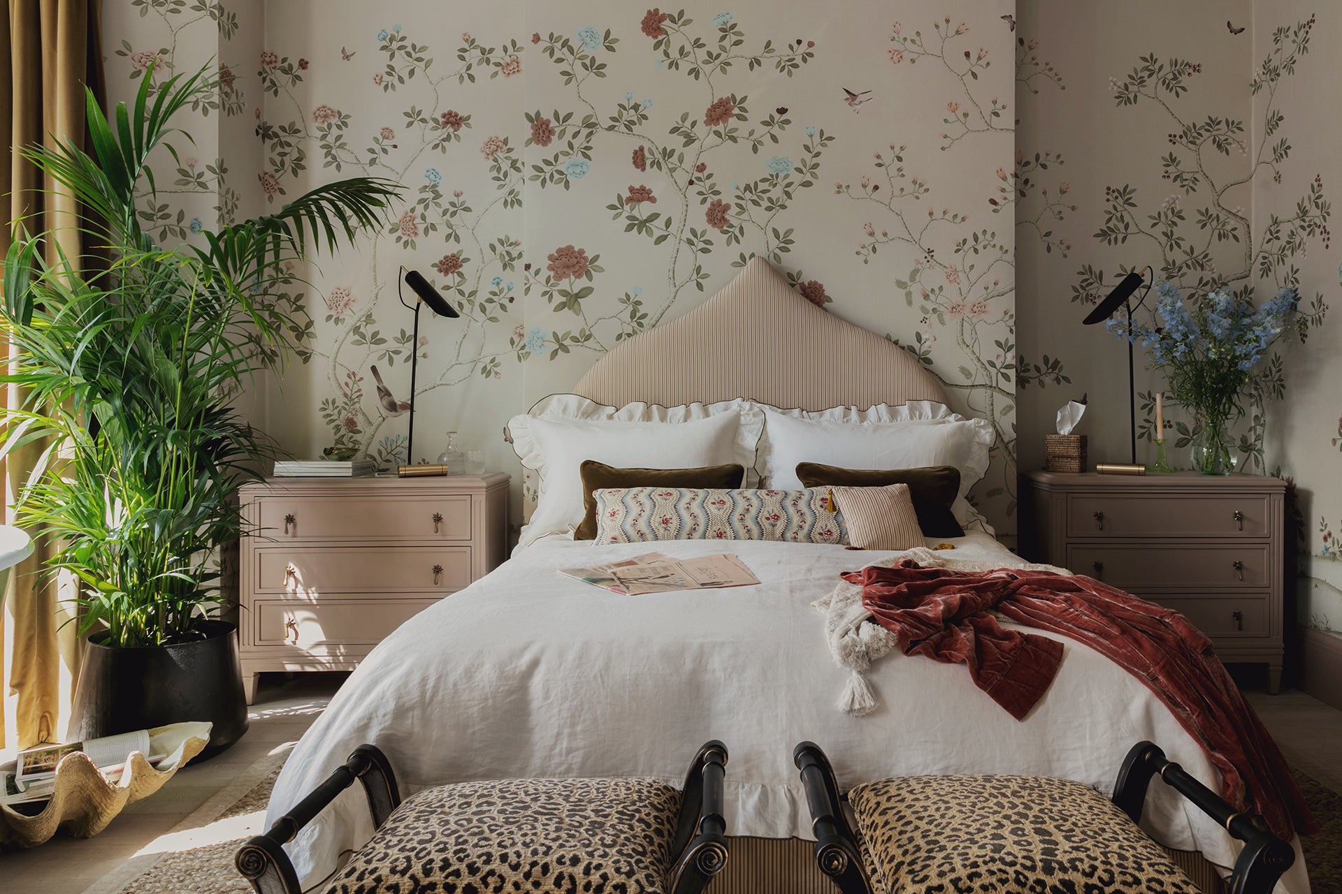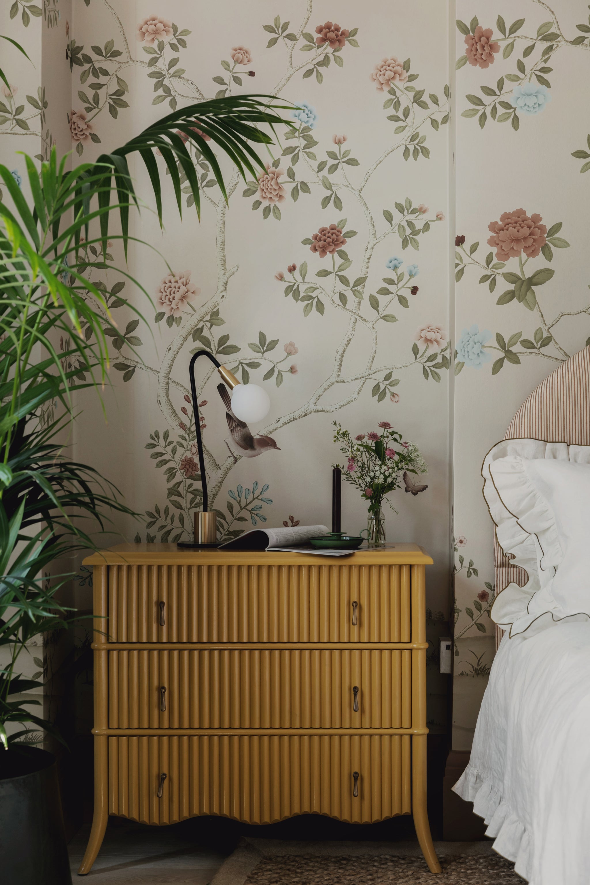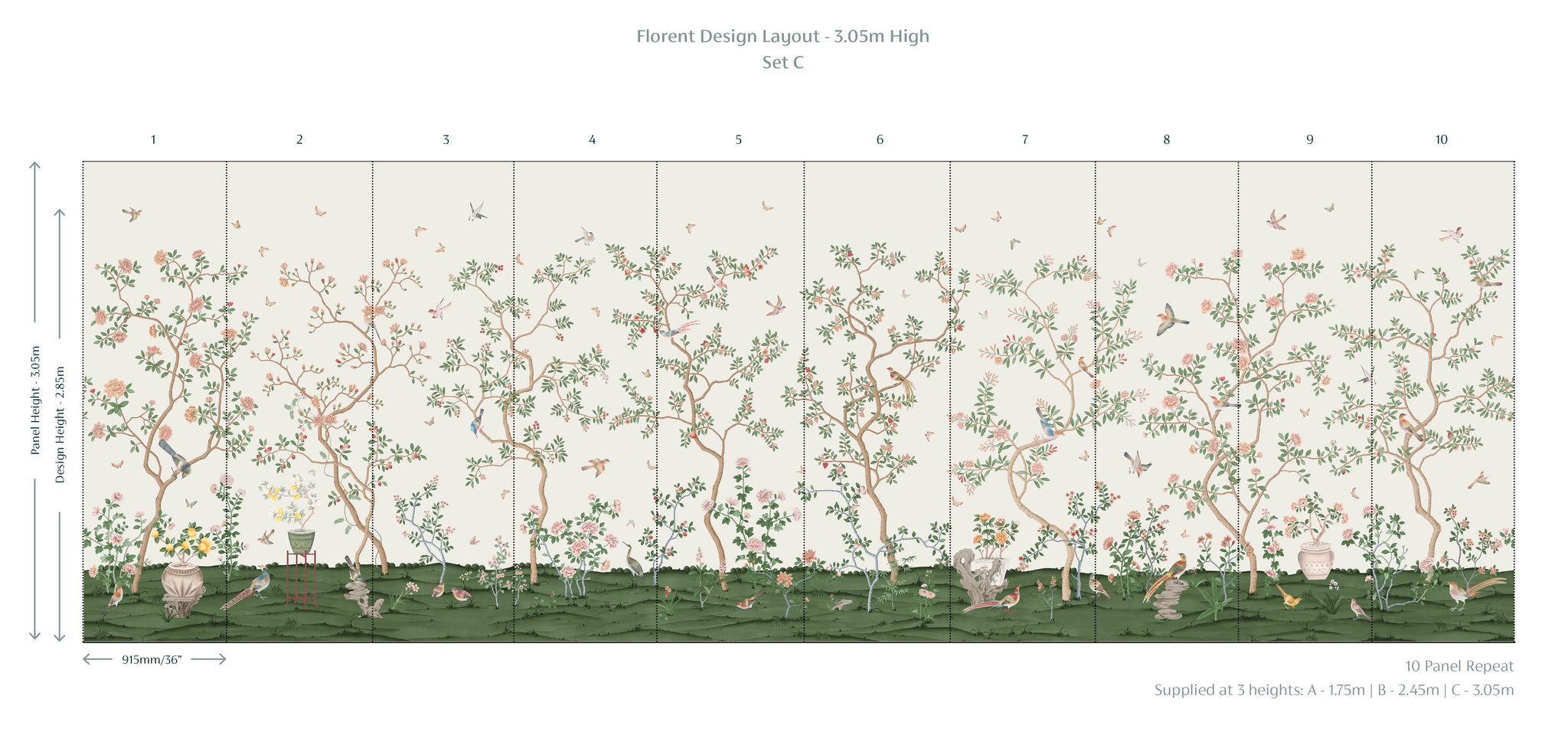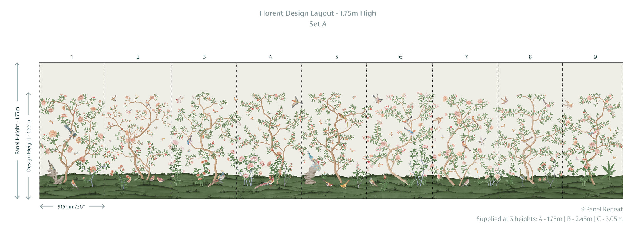 Inspired by classical bird and flower chinoiseries, Florent creates the feeling of a walled garden planted with fruiting and flowering espalier trees.