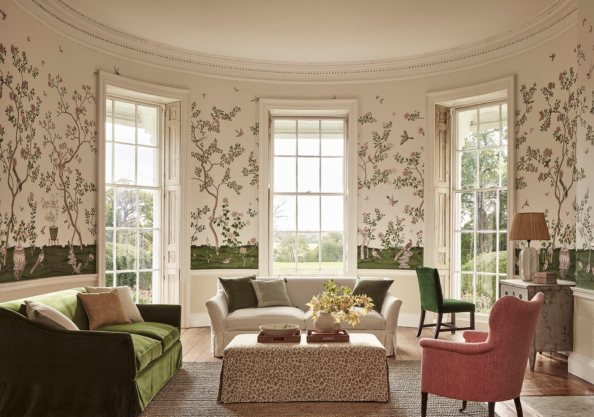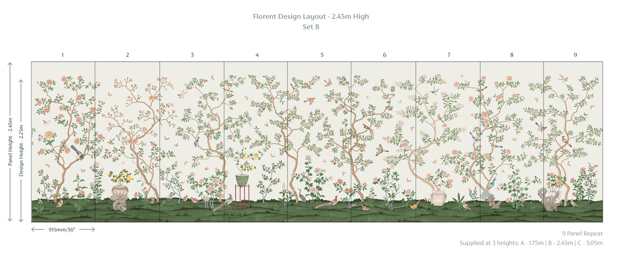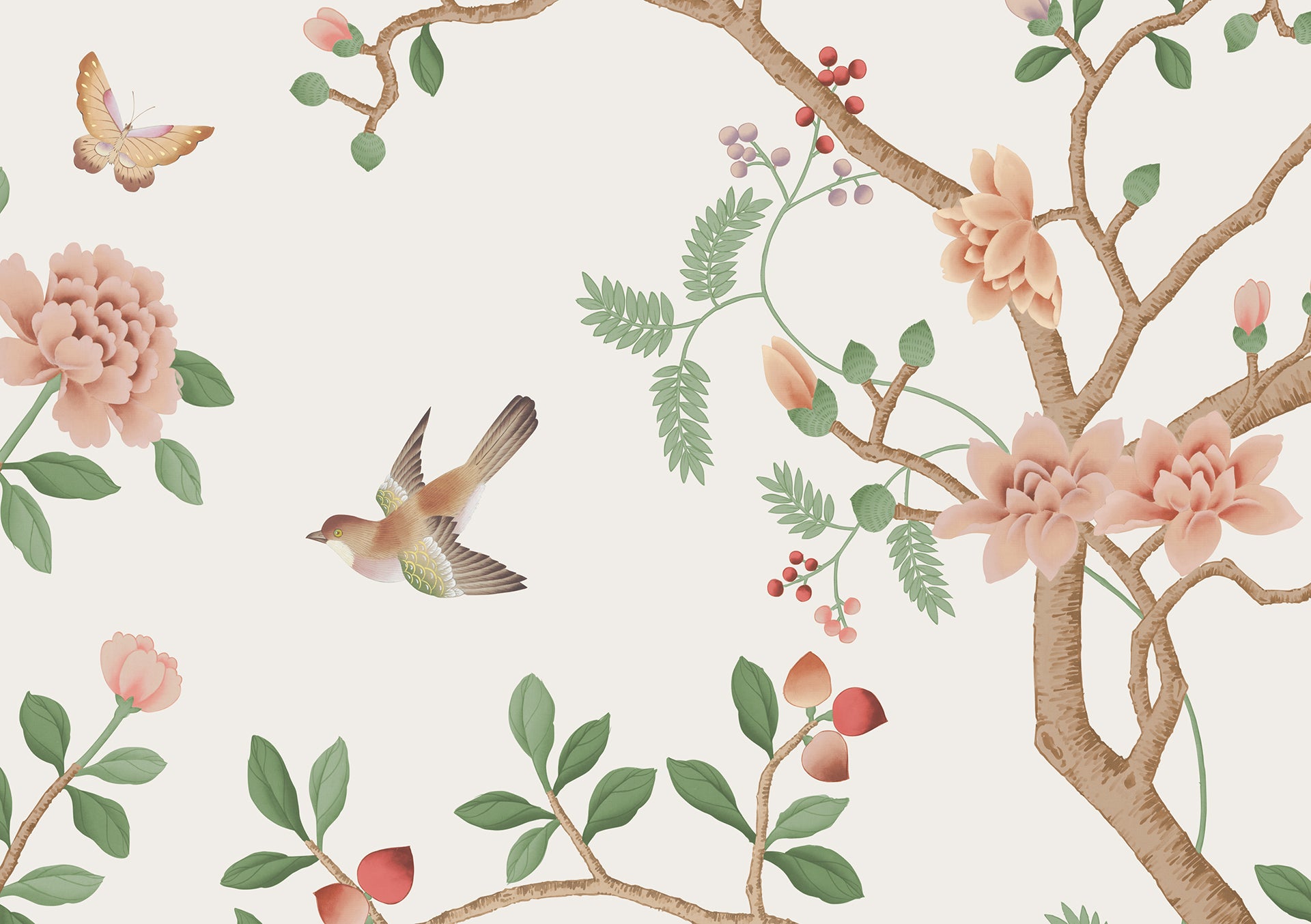 Inspired by classical bird and flower chinoiseries, this design creates the feeling of a walled garden planted with fruiting and flowering espalier trees.