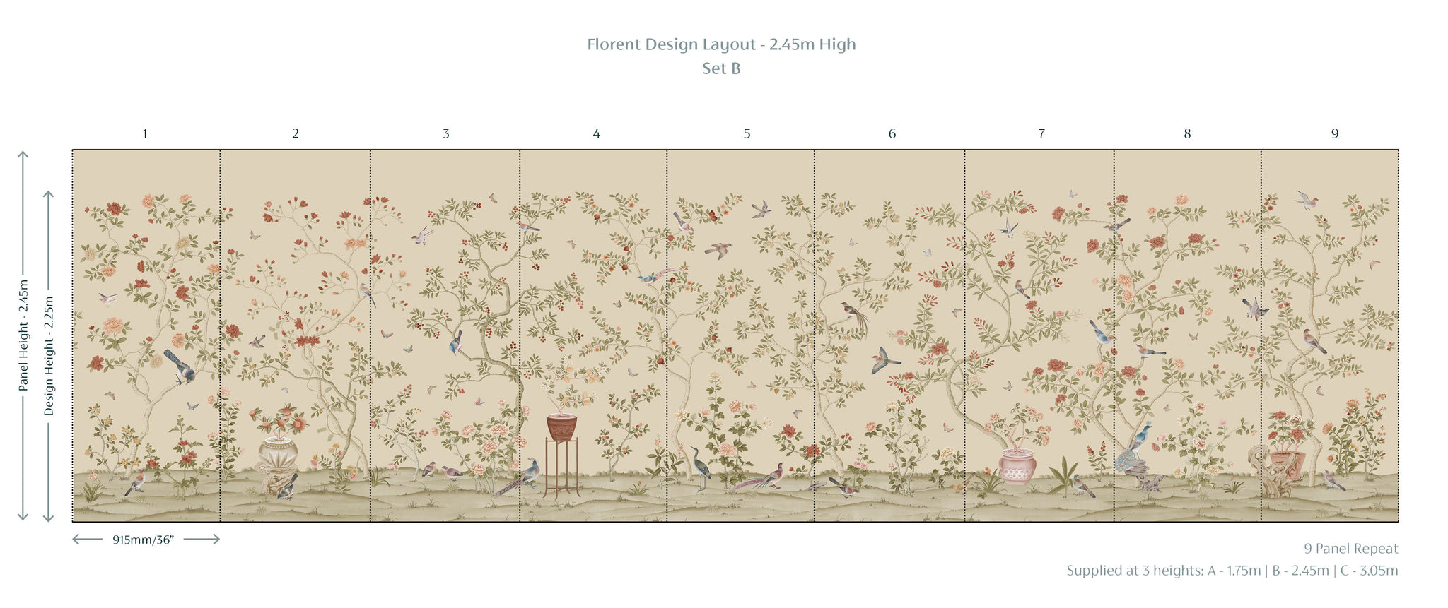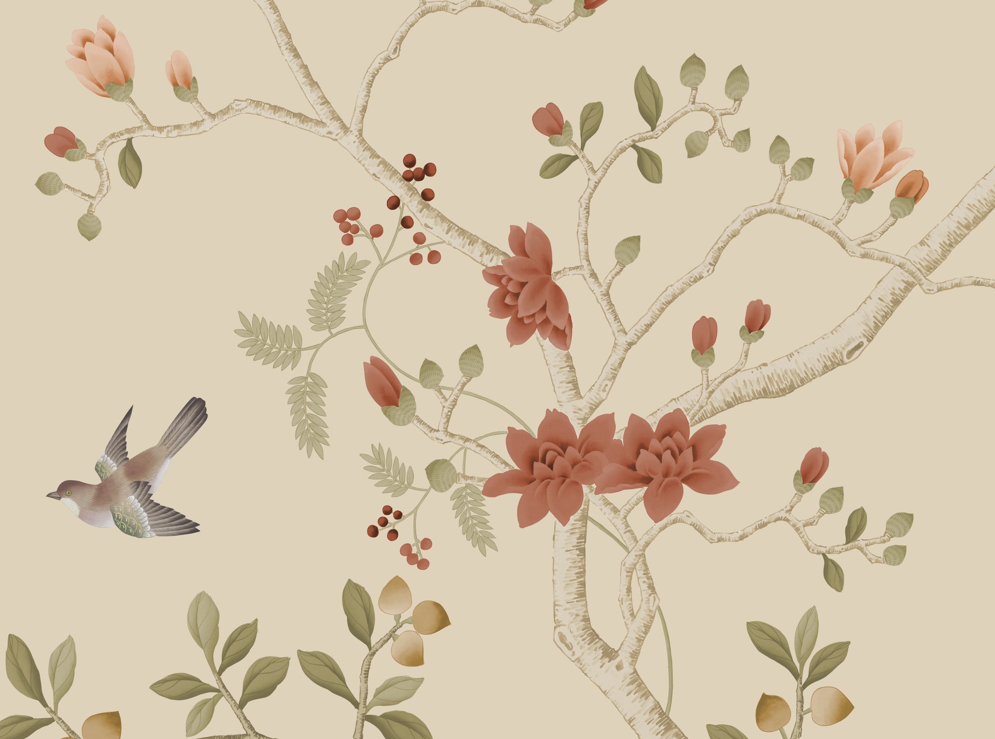 Inspired by classical bird and flower chinoiseries, this design creates the feeling of a walled garden planted with fruiting and flowering espalier trees.