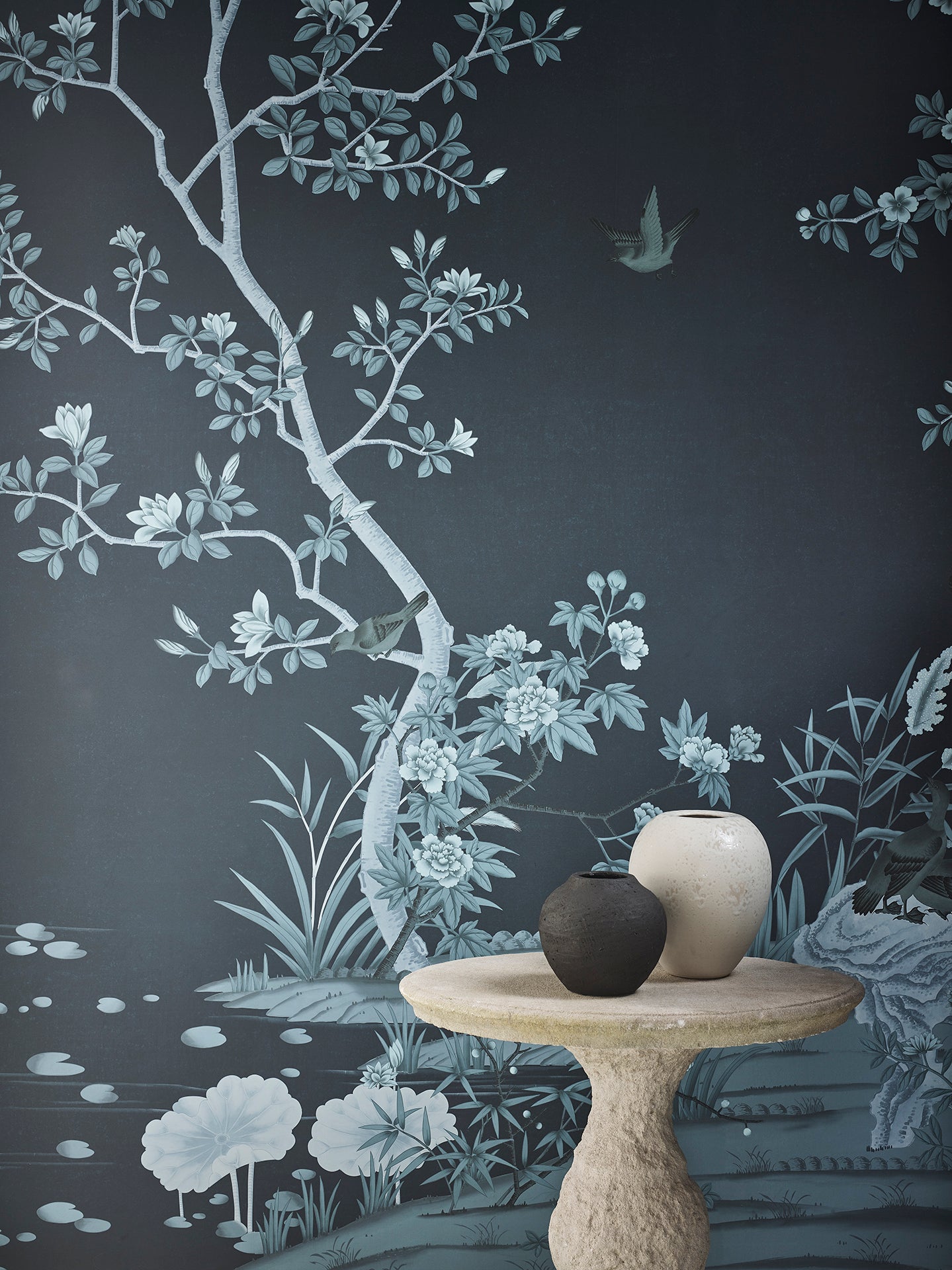 Our Folly design layout is at once bold, classical and whimsical. The scene moves between rocks, water and lush foliage, with beautiful birds throughout. With quite a dense layout and a deep, heavy ground comprising both land and water, the feeling is that of being immersed in a botanical paradise.