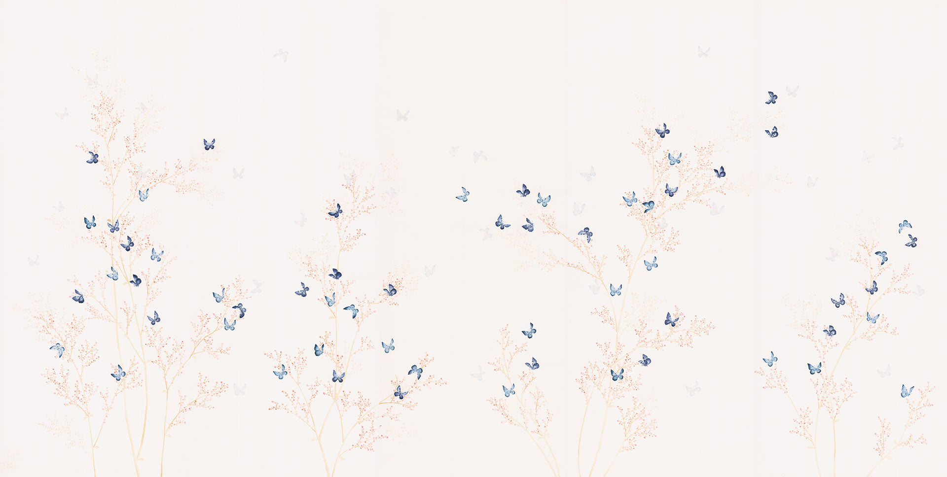 With its background of White Silk and it's very subtle blossom, Flutter is our most delicate Fountain colourway. Blue butterflies dance across the design in various levels of fading, adding atmosphere and depth.