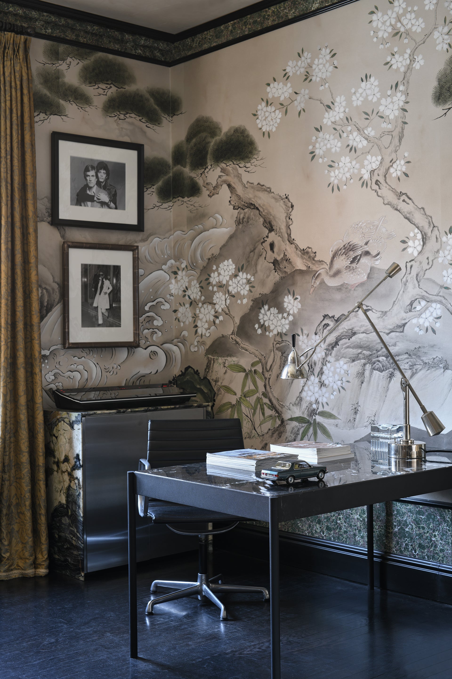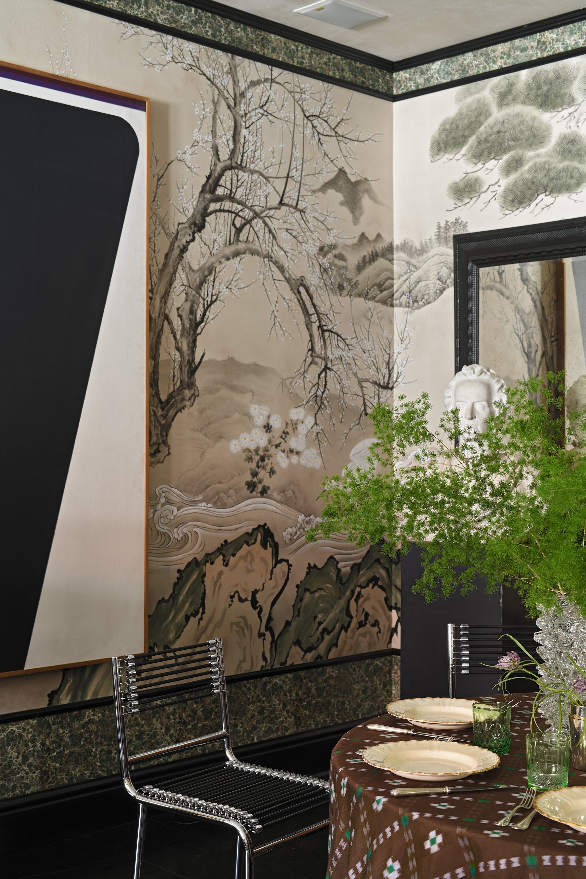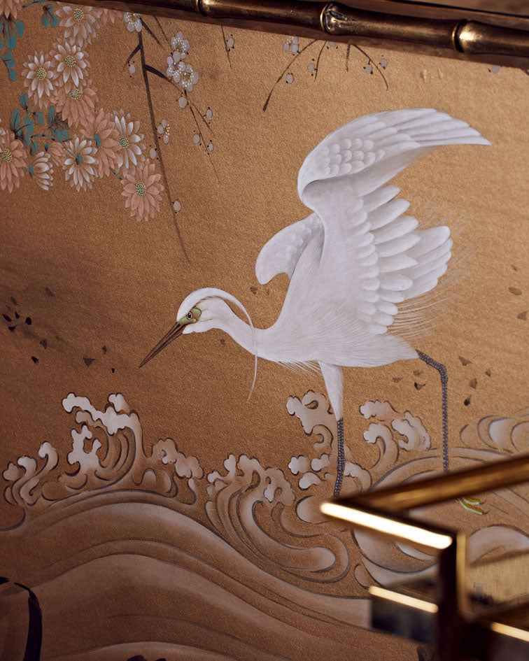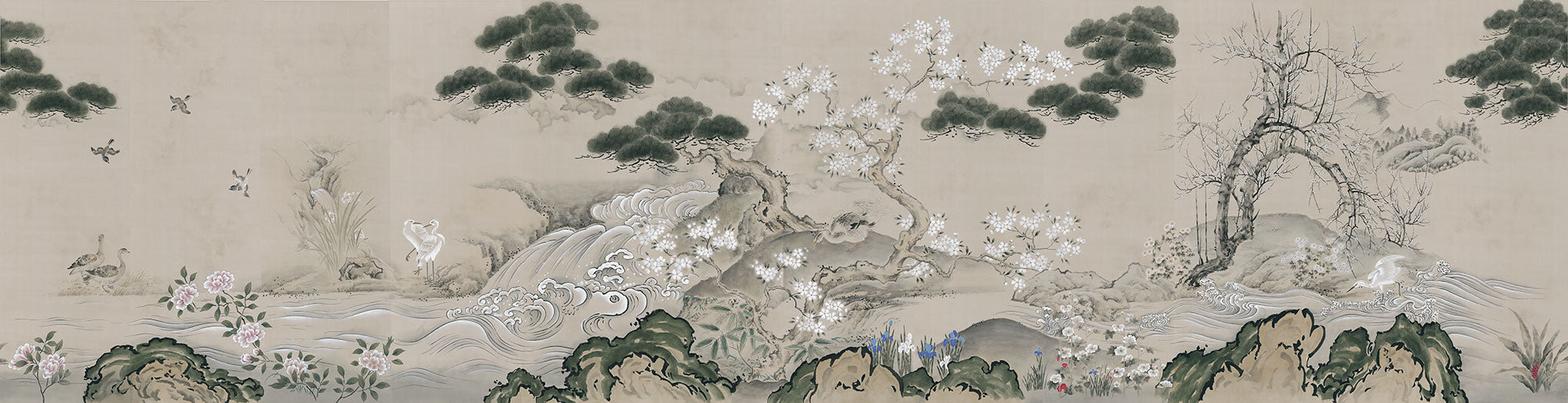 Created in collaboration with American interior designer Eric Egan, our Haiku wallcovering takes its cues from Sumi-e, the ancient art of Japanese brush painting in which the essence of a subject is expressed in the simplest way possible, every stroke brimming with meaning. The layout has a palpable sense of movement: the trees swaying, the water surging, the cranes poised for flight. And the presence of ancient Chinese motifs—The Three Friends of Winter (pine, bamboo and plum) and The Four Gentlemen (bamboo, plum, orchid and chrysanthemum)—acknowledge China’s profound influence on Japanese art.