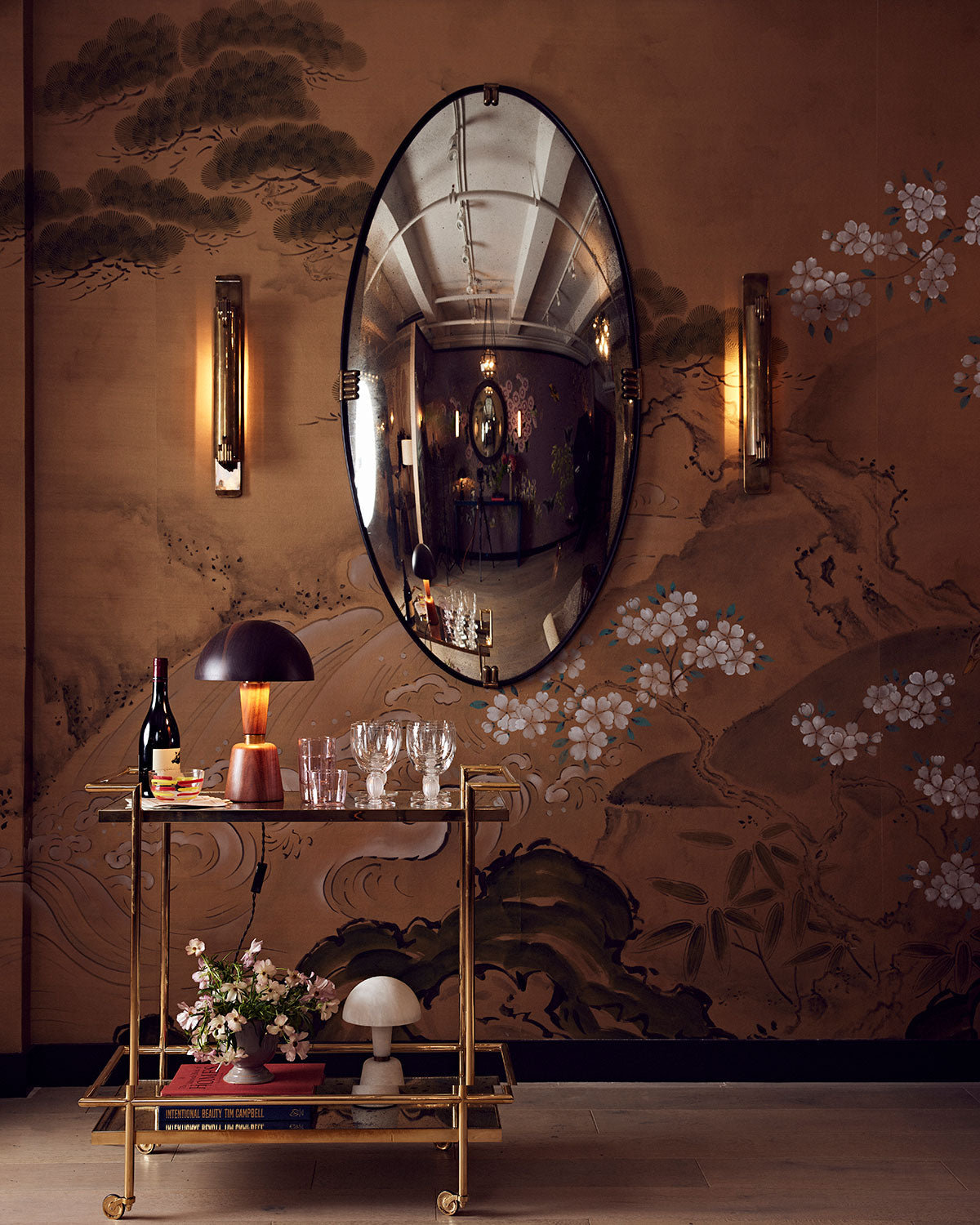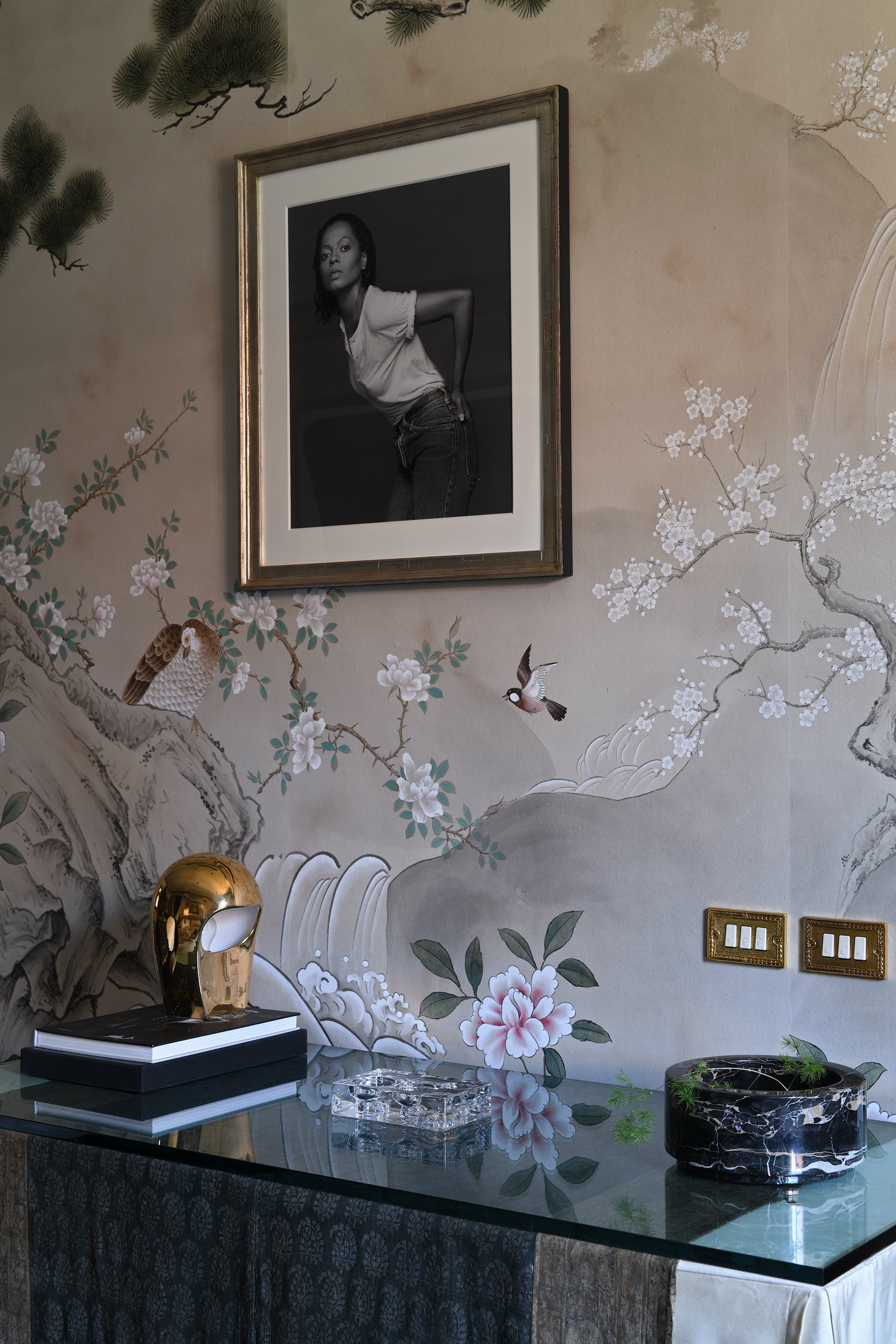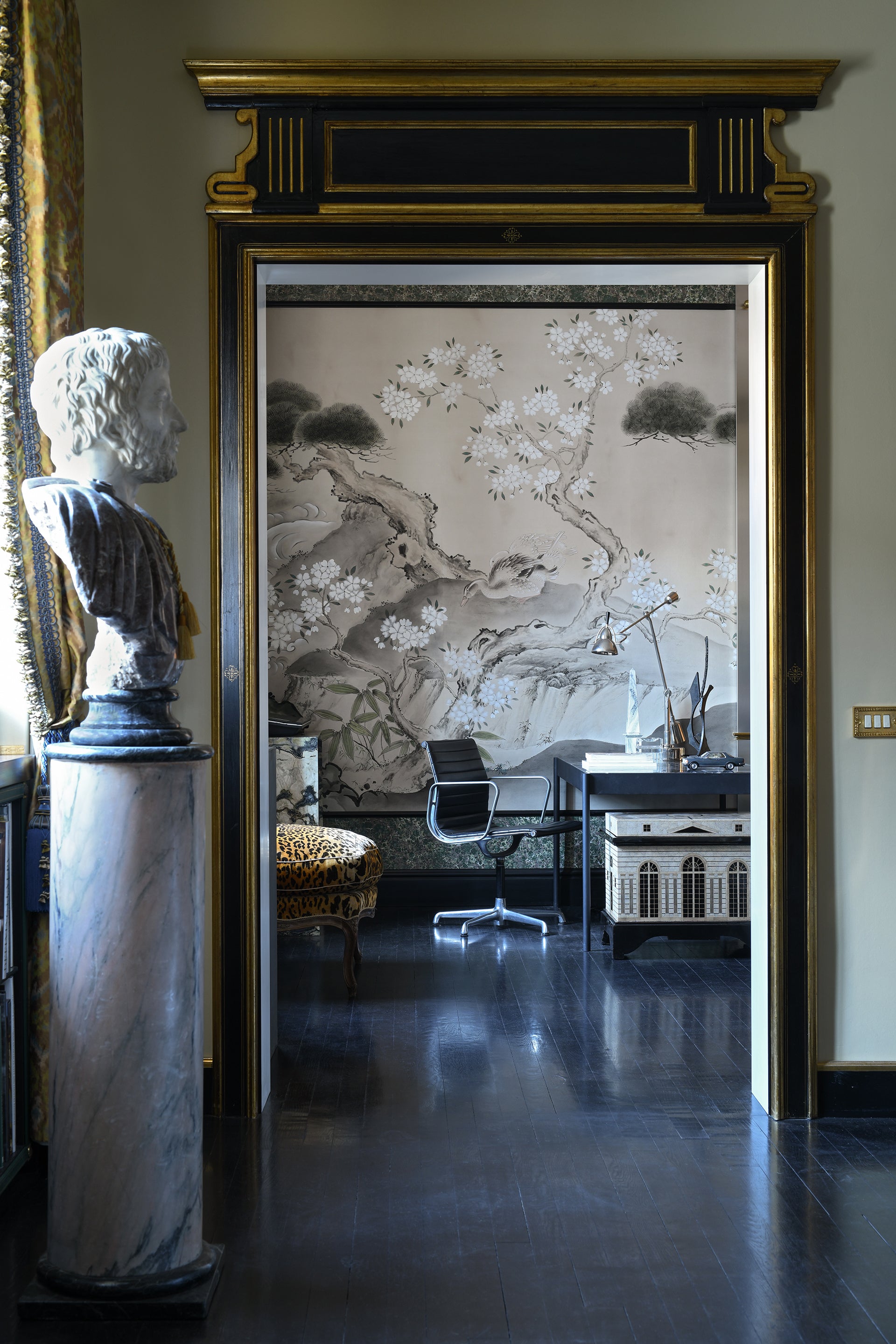 Created in collaboration with American interior designer Eric Egan, our Haiku wallcovering takes its cues from Sumi-e, the ancient art of Japanese brush painting in which the essence of a subject is expressed in the simplest way possible, every stroke brimming with meaning. The layout has a palpable sense of movement: the trees swaying, the water surging, the cranes poised for flight. And the presence of ancient Chinese motifs—The Three Friends of Winter (pine, bamboo and plum) and The Four Gentlemen (bamboo, plum, orchid and chrysanthemum)—acknowledge China’s profound influence on Japanese art.