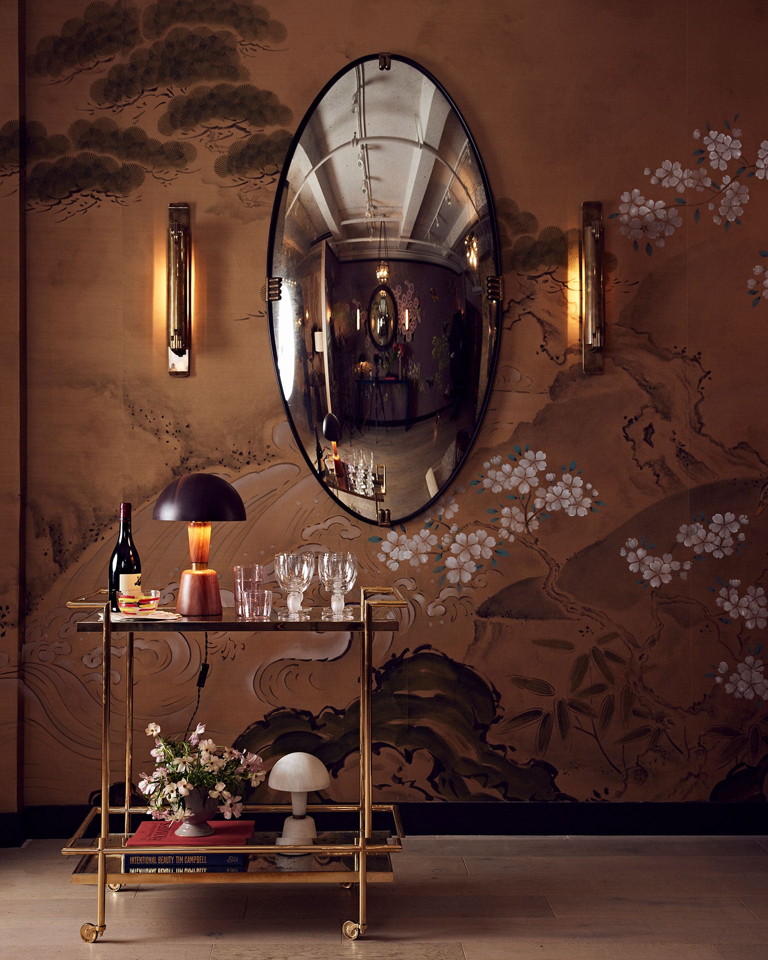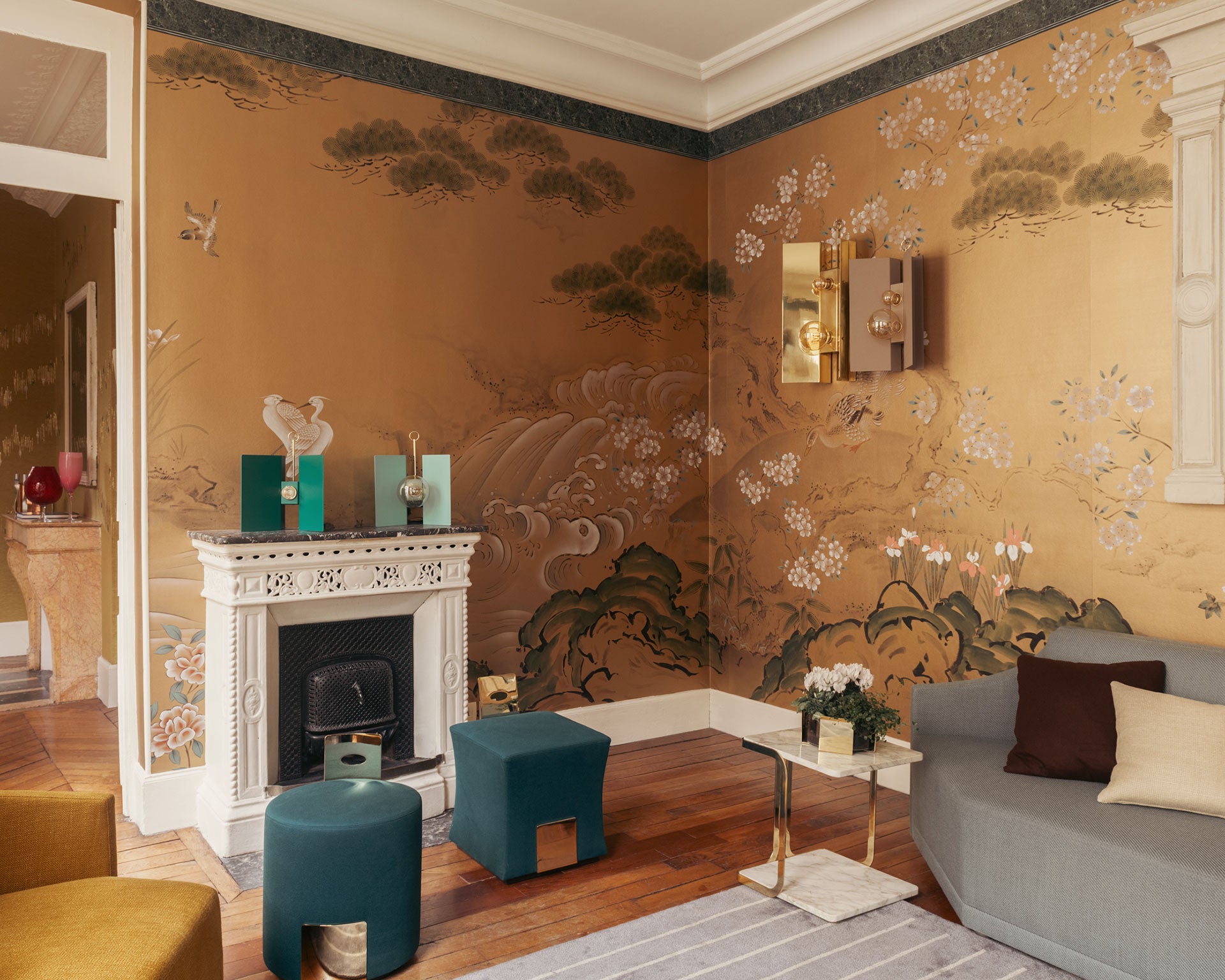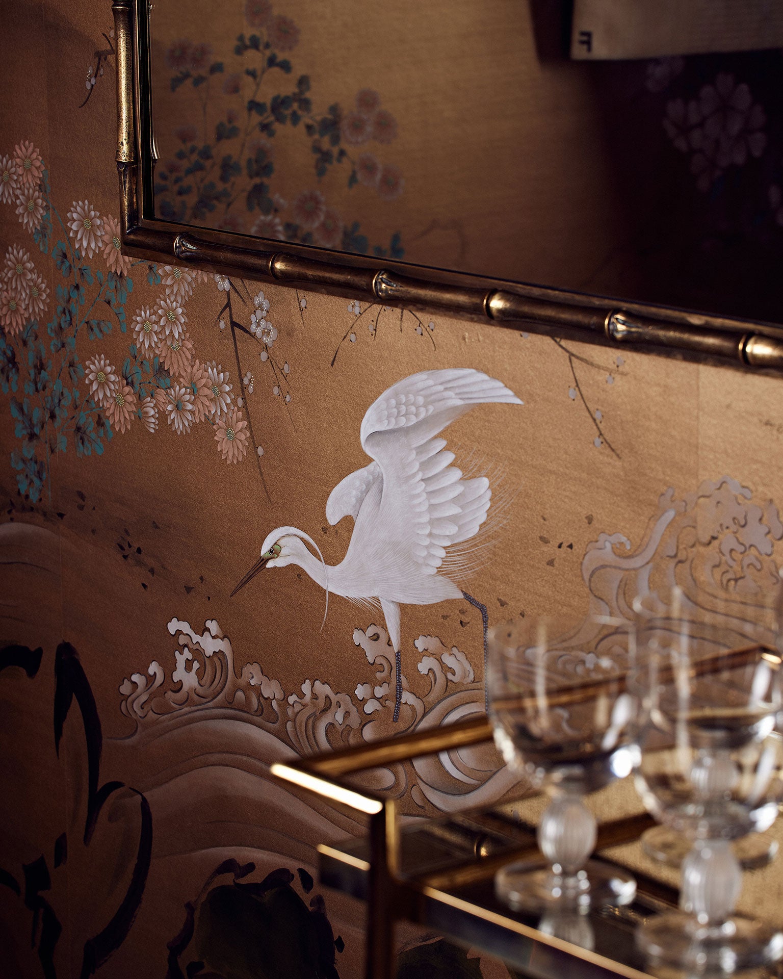 Created in collaboration with American interior designer Eric Egan, our Haiku wallcovering takes its cues from Sumi-e, the ancient art of Japanese brush painting in which the essence of a subject is expressed in the simplest way possible, every stroke brimming with meaning. The layout has a palpable sense of movement: the trees swaying, the water surging, the cranes poised for flight. And the presence of ancient Chinese motifs—The Three Friends of Winter (pine, bamboo and plum) and The Four Gentlemen (bamboo, plum, orchid and chrysanthemum)—acknowledge China’s profound influence on Japanese art.