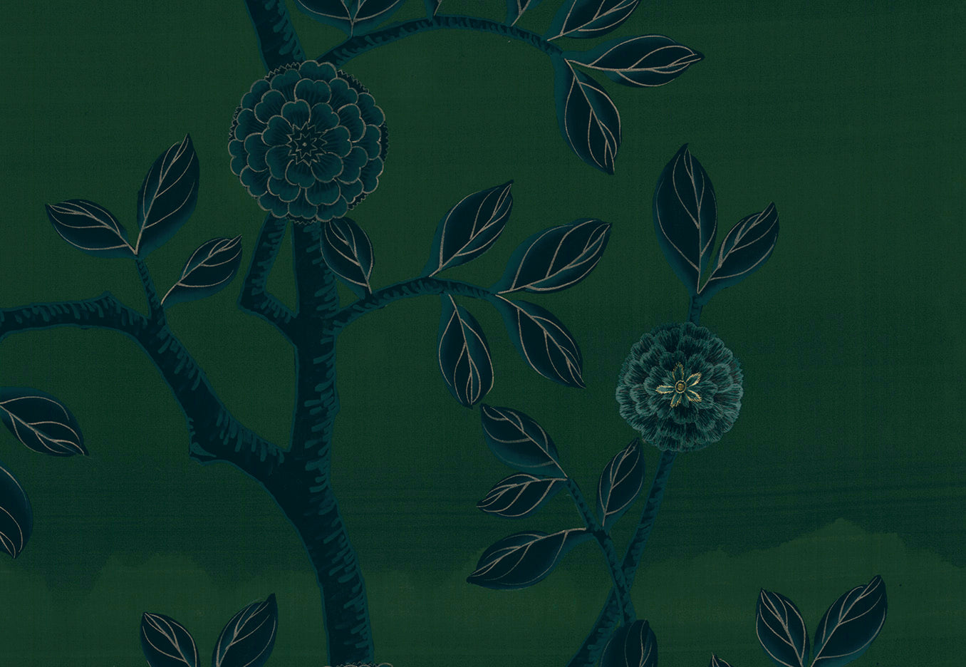 Each painted panel begins its life as a length of raw silk which we size with a natural adhesive so that it receives paint without bleeding. We often brush the silk with iridescent pearl washes to add further lustre before backing with traditional rice paper. This forms the extraordinary canvas on which our artists work their magic.