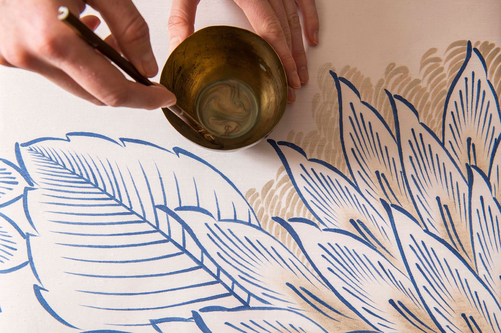 Each painted panel begins its life as a length of raw silk which we size with a natural adhesive so that it receives paint without bleeding. This forms the extraordinary canvas on which our artists work their magic. Our artists are masters of traditional painting and work in teams to meticulously plan out each room before slowly building up the many layers of detail and colour. To achieve intensity and shade, the artist will blend hues, often using two brushes simultaneously