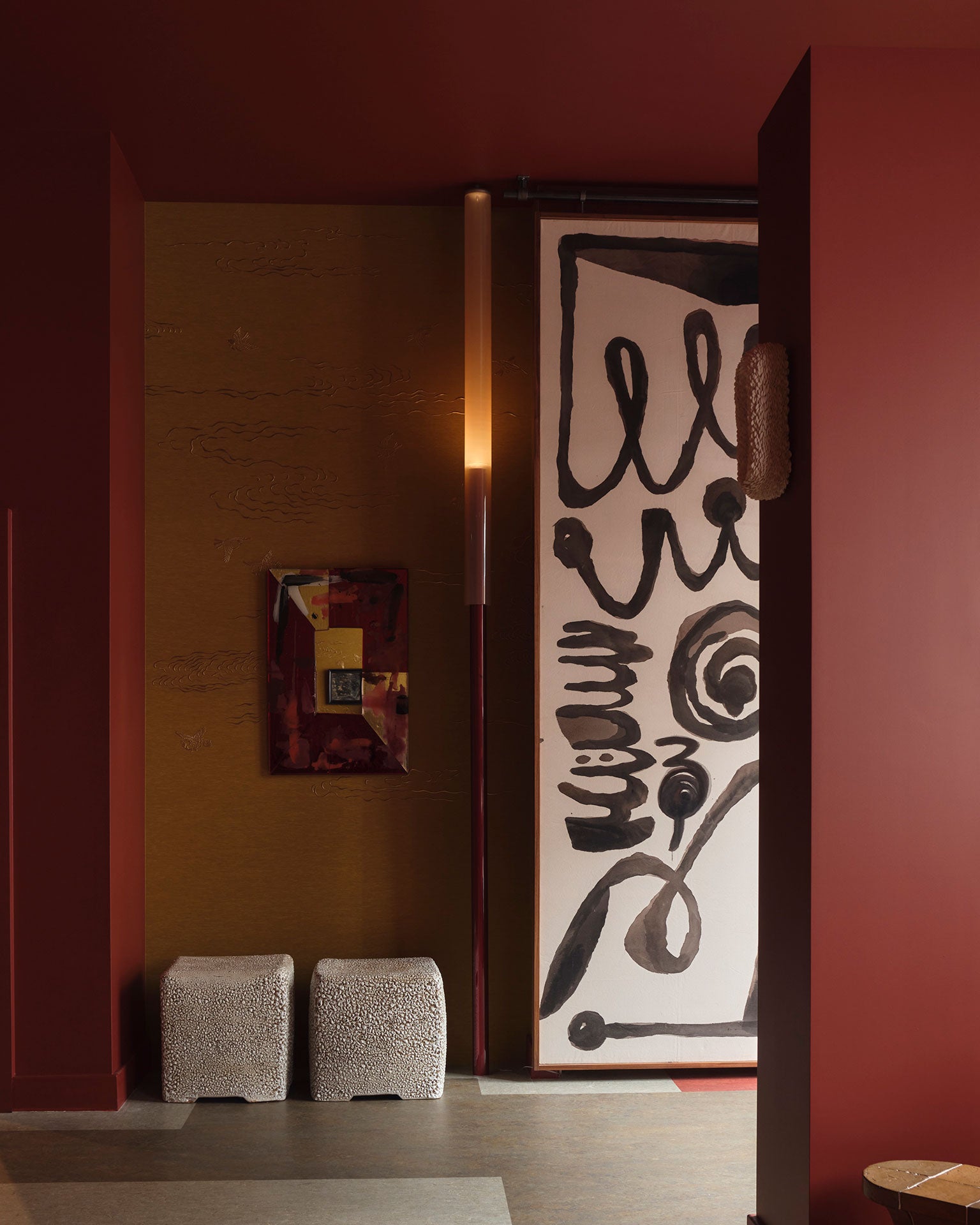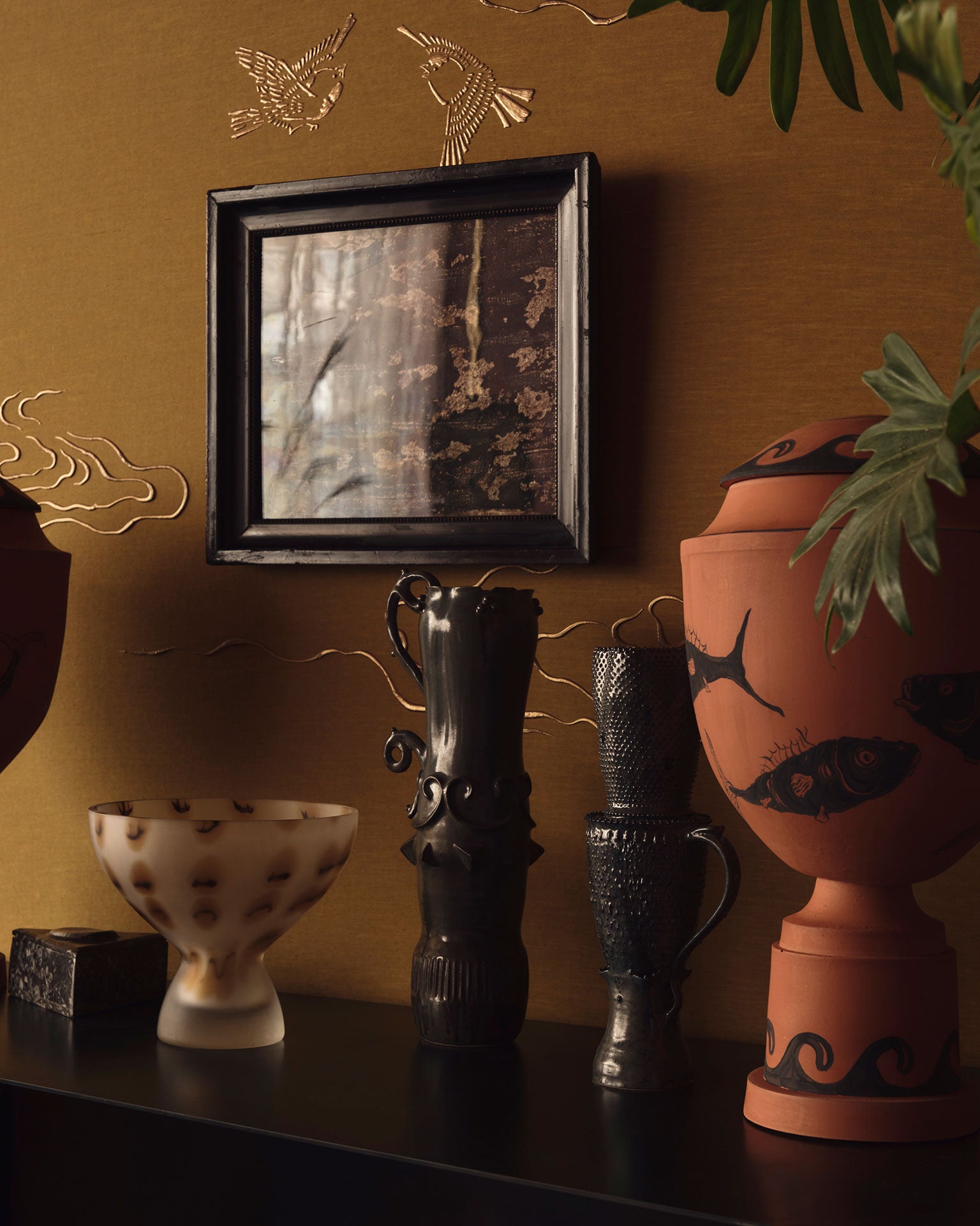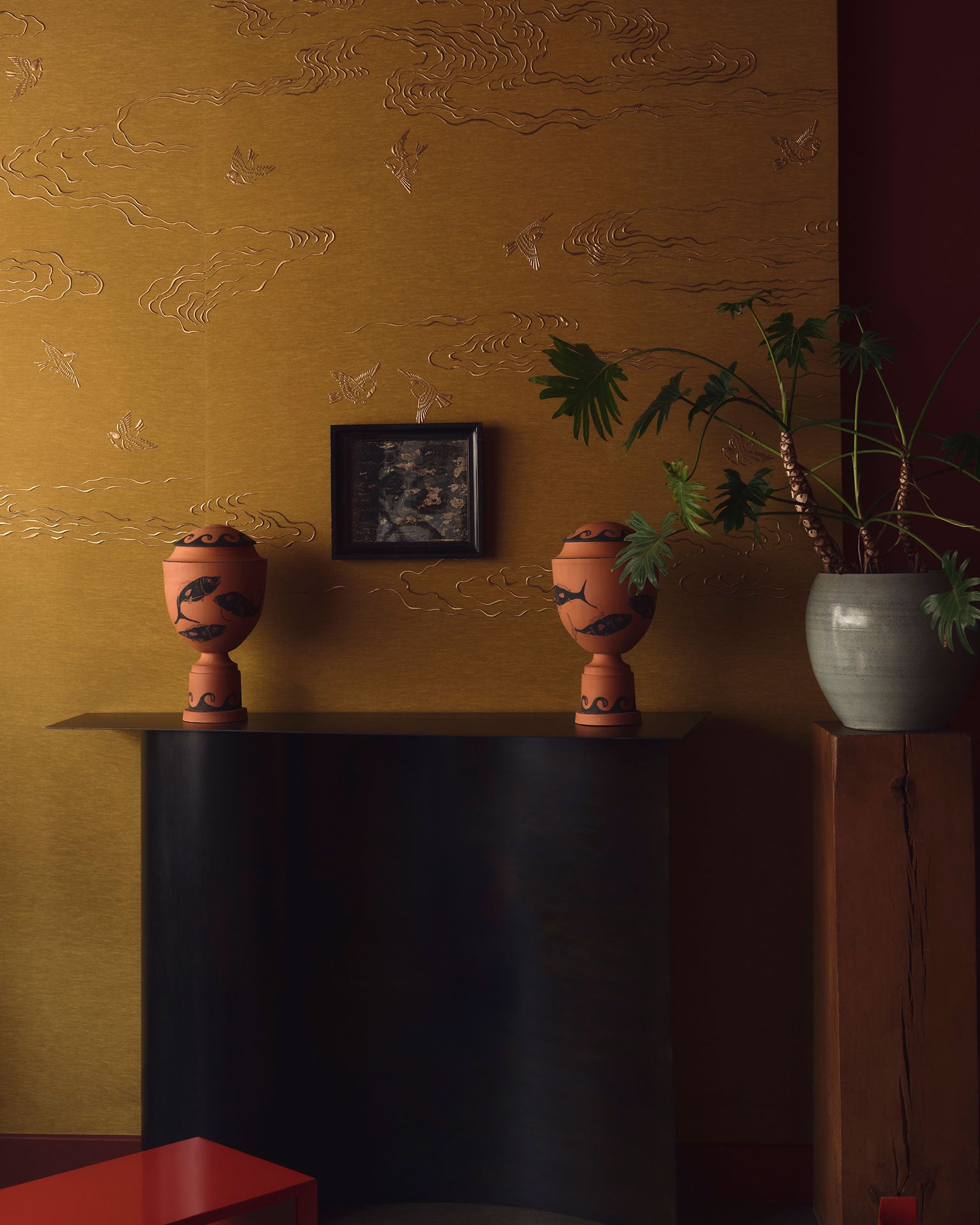 Aso is a celebration of ‘tone on tone’ and is painted onto faille – a silk-linen mix whose dry texture provides a contemporary backdrop to the classically Japanese details.