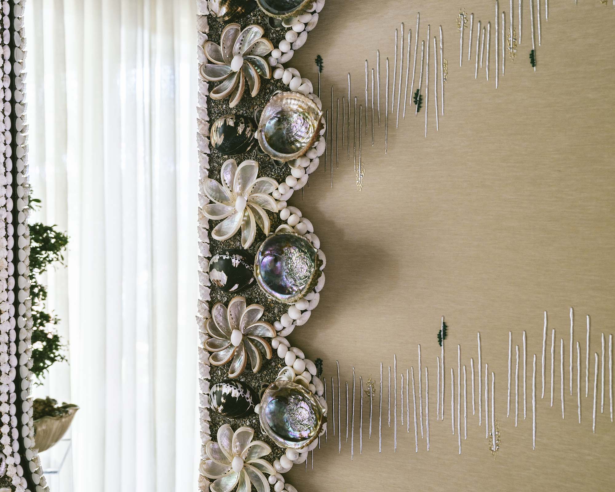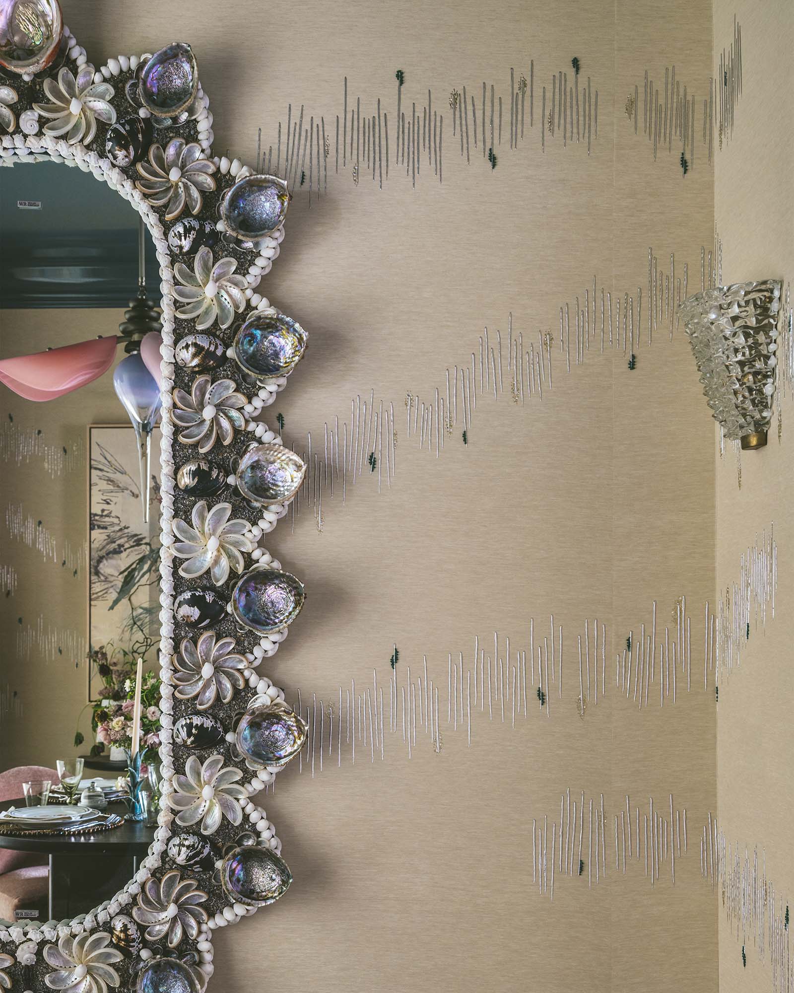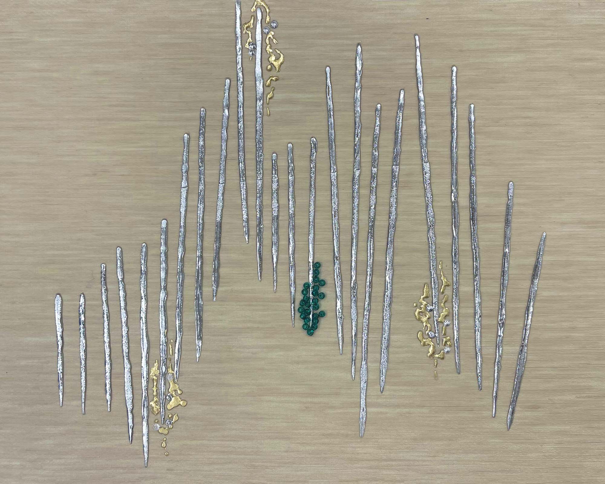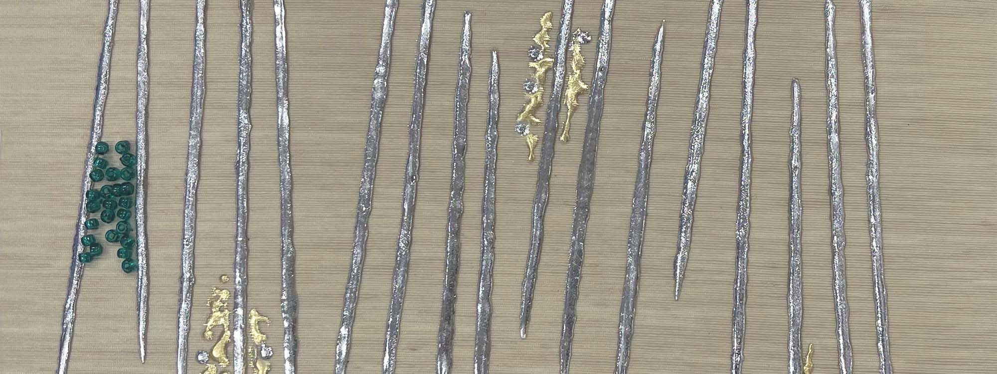 Soft and understated, Blake is set on pearl grey faille silk with gentle slub texture. Silver foiled lines intersect with delicate emerald-green beading, echoing the accents found in our Huxley colourway.
