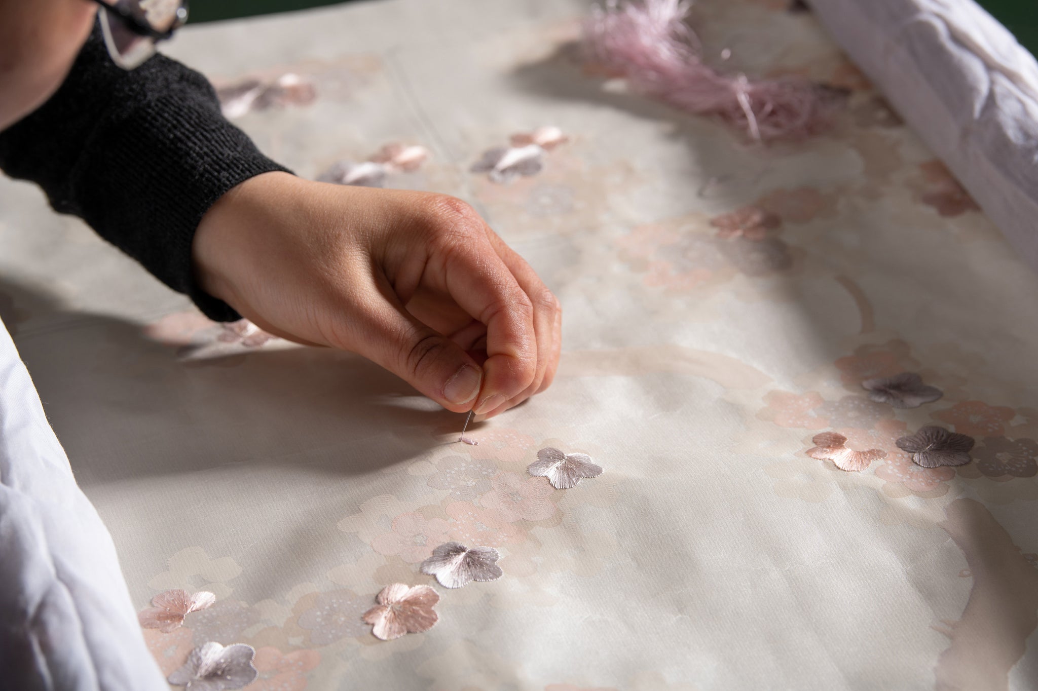 Hand Painted and Hand Embroidered Dyed silk with paper backing