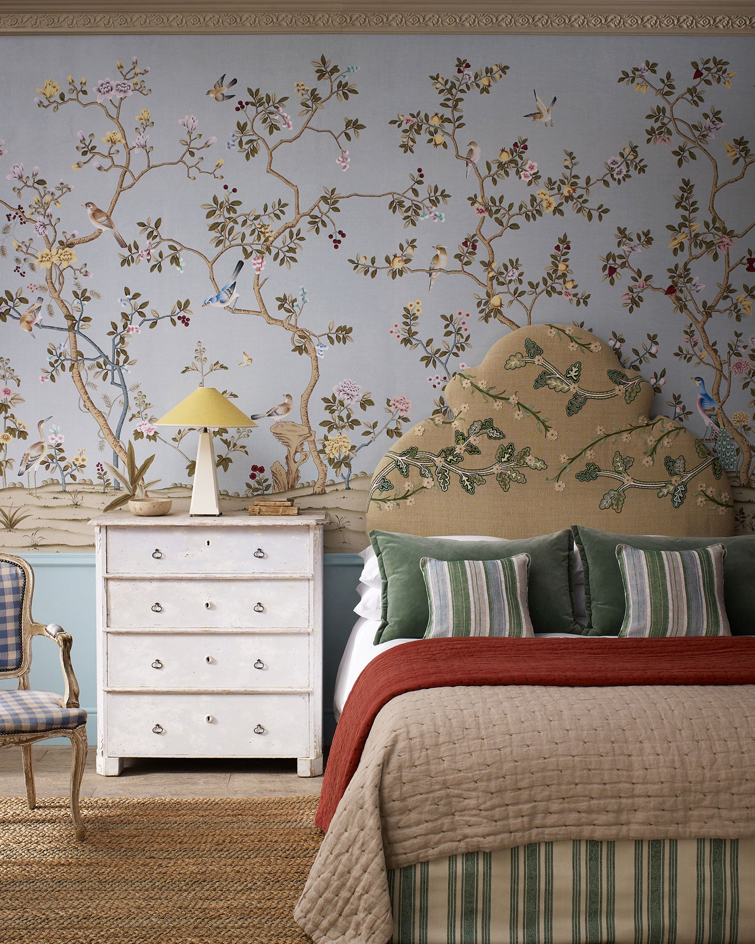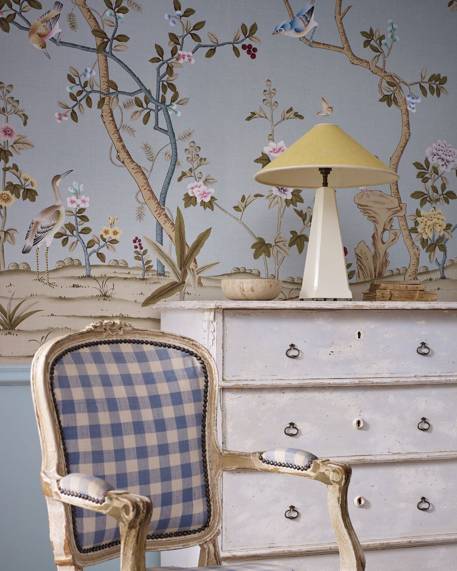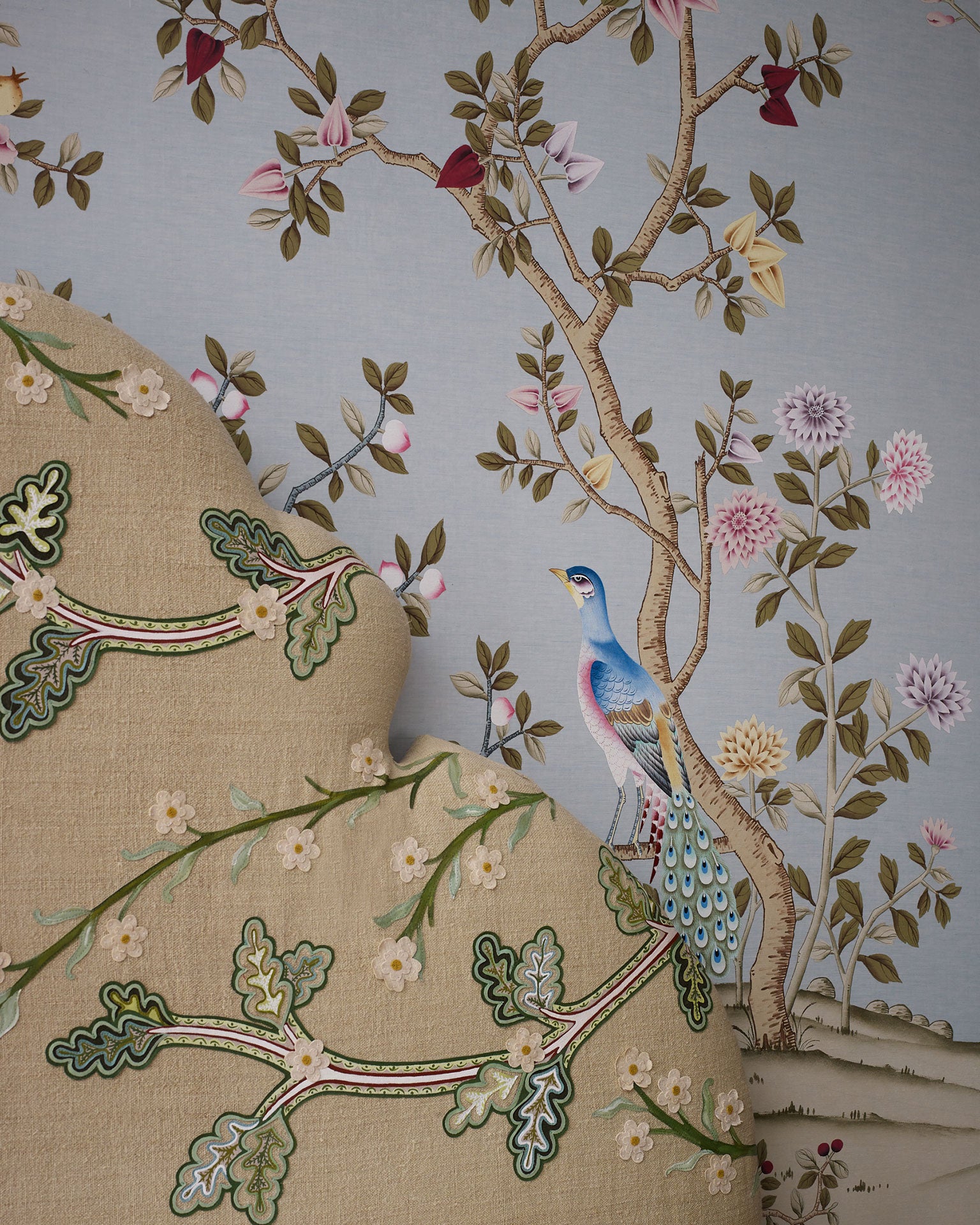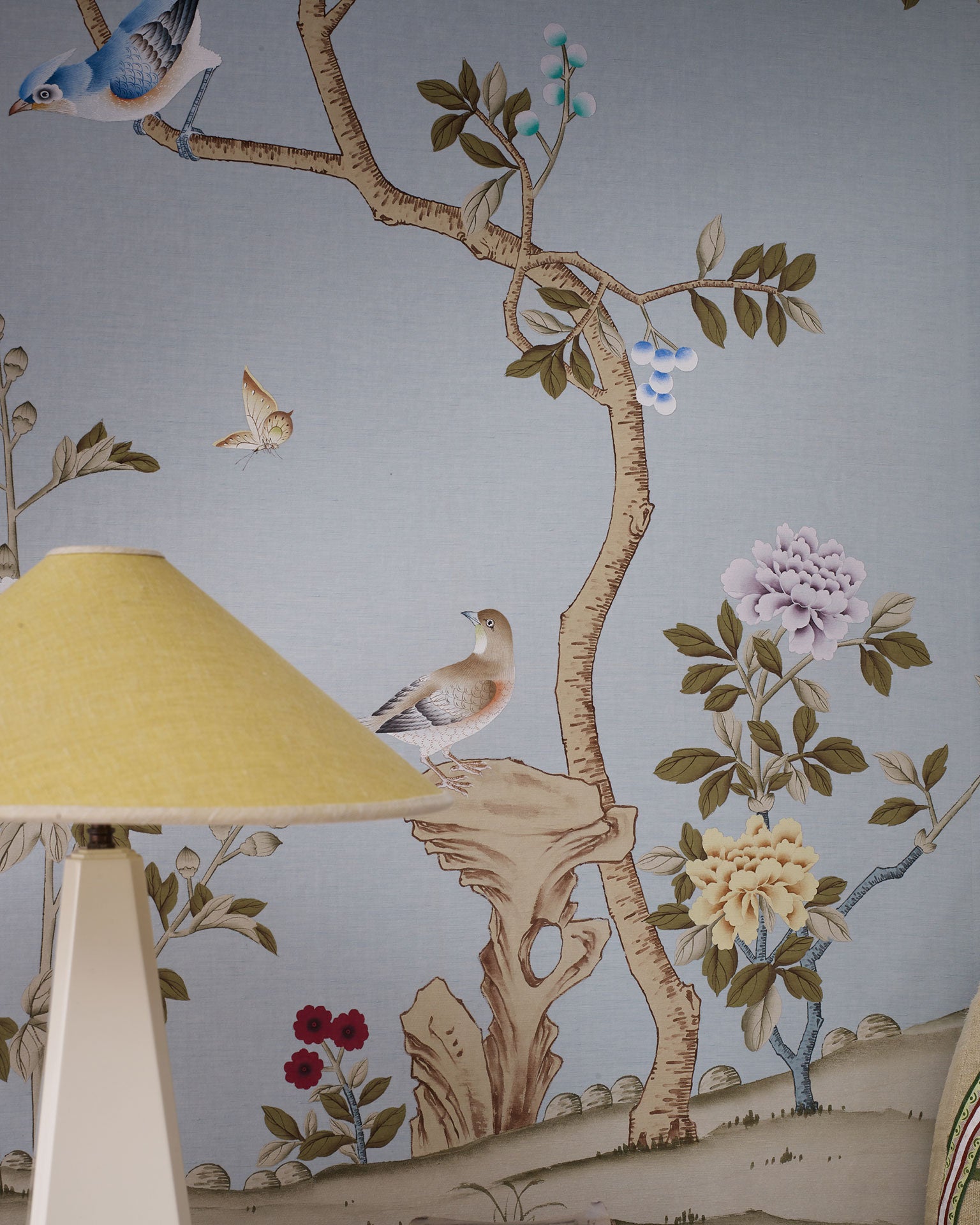 Effortlessly uplifting, Cala sings with traditionally feminine colours, including delicate lilacs, pinks and mauves. A Blue Sky background – hand-painted on a silk-linen mix – further adds to the sense of grace.