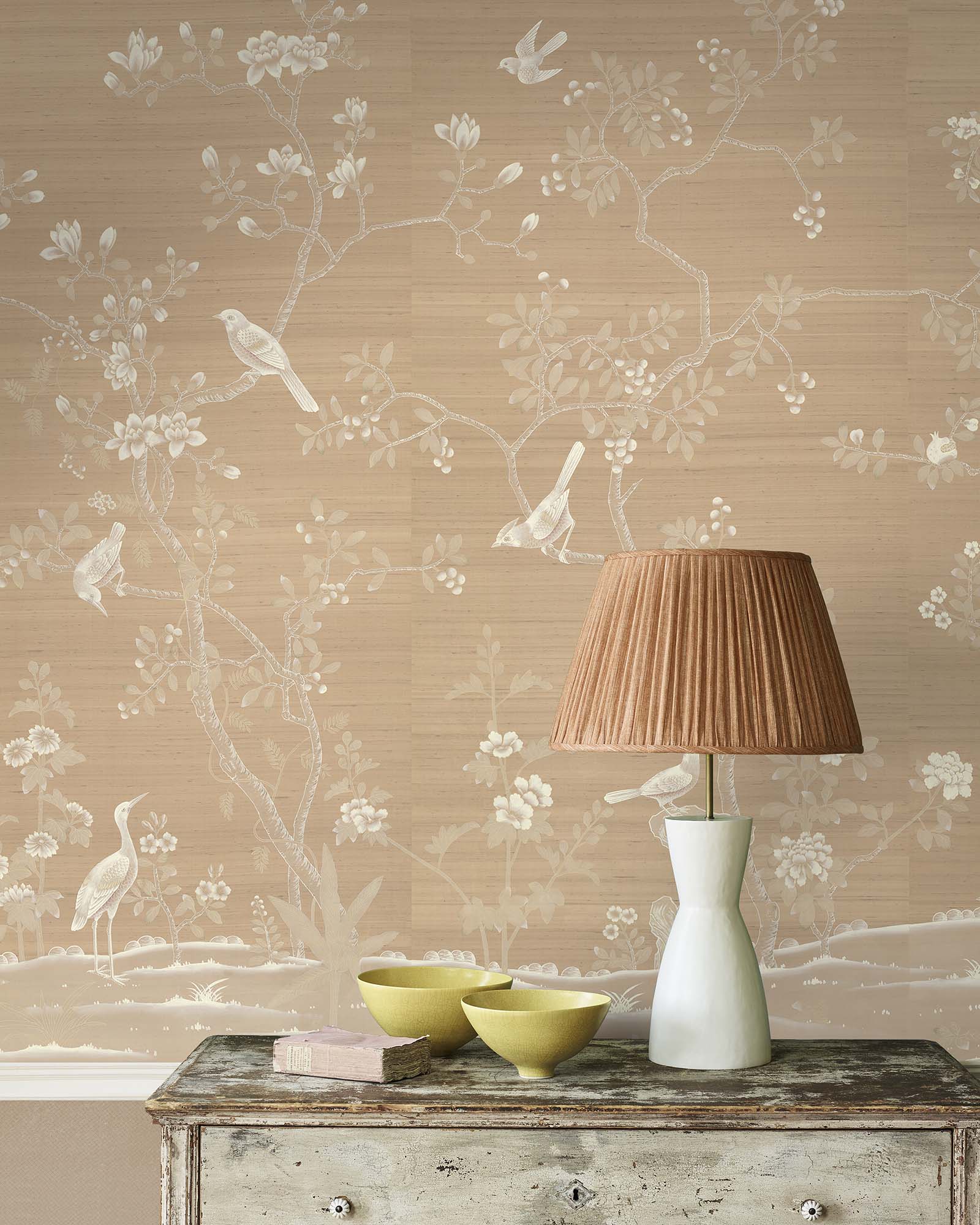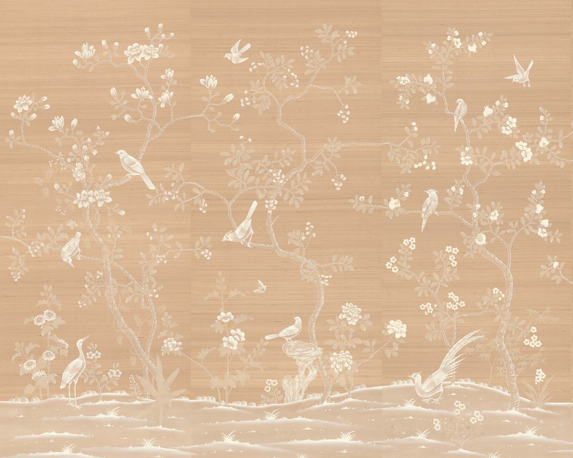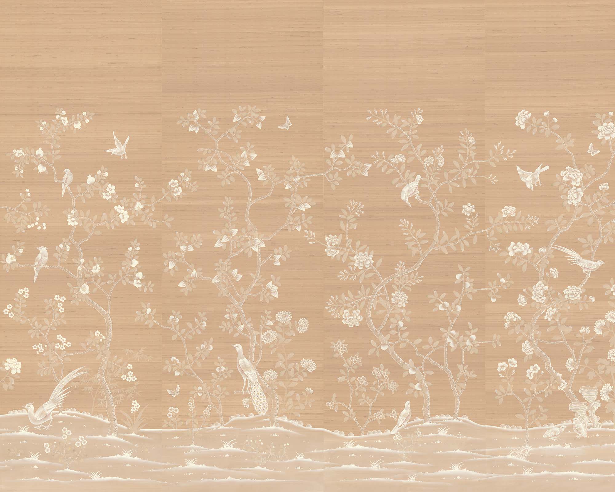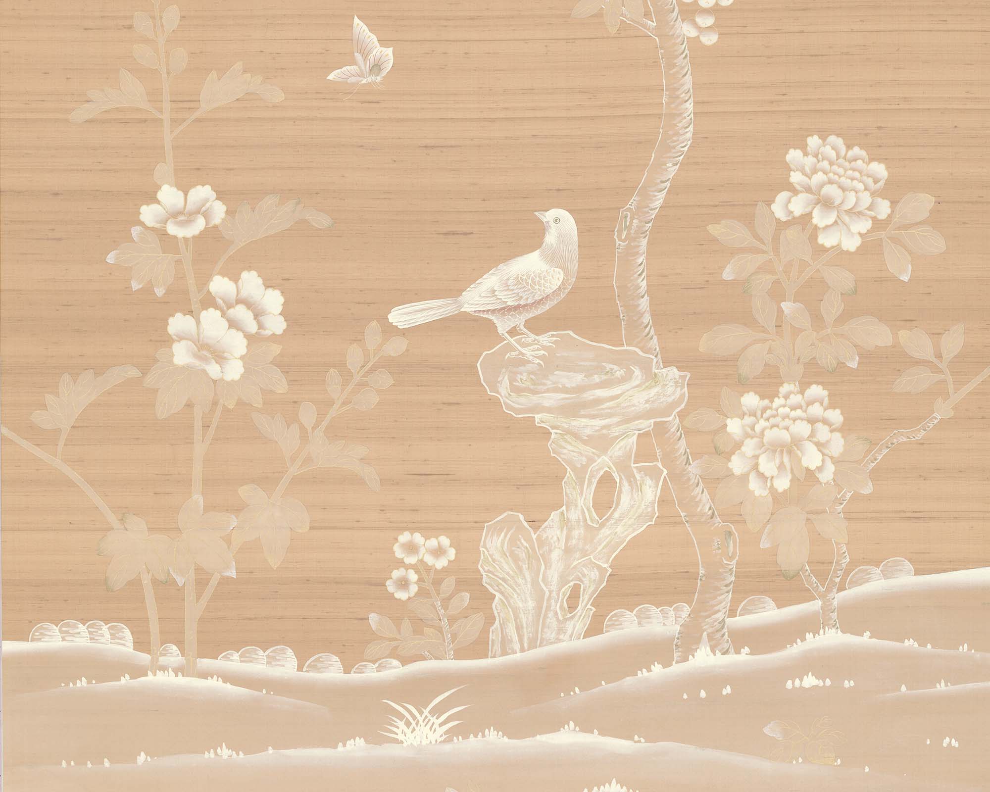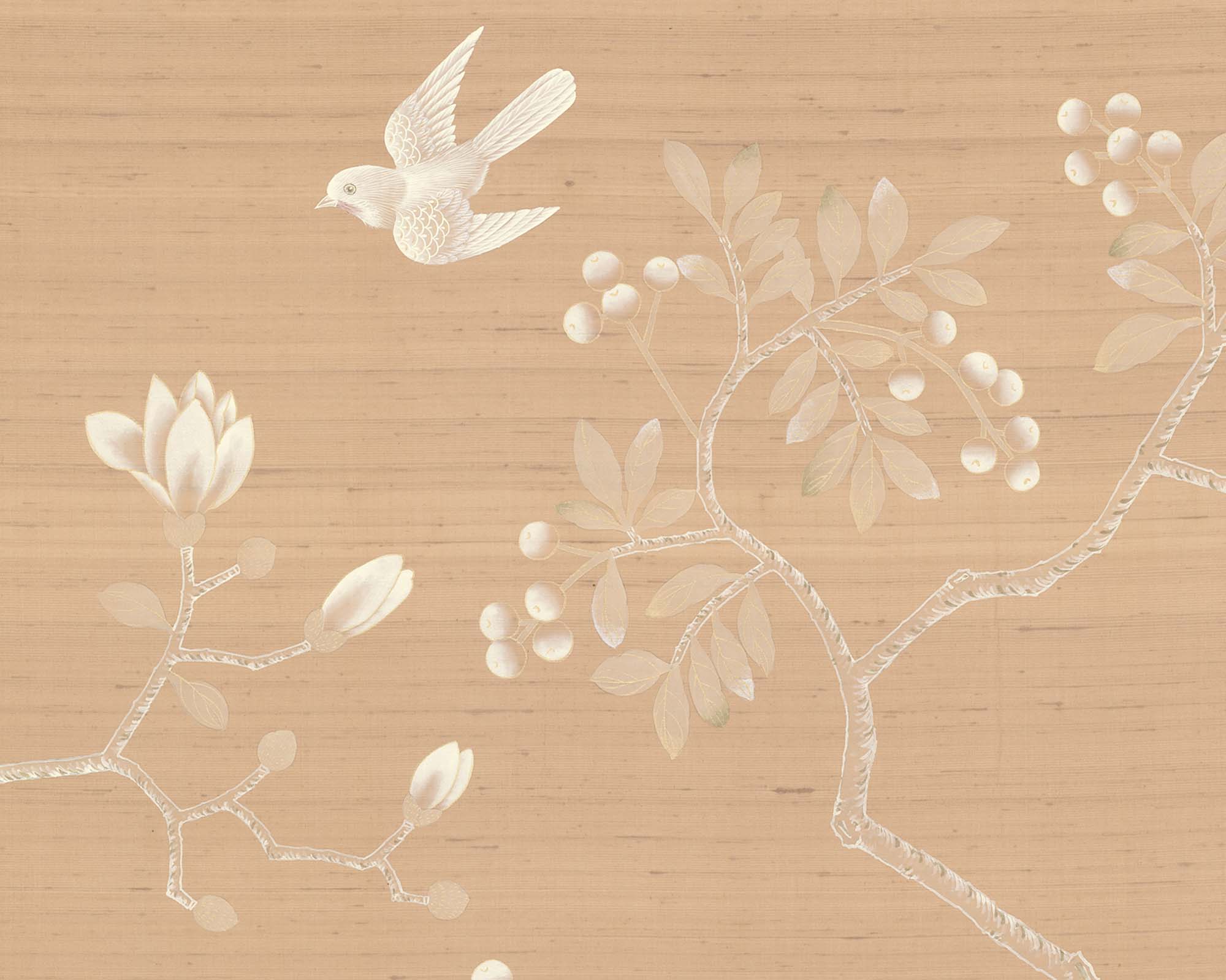 Each painted panel begins its life as a length of raw silk which we size with a natural adhesive so that it receives paint without bleeding. We often brush the silk with iridescent pearl washes to add further lustre before backing with traditional rice paper. This forms the extraordinary canvas on which our artists work their magic.