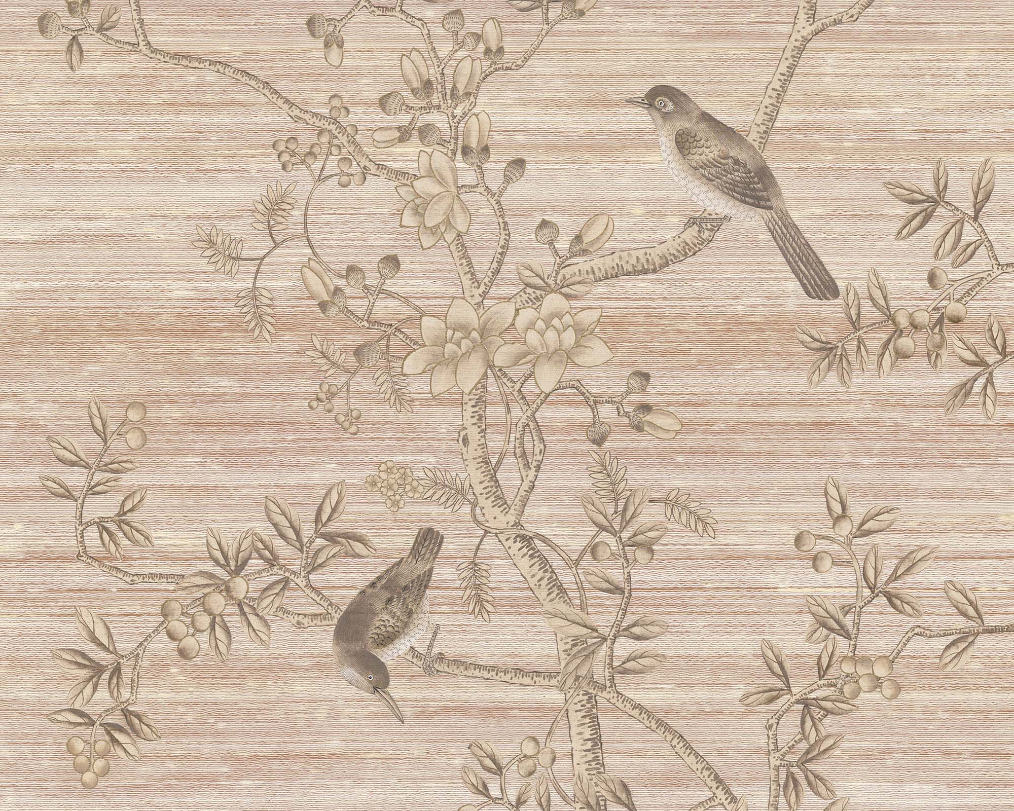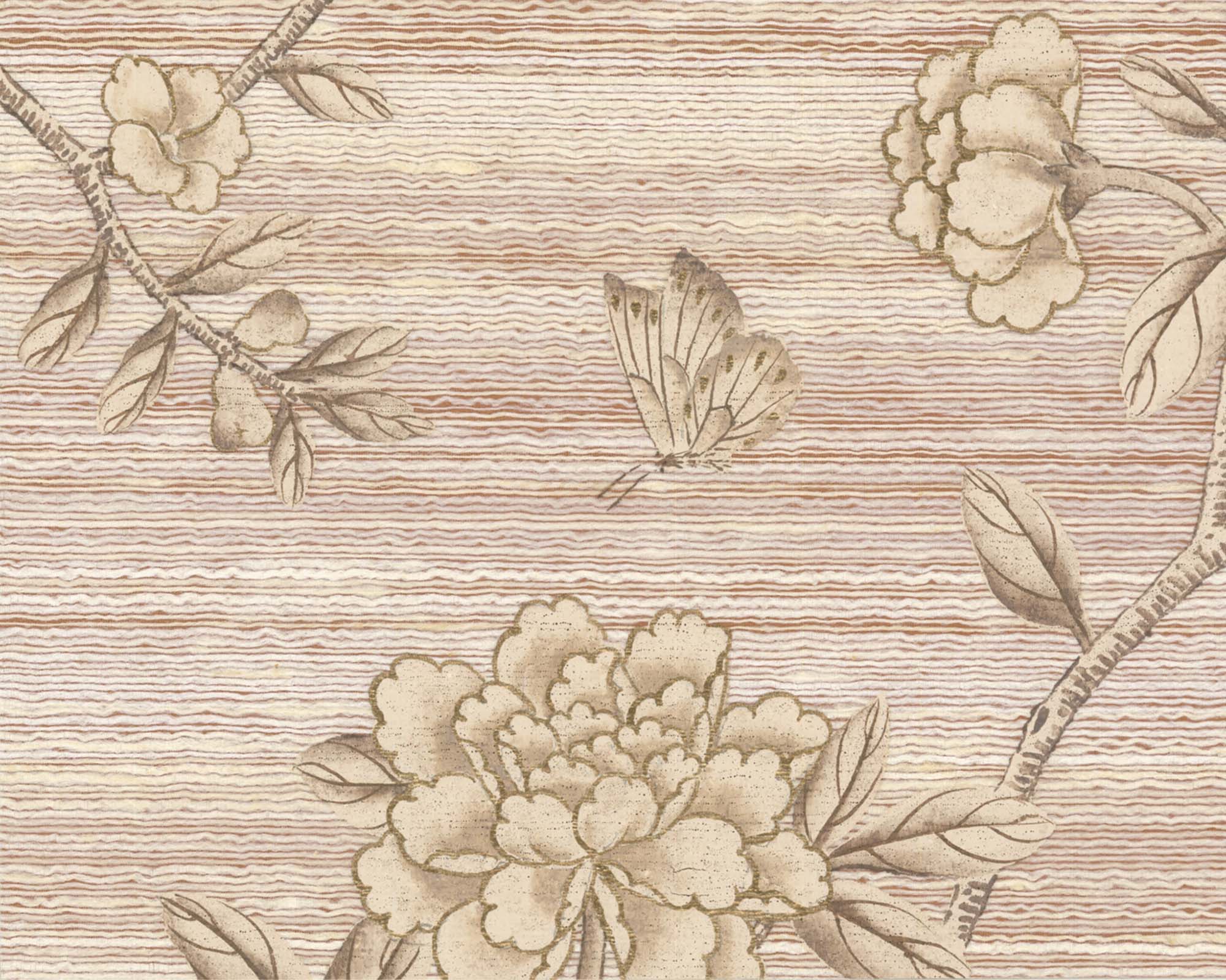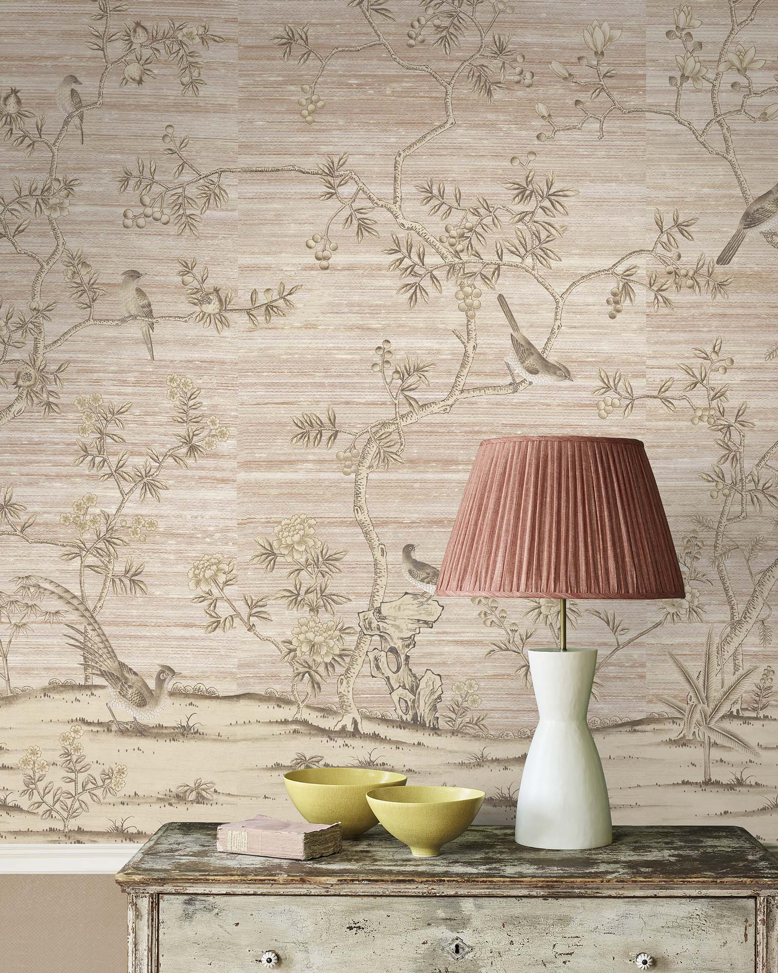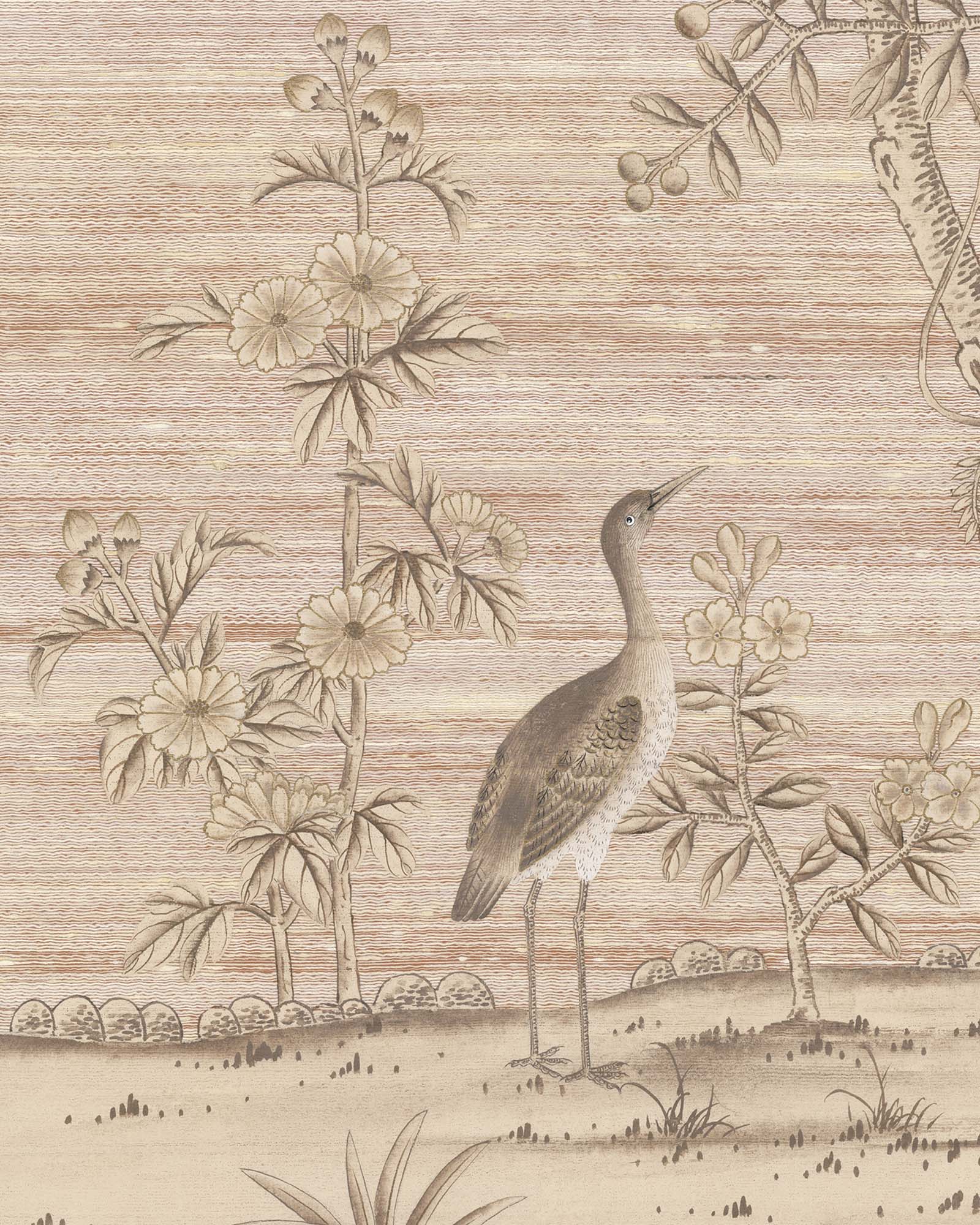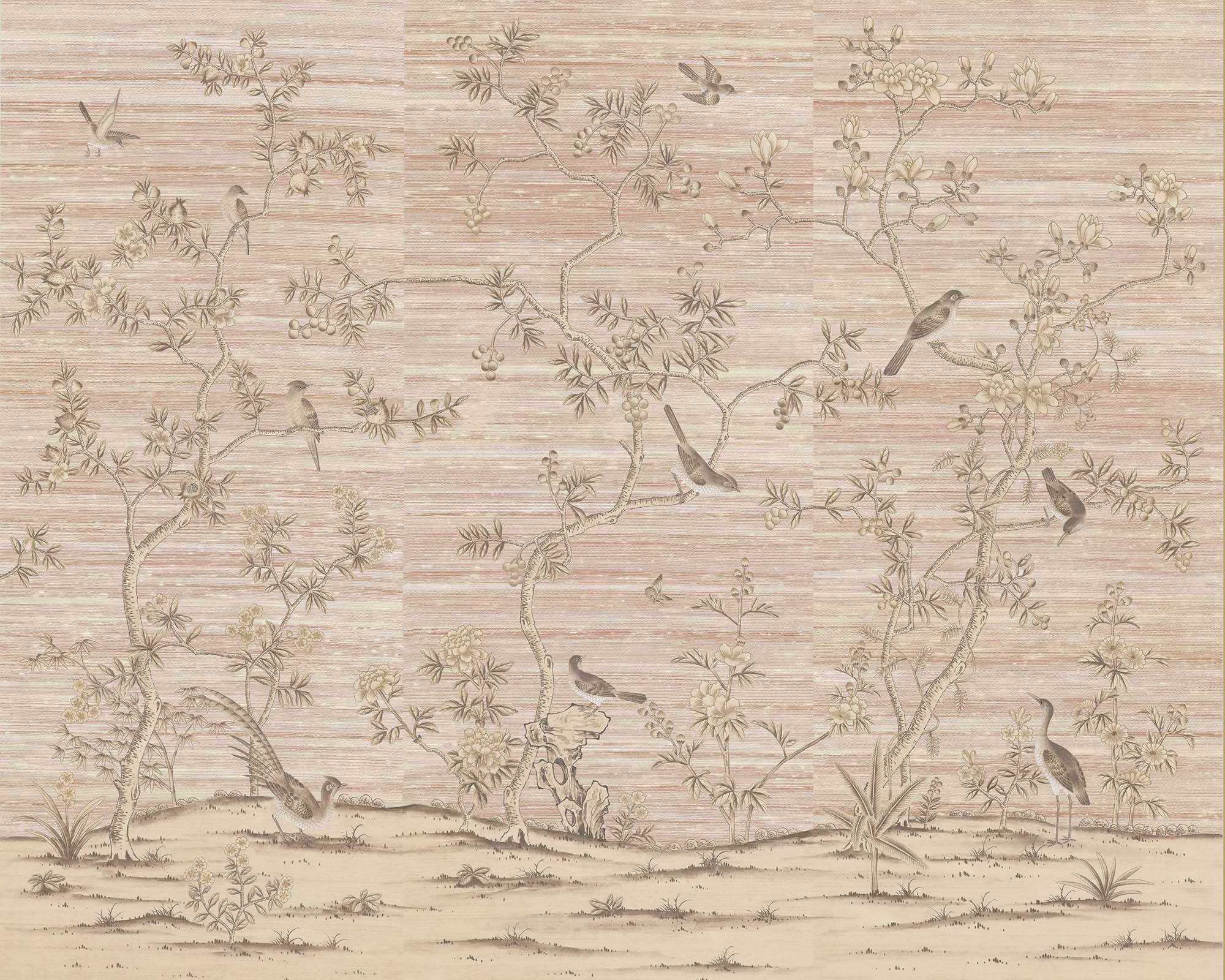 Moonstone Beach presents bright white branches and peonies winding gracefully across a dusky pink-terracotta silk ground. Soft metallic accents highlight key design elements, enriching the textural surface with a subtle luminous glow.