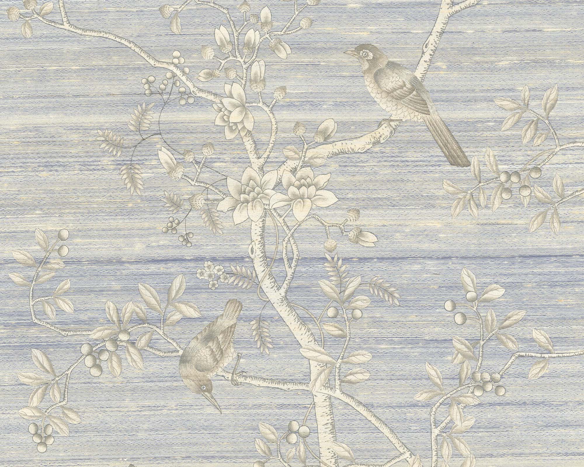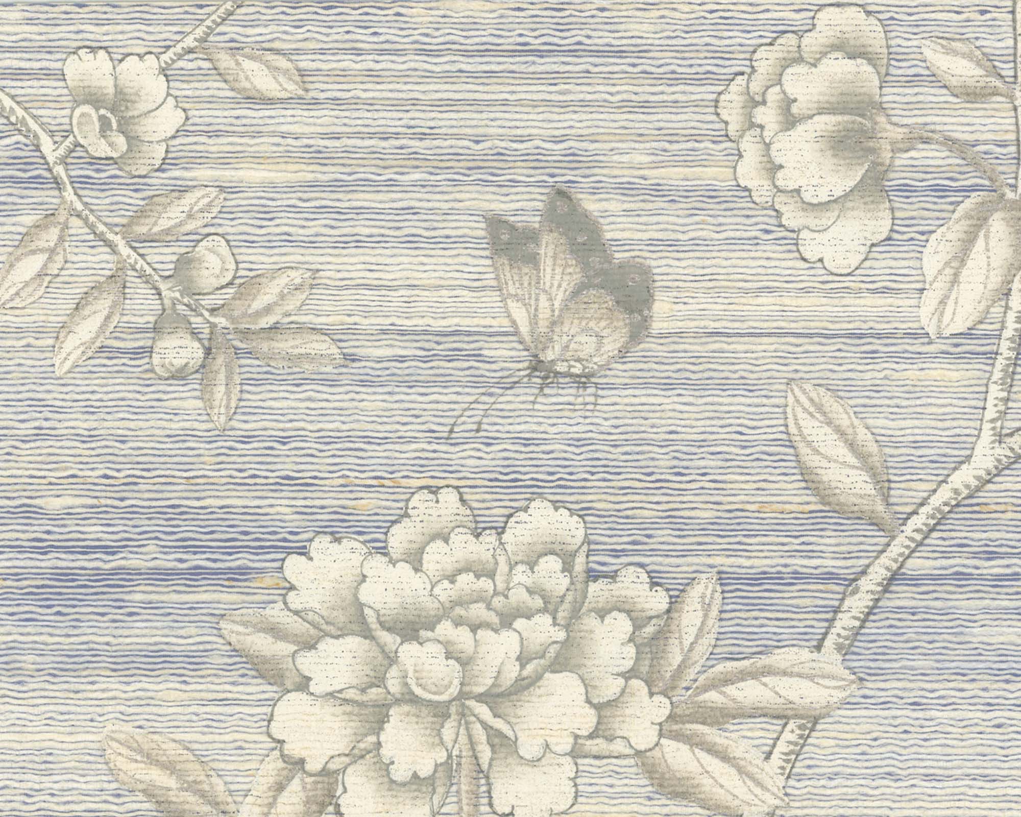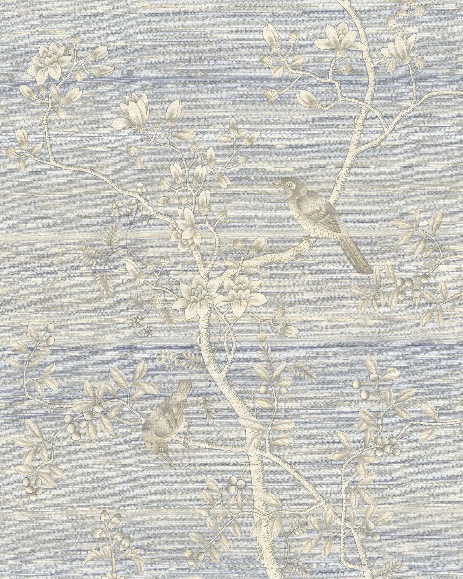 Nantucket Sky features crisp white branches and peonies, elegantly climbing across a textural raw silk ground. Delicate silver metallic accents highlight key design elements, perfectly complementing its tactile surface to create a refined and timeless wallcovering.