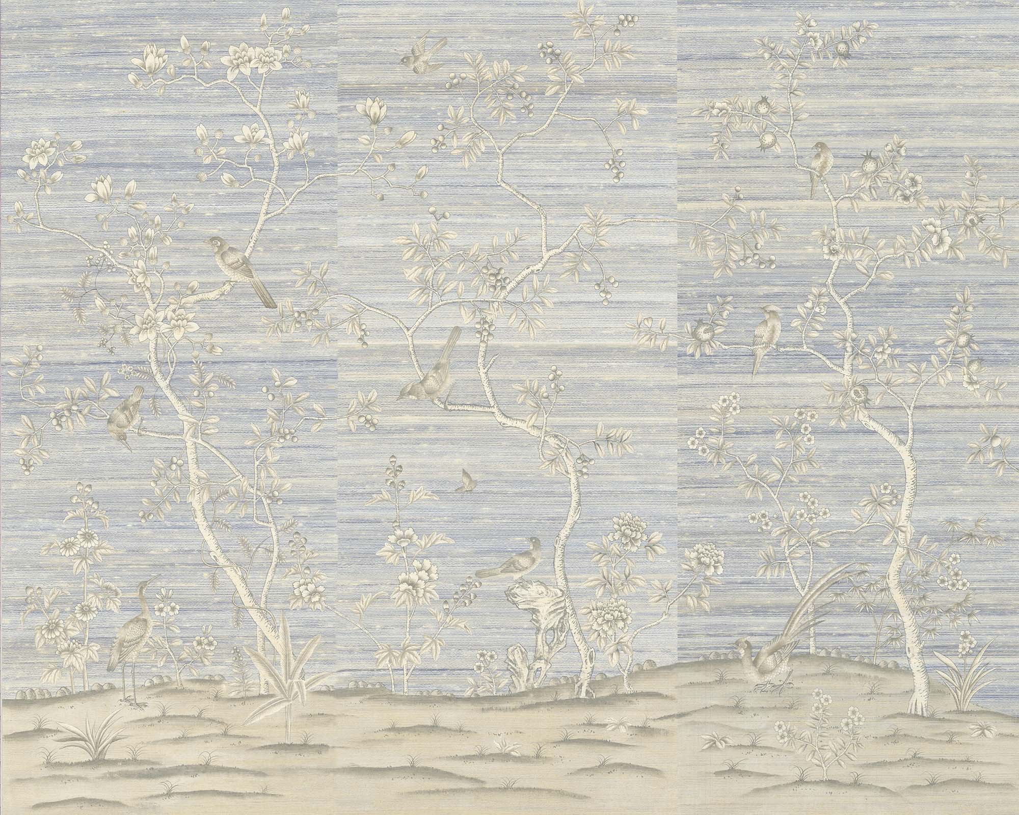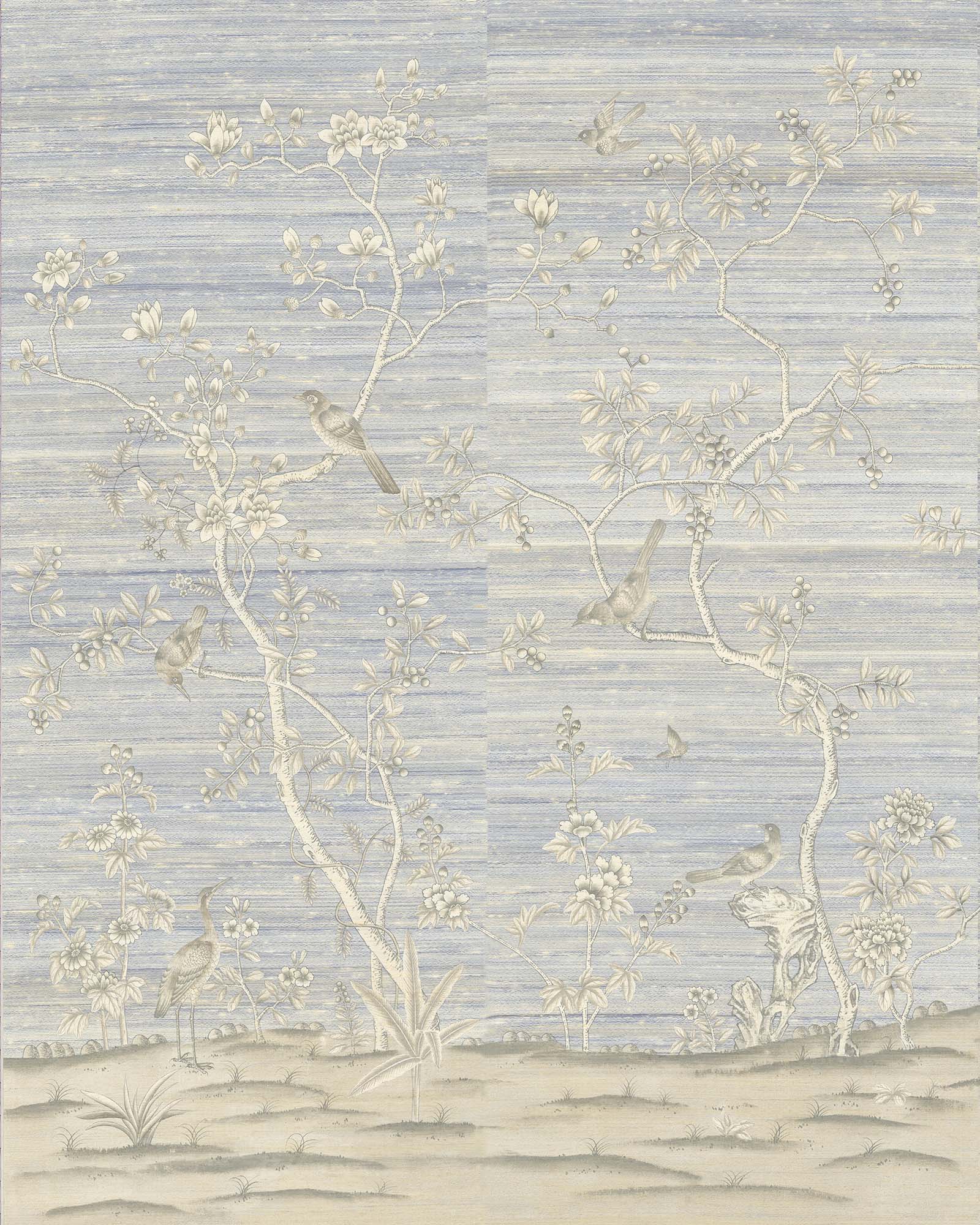 Each painted panel begins its life as a length of raw silk which we size with a natural adhesive so that it receives paint without bleeding. We often brush the silk with iridescent pearl washes to add further lustre before backing with traditional rice paper. This forms the extraordinary canvas on which our artists work their magic.
