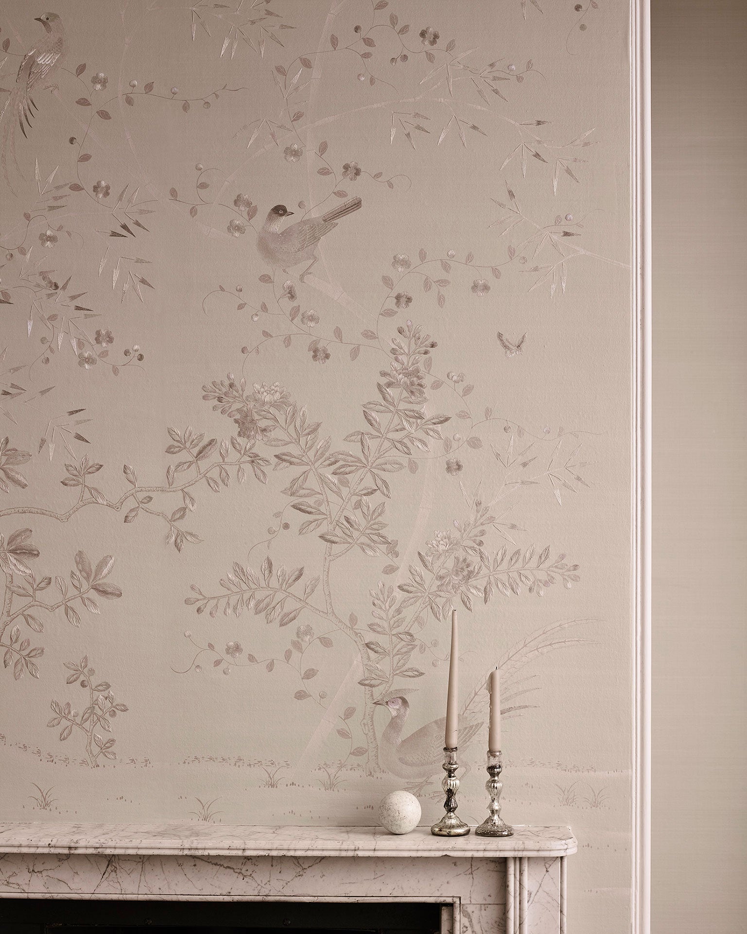Each painted panel begins its life as a length of raw silk which we size with a natural adhesive so that it receives paint without bleeding. We often brush the silk with iridescent pearl washes to add further lustre before backing with traditional rice paper. This forms the extraordinary canvas on which our artists work their magic.