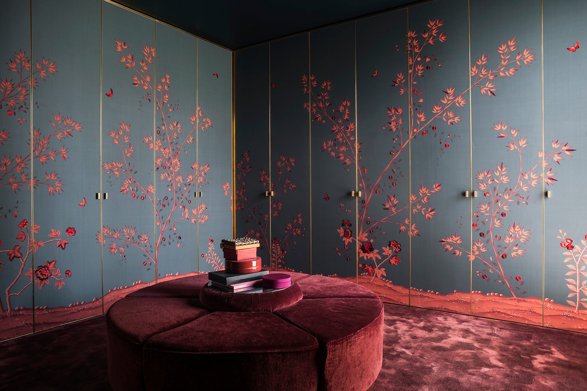 Our traditional Stellar Silk provides a dark blue base colour, an arresting backdrop for the deep red shades showcased in the bamboo and other flora.