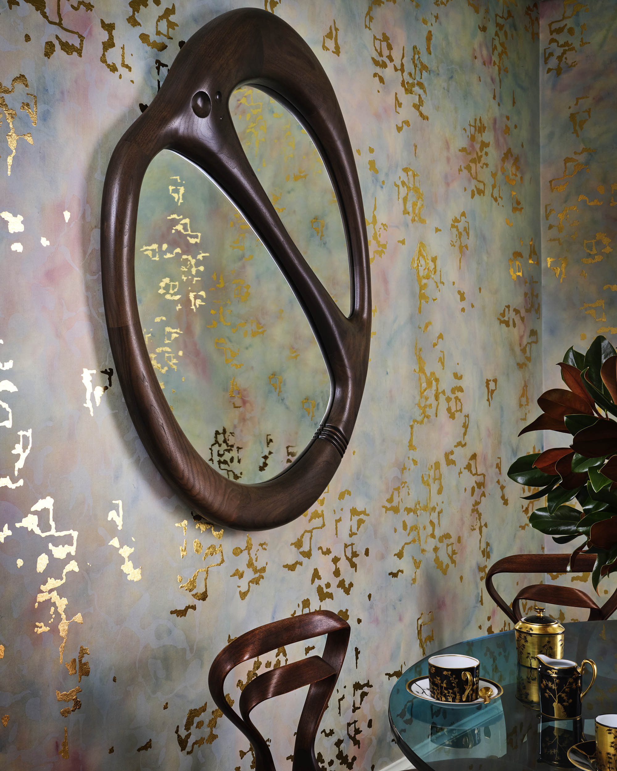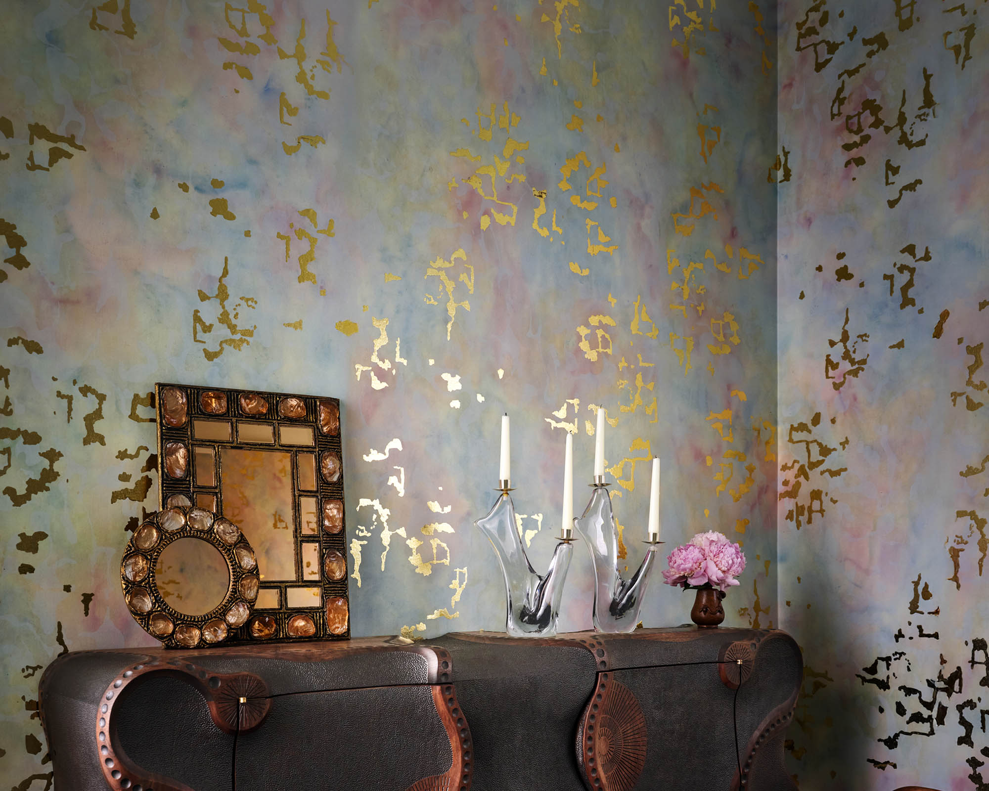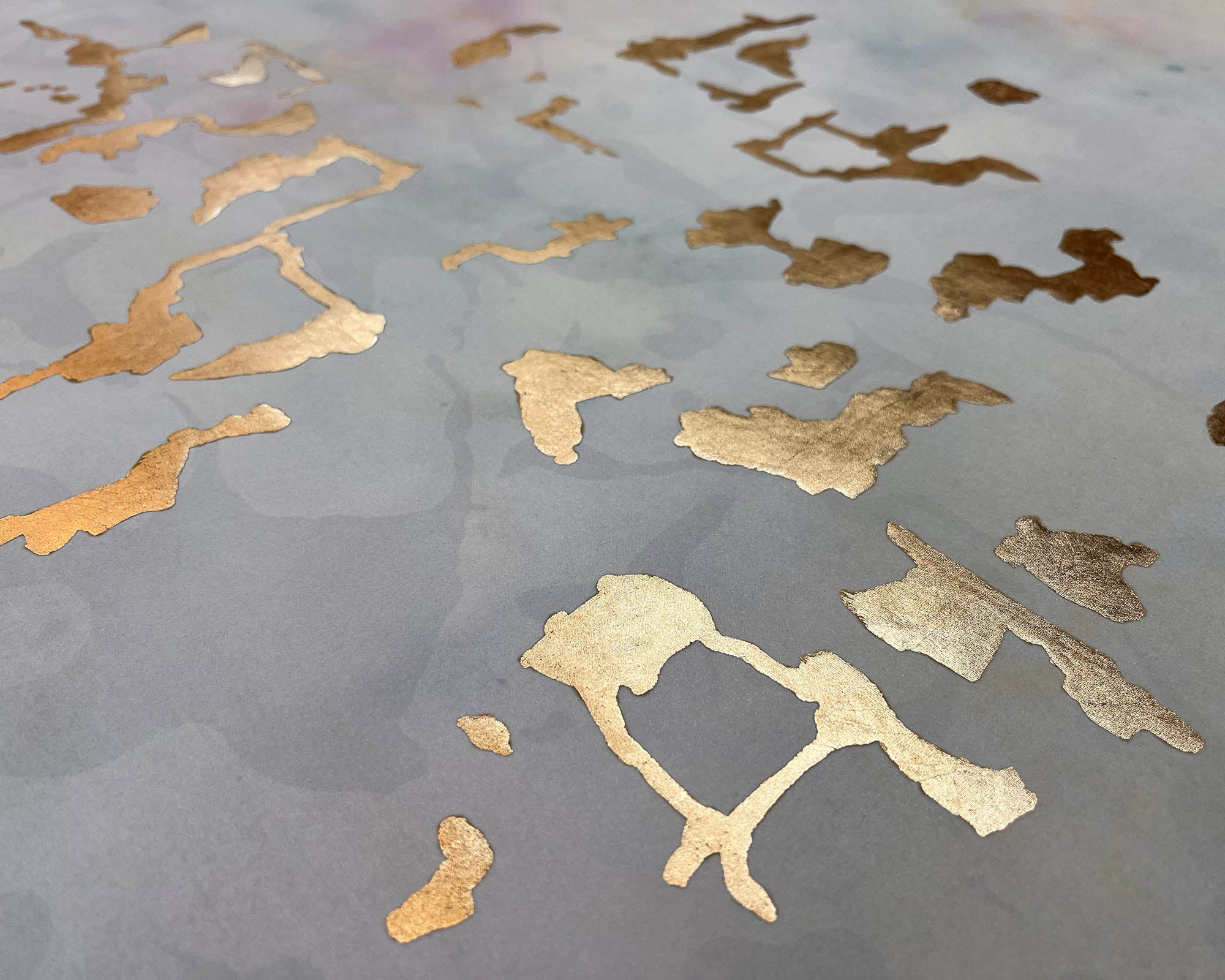 Brillantopal is a painterly veil of turquoise and lavender on white silk, inspired by the iridescent palette of Loetz glass. The nacreous canvas is inscribed with gilded metal leaf markings that appear to flutter when light is illuminates its surface.
