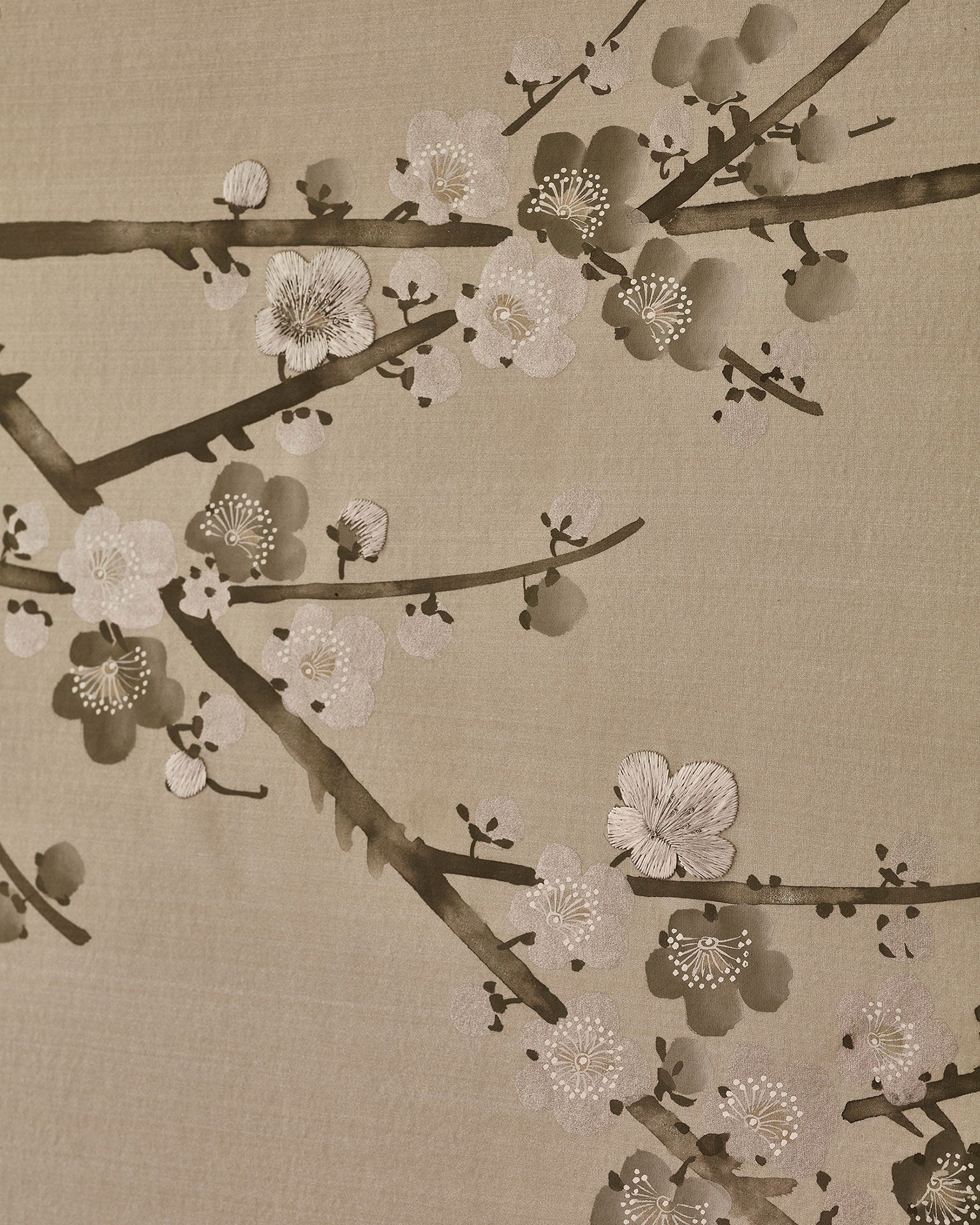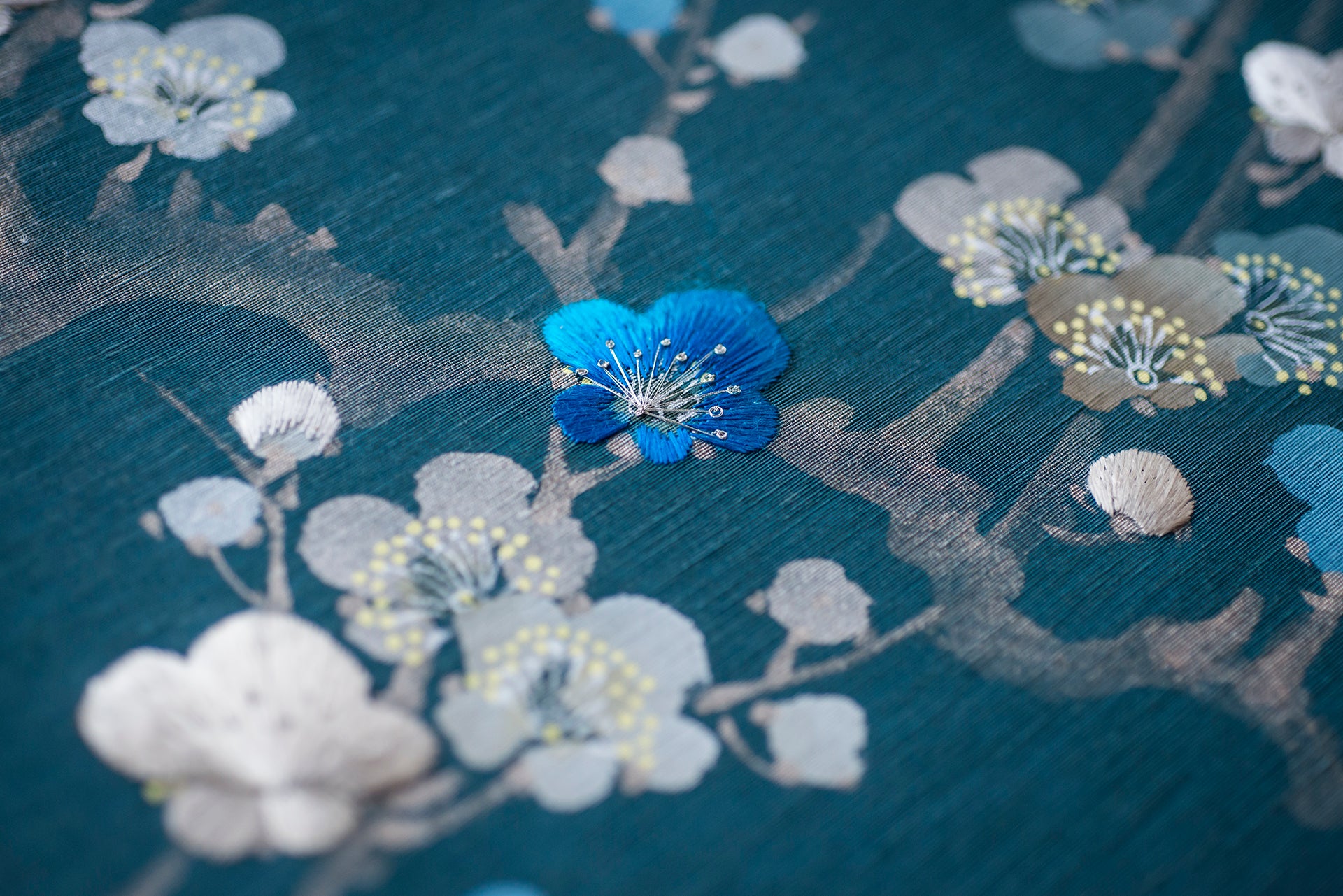Prunus draws on the rich history of traditional plum blossom painting. A combination of our ‘unconscious’ painting style – which uses graceful, gestural brushstrokes – and the dazzling lustre of the hand-embroidered silk thread gives it an otherworldly beauty.