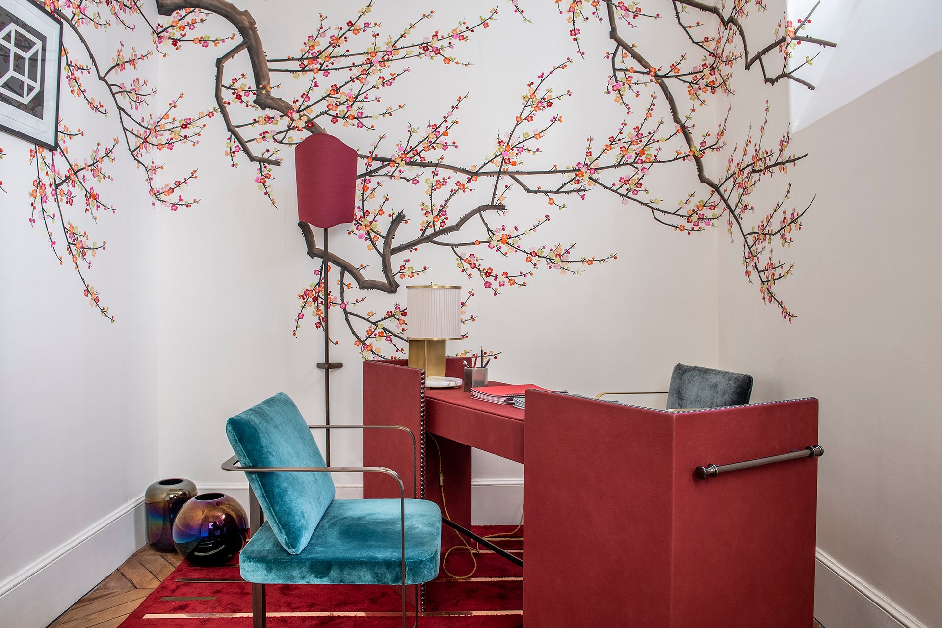 Rich, dark branches contrast dramatically with a background of plain white silk, while bright blossoms in pinks, reds and greens lend a uniquely playful feel.