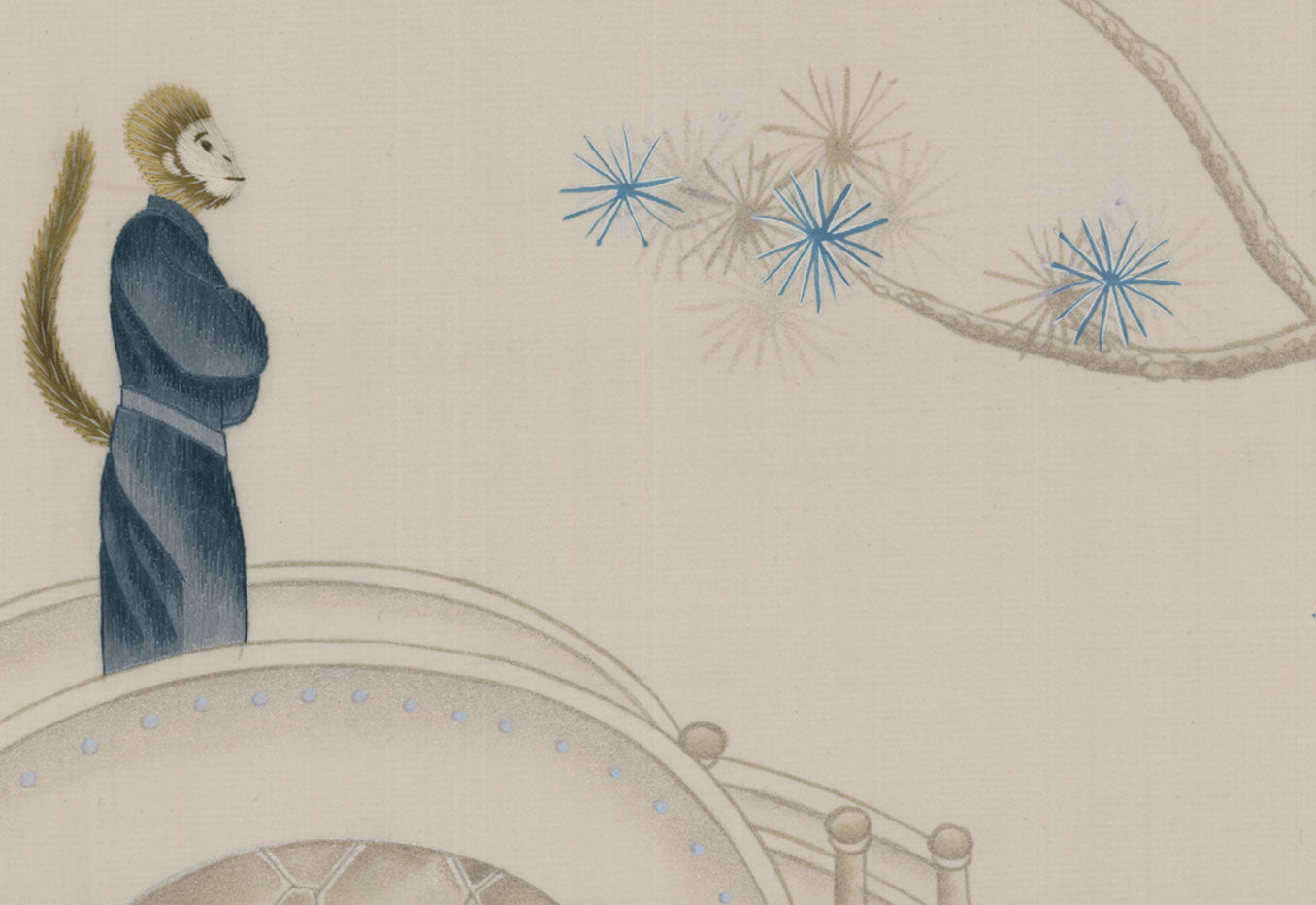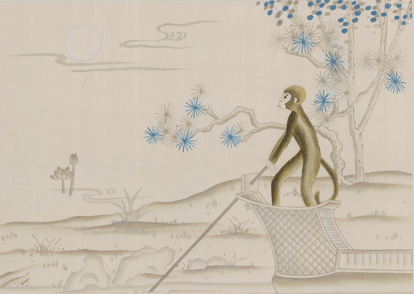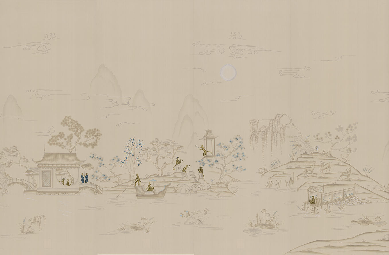 Vervet is a light and airy, modern colourway with a moonlight silk ground, hand-painted in shades of platinum with flourishes of striking blue. The delicate hand-embroidered monkeys exhibit the skill of our skilled embroiderers.