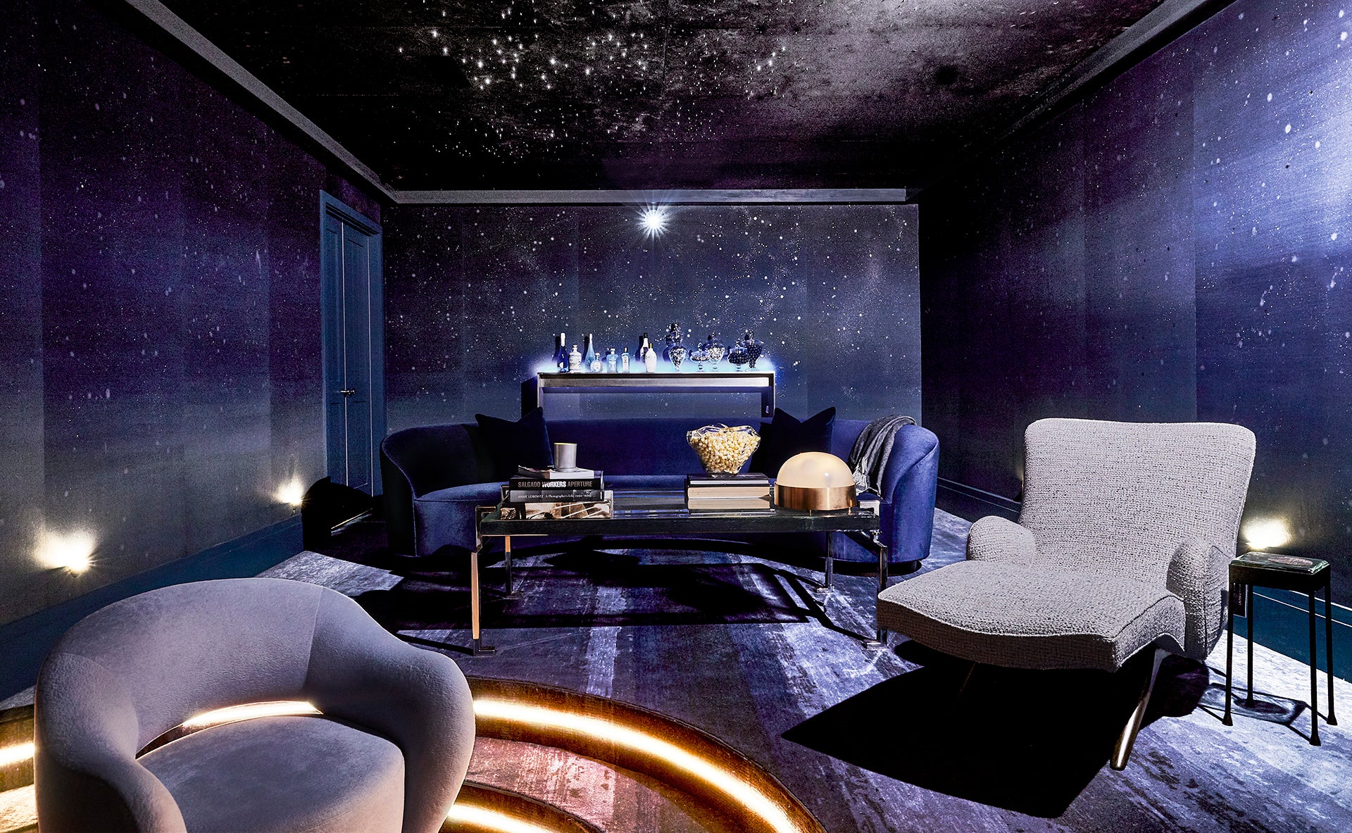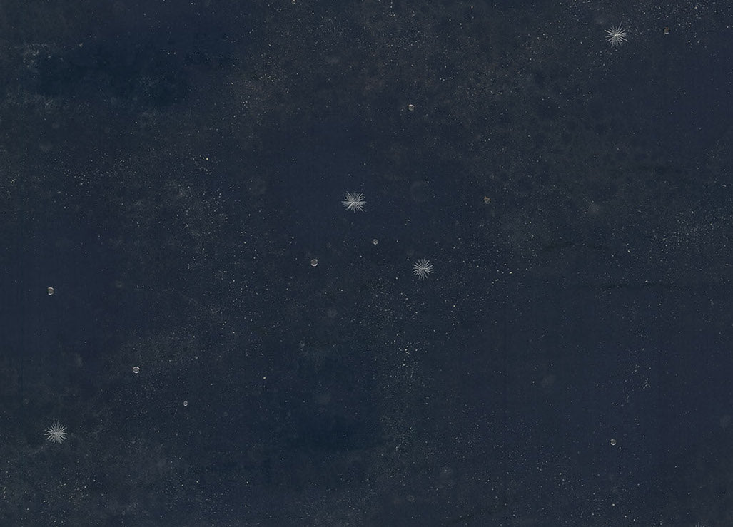 Embroidered metallic stars twinkle across a paint-pooled Indigo silk canvas. A series of painted layers are built up; pearlescent and copper of washes adorned with metallic highlights (stars).